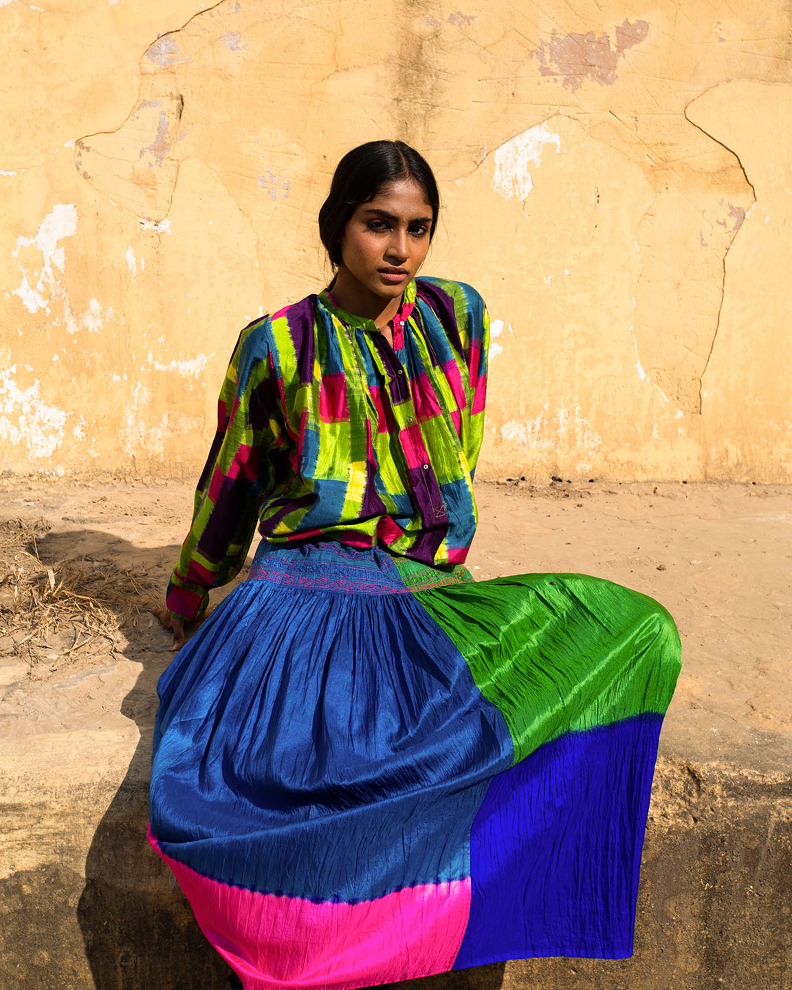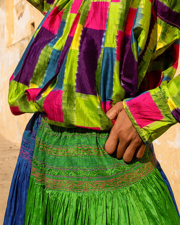 Narsara Skirt made using the clamp-dye technique, featuring colorblocked panels in royal blue, lush green, and fuchsia. The fluid silk fabric has a voluminous, gathered silhouette, and the waistband is accented with tagai embroidery for a subtle traditional touch.