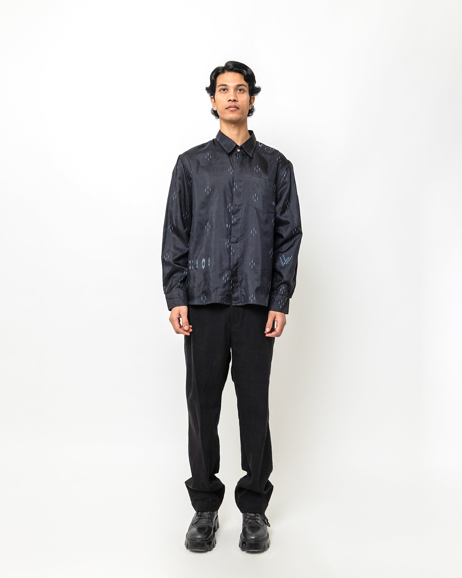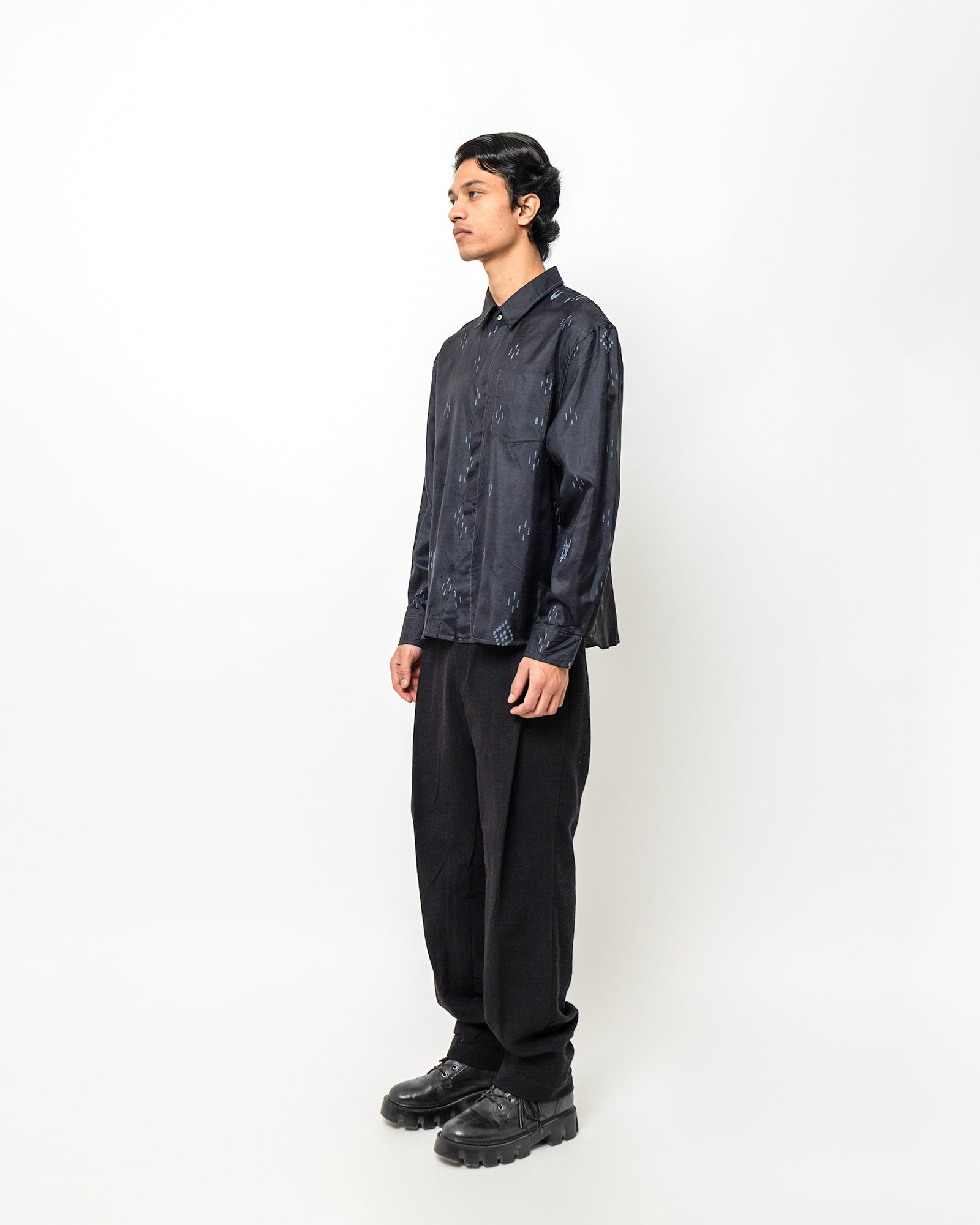 The Nayak Trousers crafted in handwoven cotton from Gujarat. Designed in a tapered, gently tailored silhouette, they feature soft front pleats, a structured waistband with button-and-fly closure, and functional side pockets. The woven texture gives the deep black fabric a subtle richness, making them an easy, refined everyday trouser—versatile for both relaxed and formal dressing