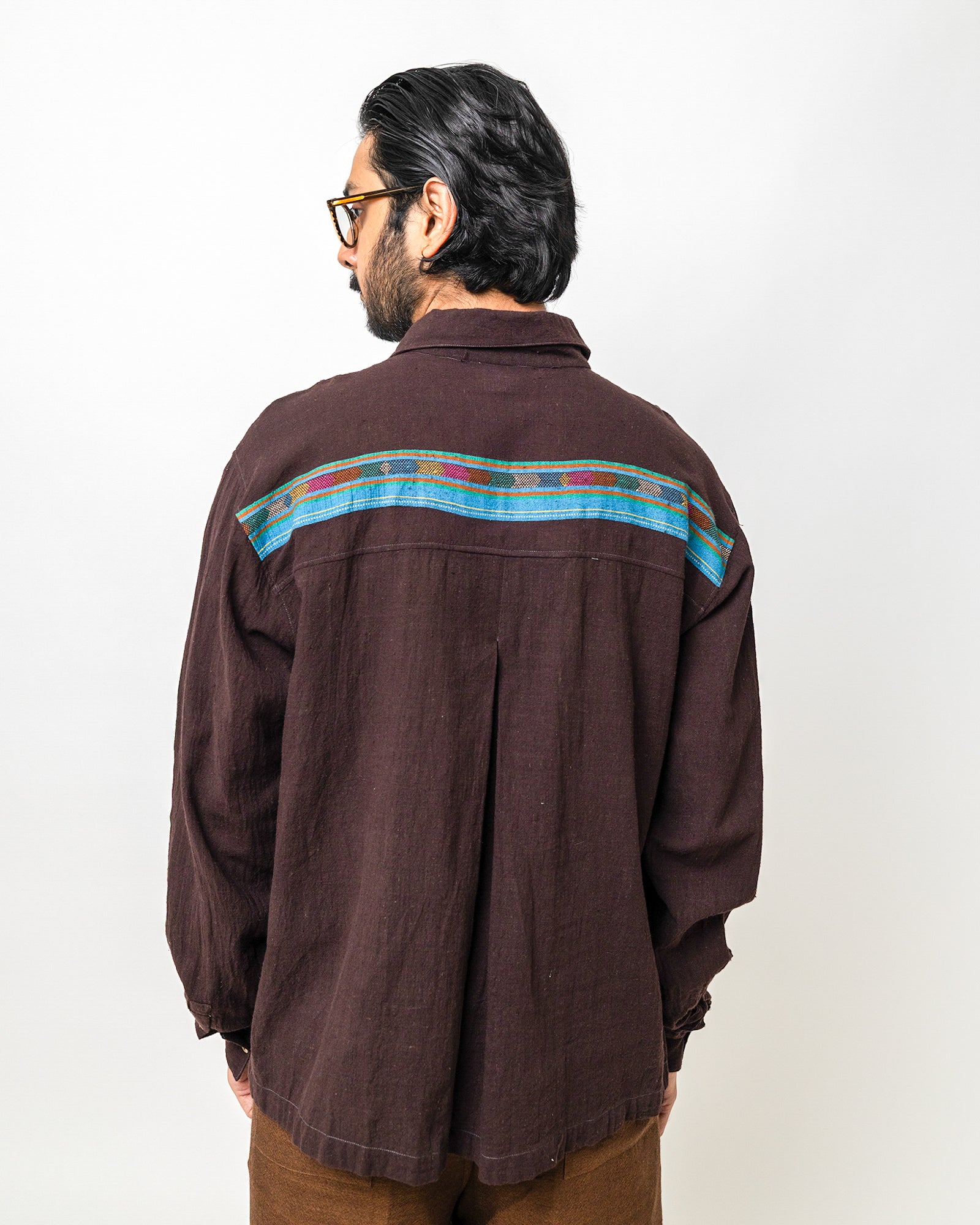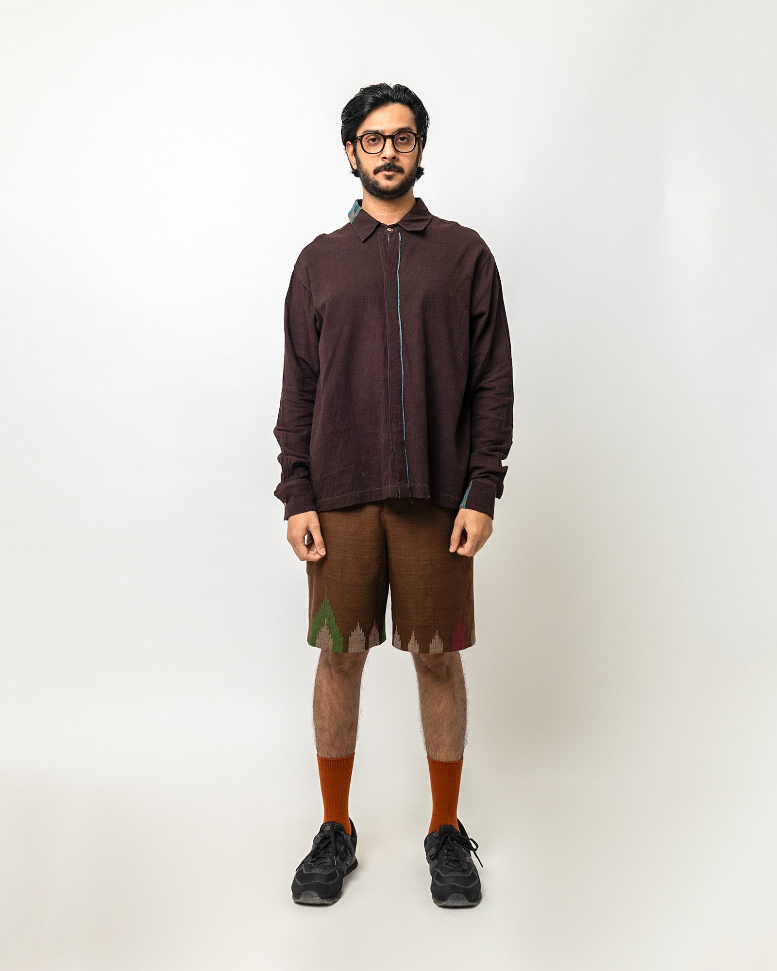 The Nayan Shirt is made in handwoven Bhujodi cotton, featuring a deep charcoal base accented with a subtle selvedge detail at the collar. Lightweight yet structured, it offers a relaxed, easy fit with a clean concealed placket and classic shirt collar. The quiet texture of the Bhujodi weave lends understated character.