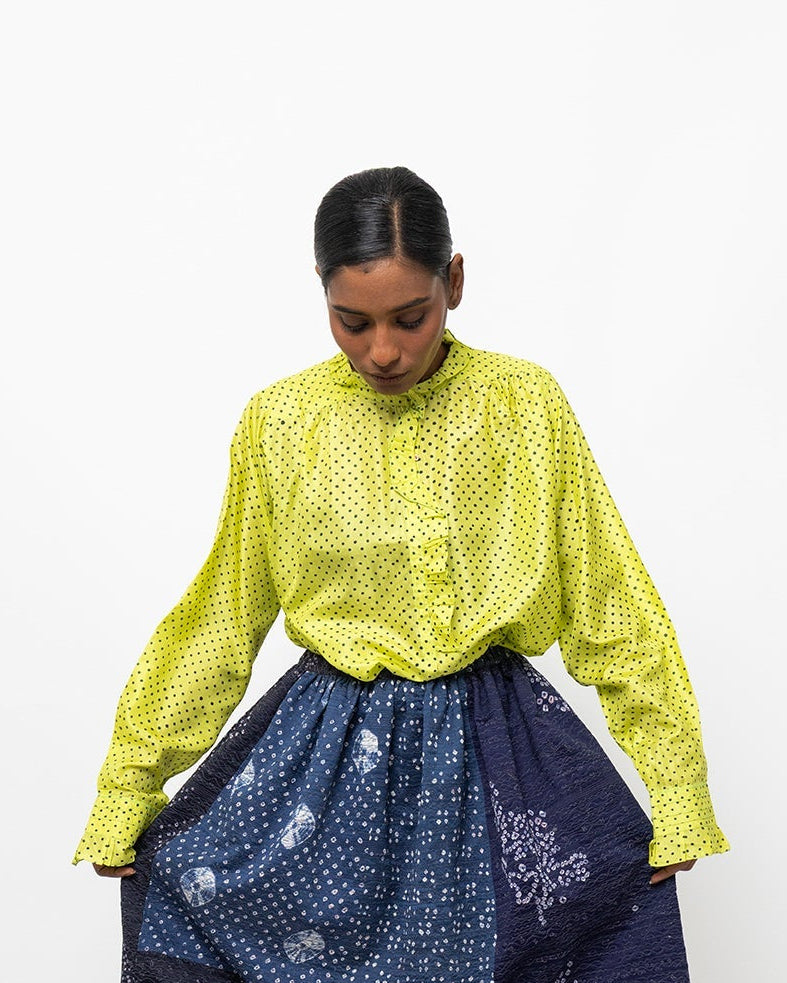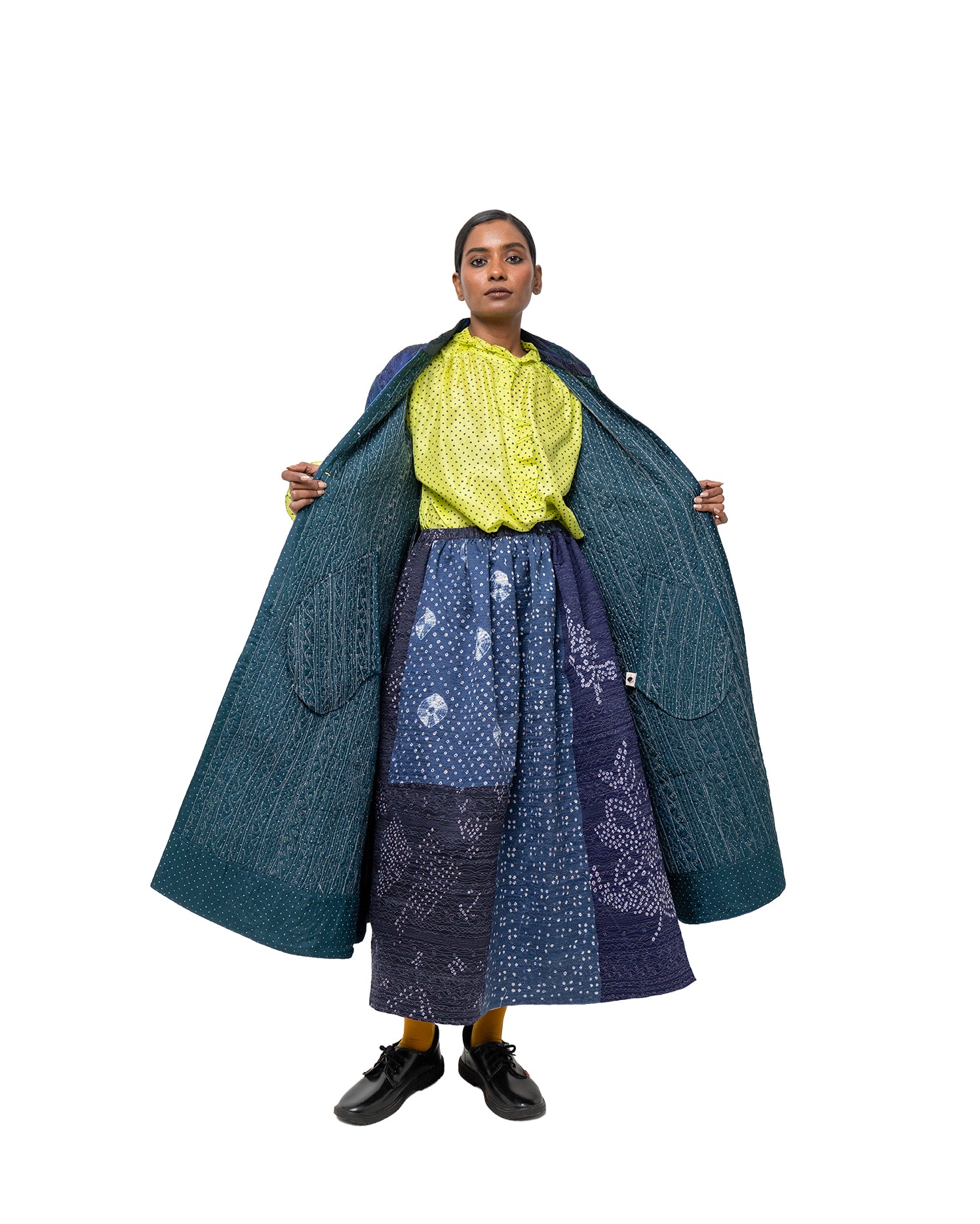 Neelika skirt in deep indigo and midnight blue silk, it is an one-of-a-kind skirt with special patch that will differ from piece to piece. Light and fluid, it is made for a relaxed, voluminous silhouette