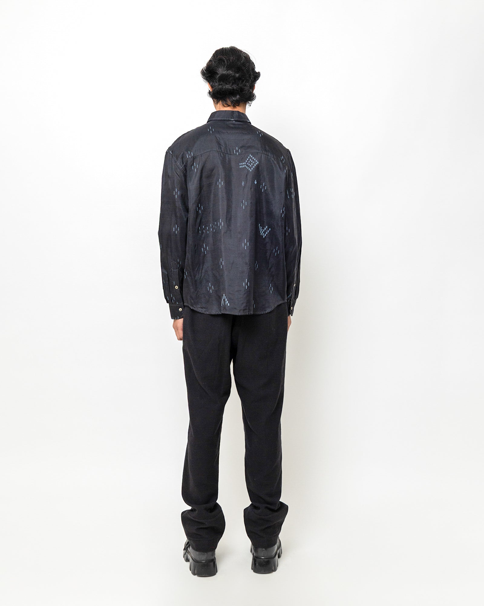 The Neer Jamdani Shirt is crafted in handwoven silk Jamdani from West Bengal. Designed with full-length sleeves and a classic shirt collar, it features subtle woven motifs on a deep midnight base. Lightweight with a soft drape, this shirt offers a refined, relaxed fit.
