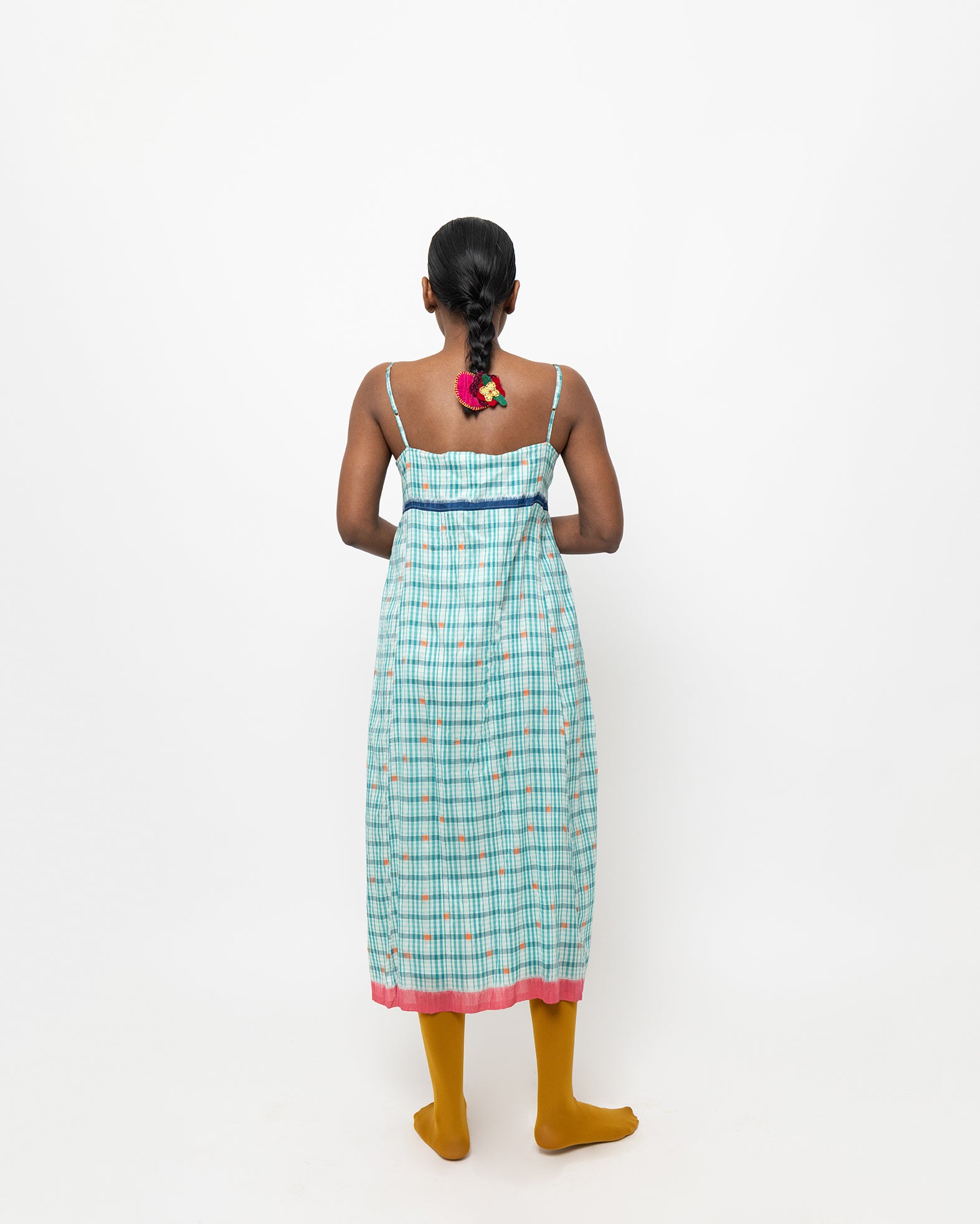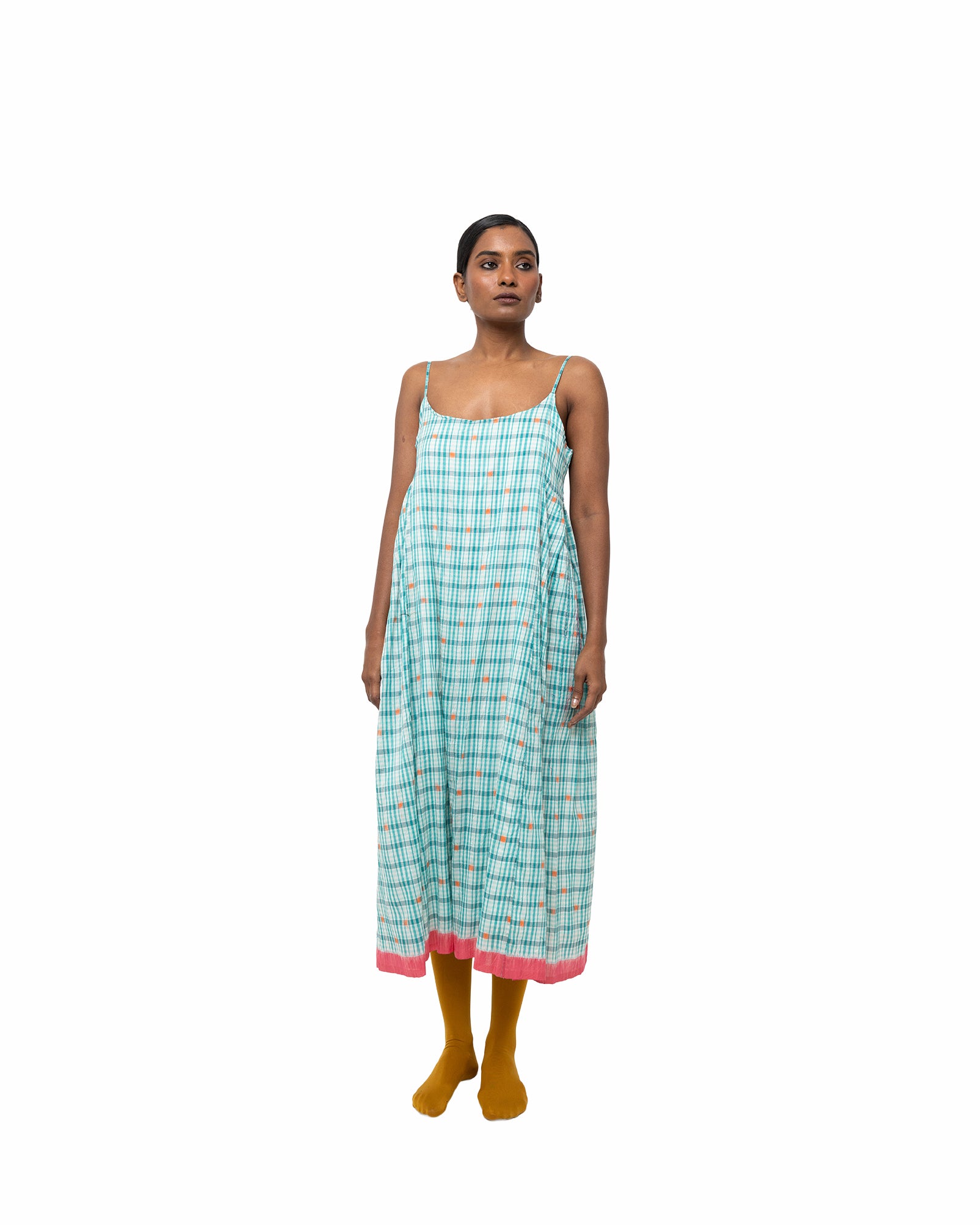 Neerja Dress in airy aqua ikkat silk. Light and fluid, it is made for an effortless fit