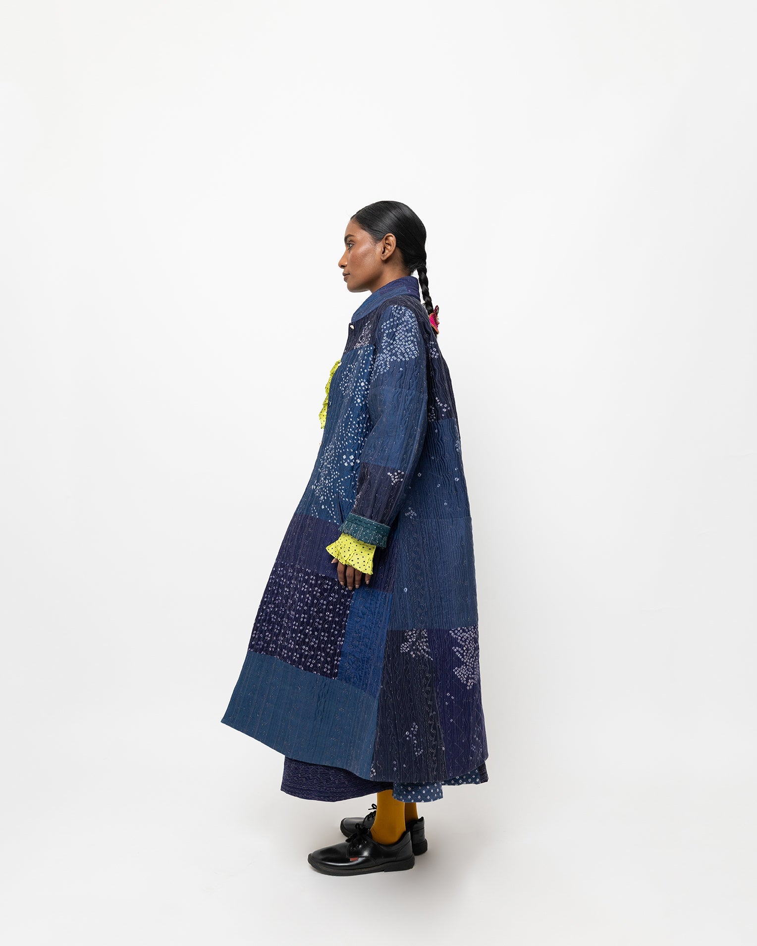 Crafted in tie-dyed silk, the Nilgiri jacket features layered indigo and deep blue tones created through a resist-dye technique. Designed with a straight silhouette and full sleeves, it is lightweight, soft, and intended for relaxed, everyday layering.