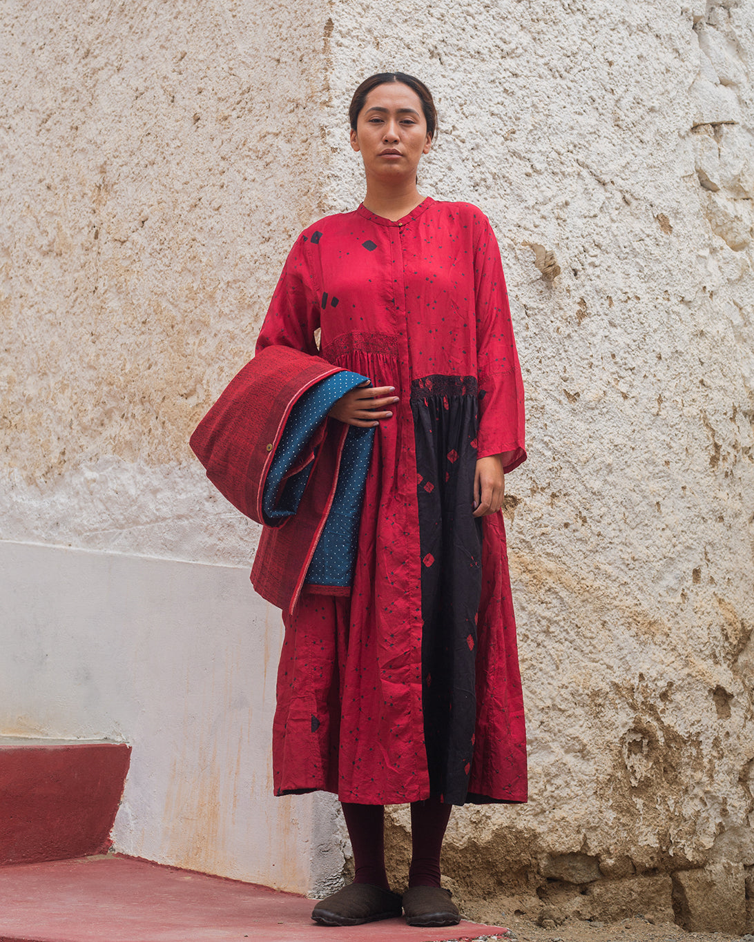 Nomad Dress in silk, featuring a bold red base with contrasting black side panels that elongate the silhouette. It has a closed neckline, gentle gathers at the waist, and a flowing A-line shape for a comfortable, flattering fit perfect for cooler fall evenings.