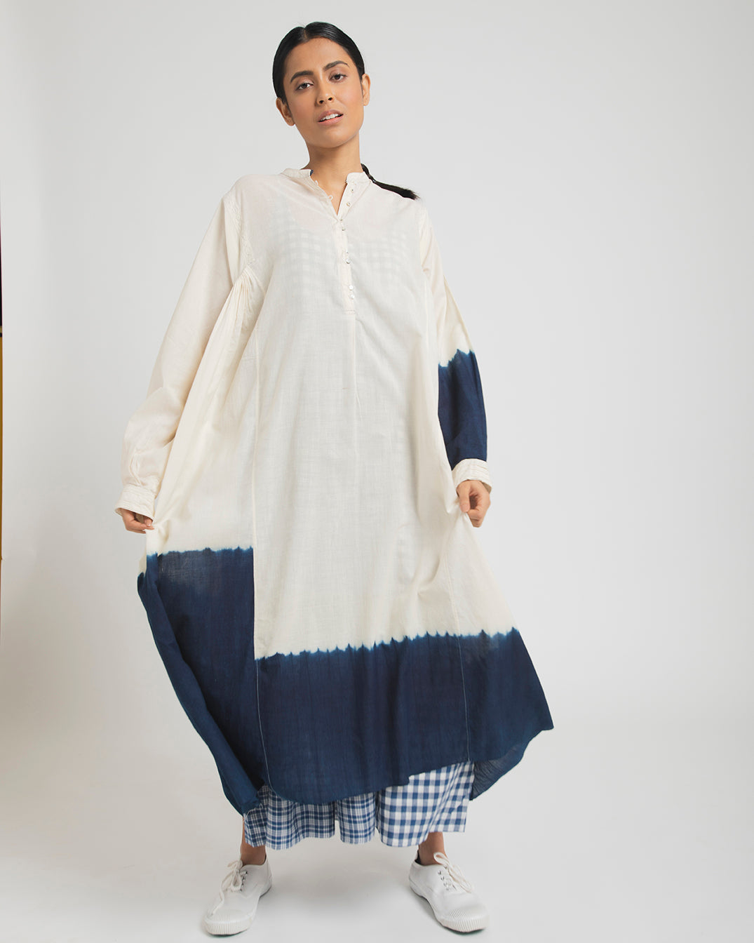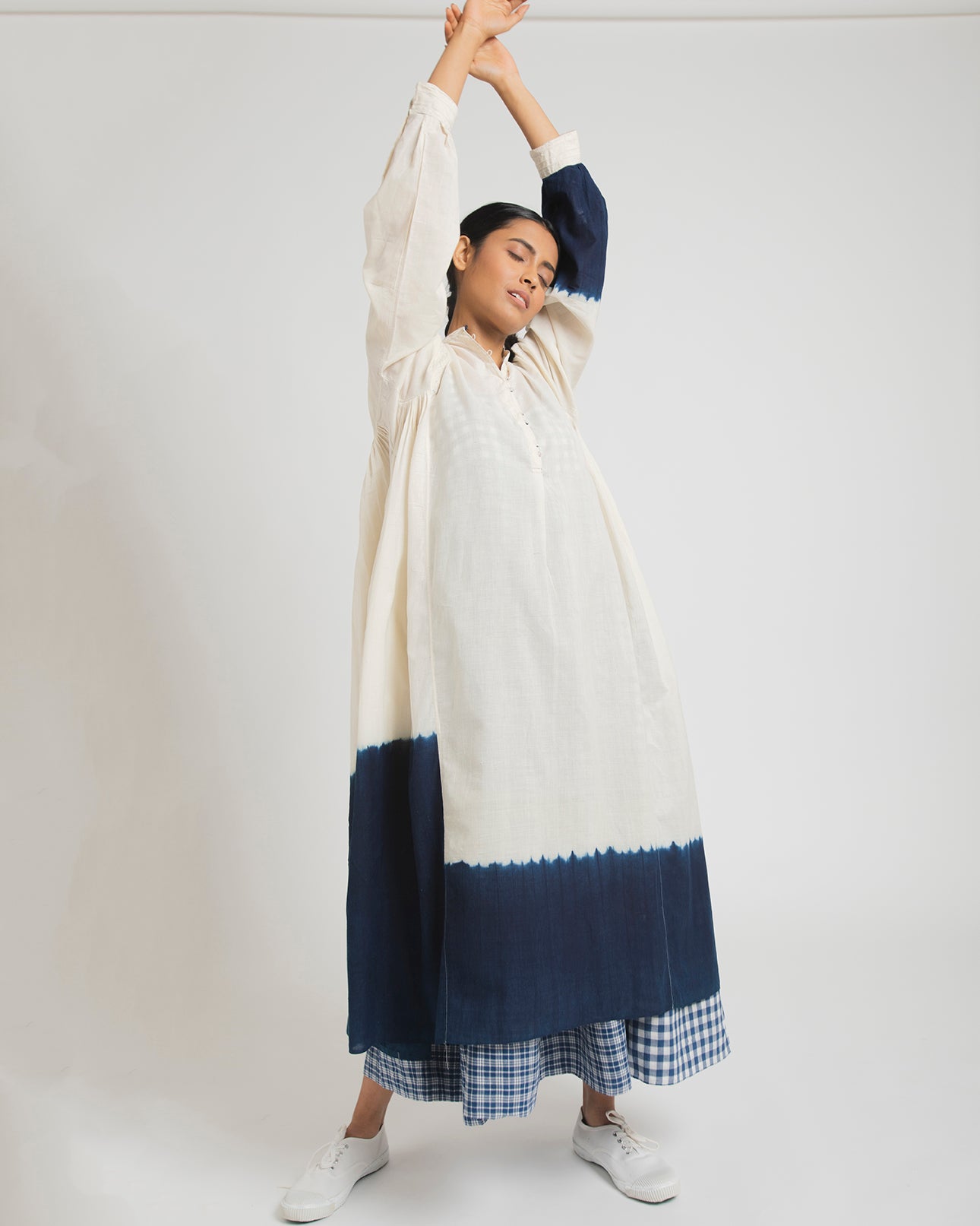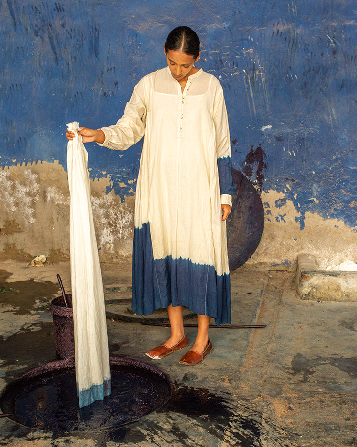 The Padma Dress , crafted in breathable handwoven cotton, features fine pleating that adds soft texture and graceful movement. A rich indigo dip-dye at the hem creates a striking gradient reminiscent of dusky evening skies. Paired with a long, minimal stole for layered styling, this tranquil set highlights the nuanced beauty of hand-dyeing techniques and artisanal precision.