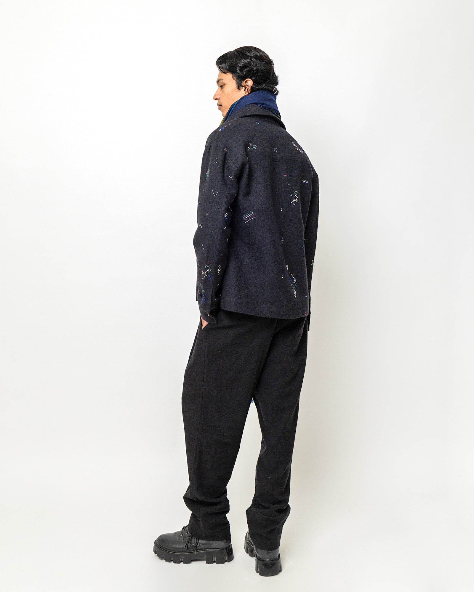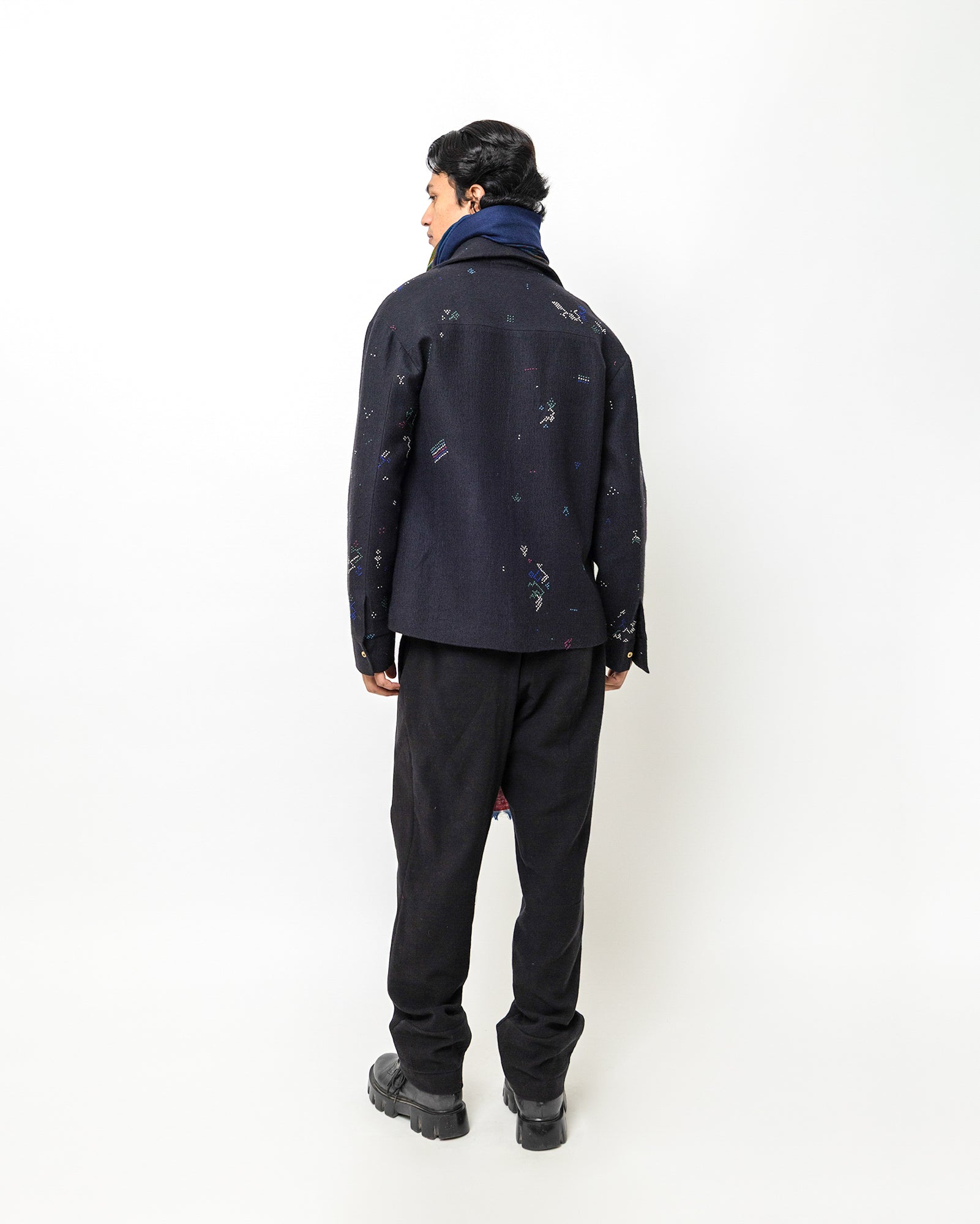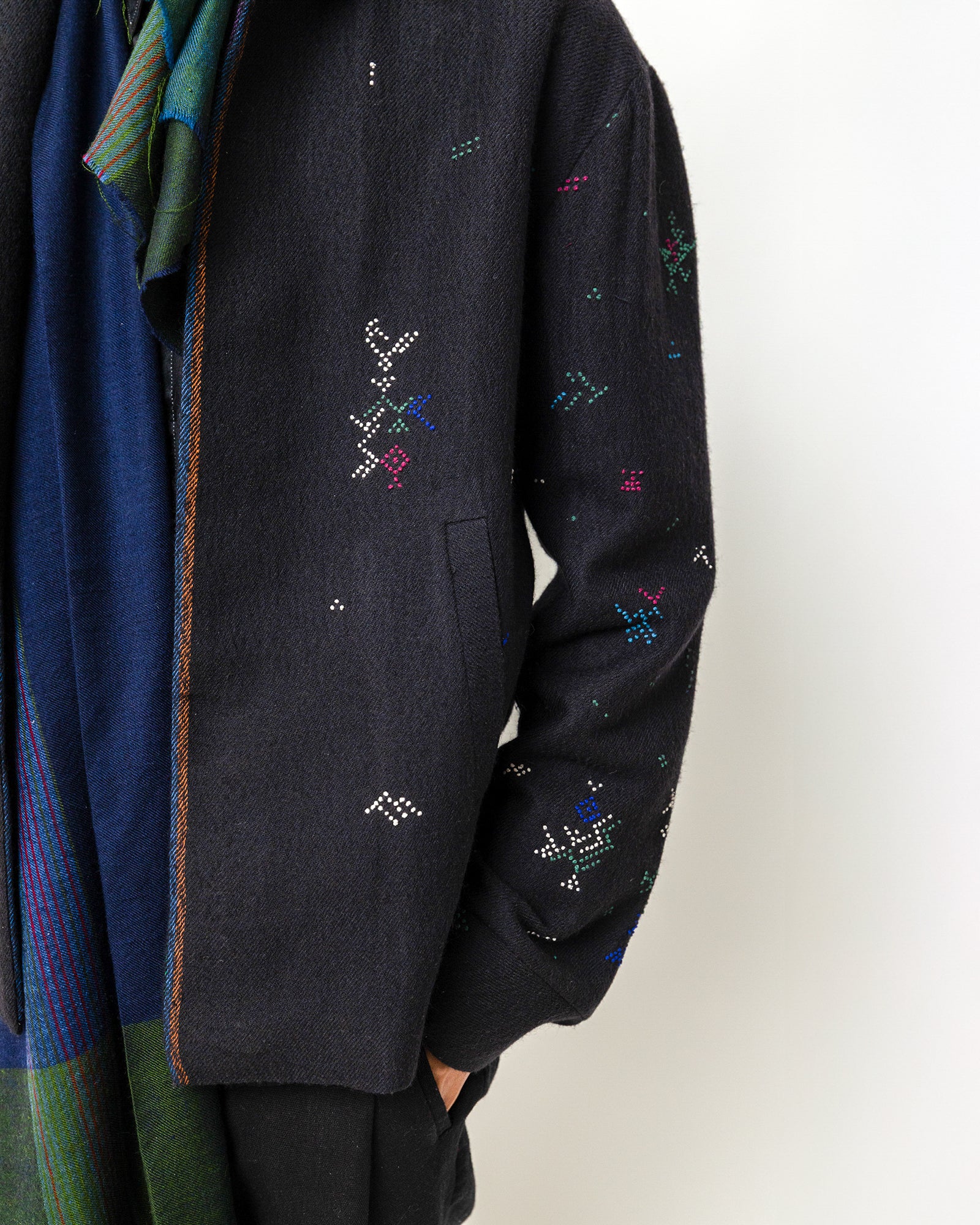 The Philip Jacket is crafted in a deep navy handwoven base and detailed with scattered multicolored embroidery. Designed in a relaxed tailored silhouette, it features a classic jacket collar, long sleeves, and a concealed button-down front for a clean, minimal finish. Two welt pockets add functionality, while the fine geometric motifs stitched across the surface bring a subtle artisanal character.