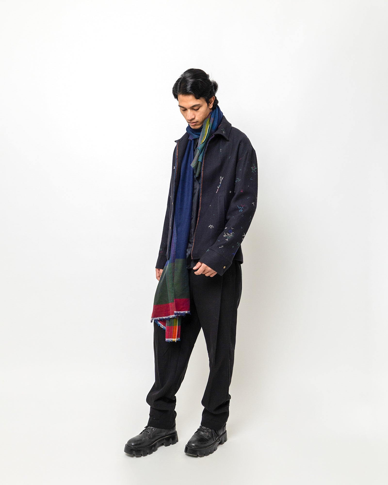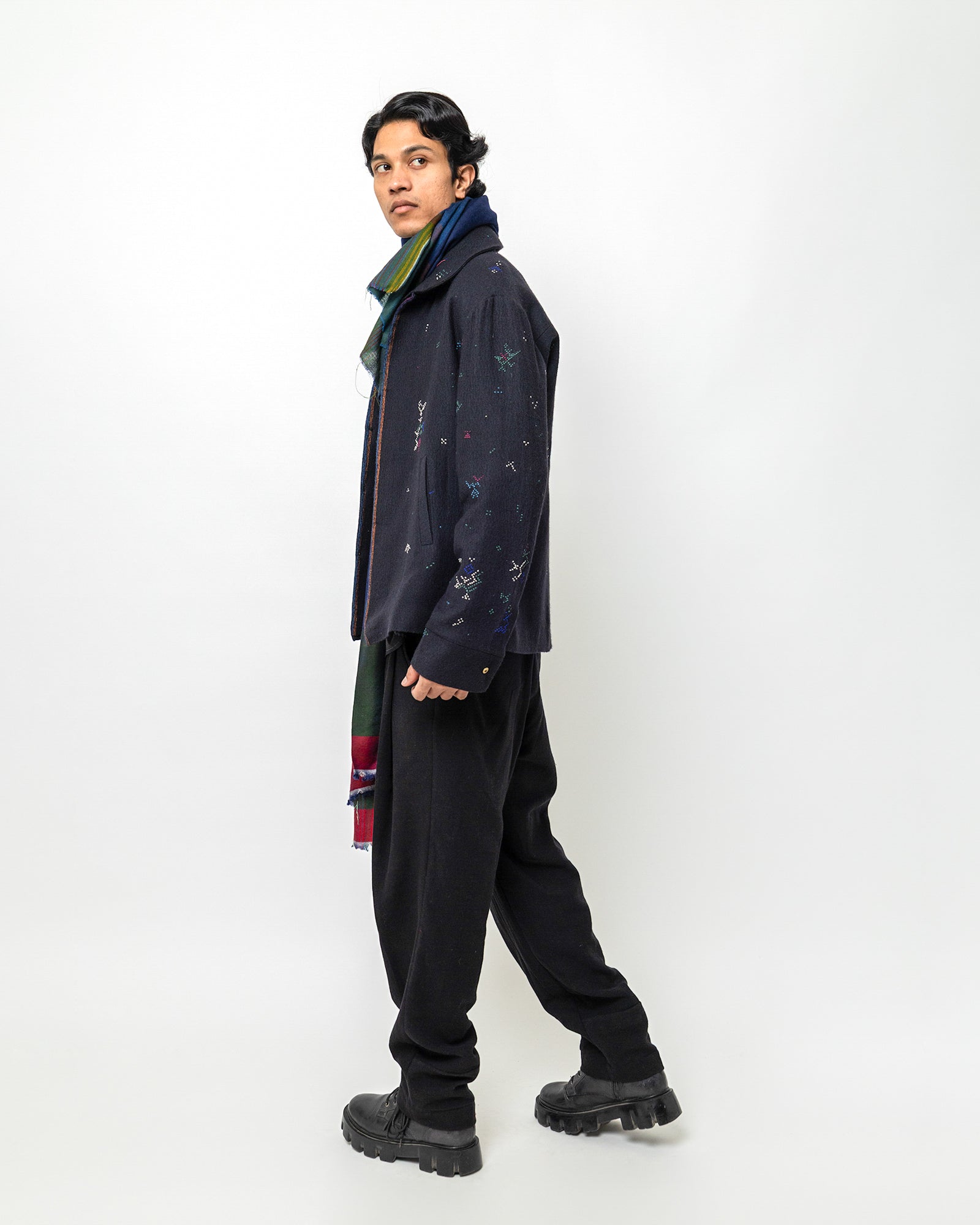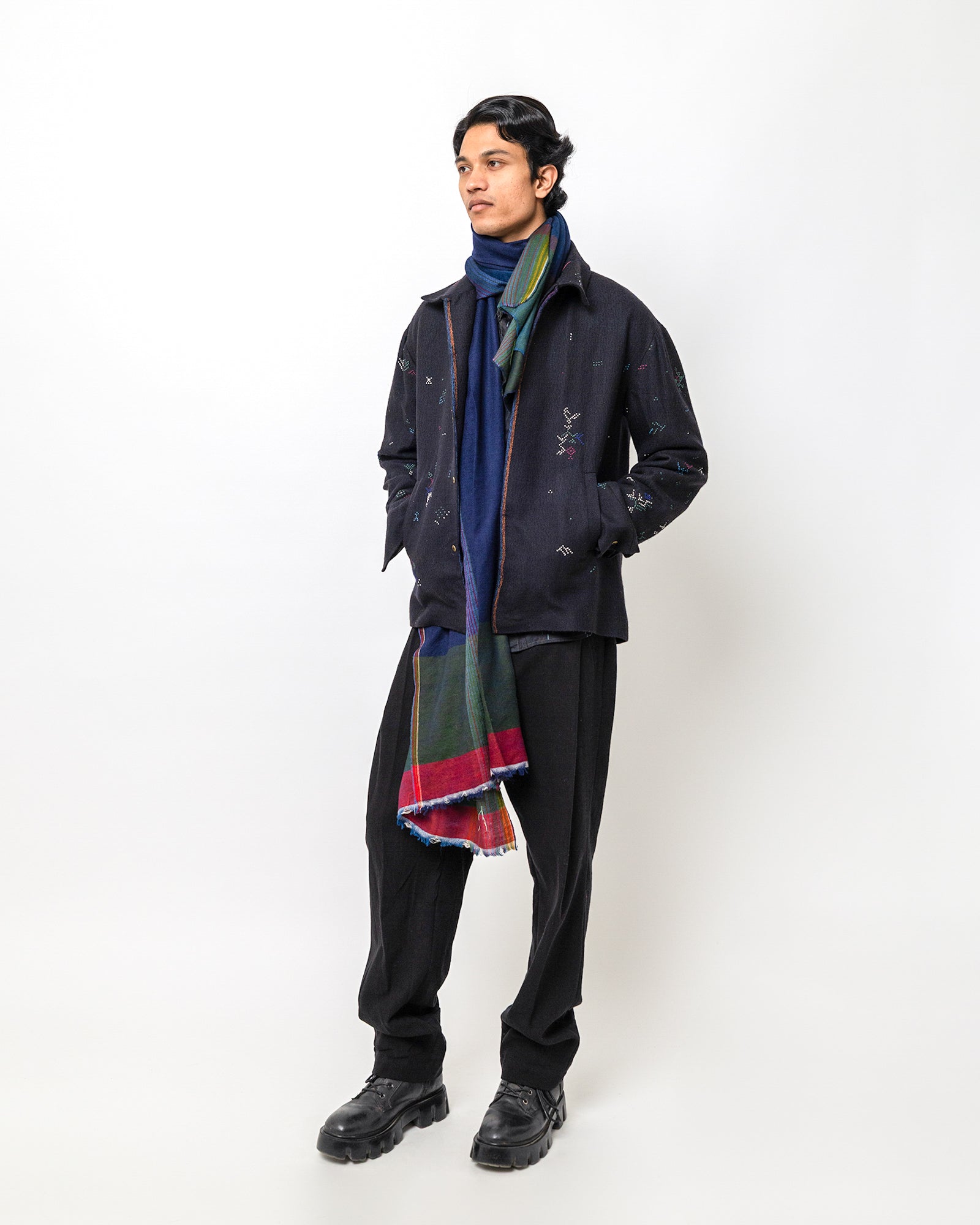 The Philip Jacket is crafted in a deep navy handwoven base and detailed with scattered multicolored embroidery. Designed in a relaxed tailored silhouette, it features a classic jacket collar, long sleeves, and a concealed button-down front for a clean, minimal finish. Two welt pockets add functionality, while the fine geometric motifs stitched across the surface bring a subtle artisanal character.
