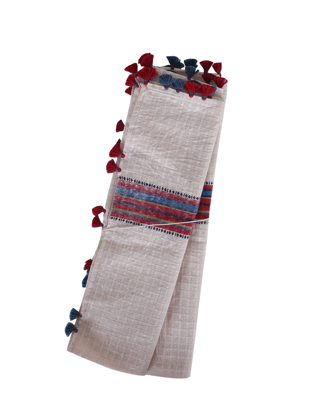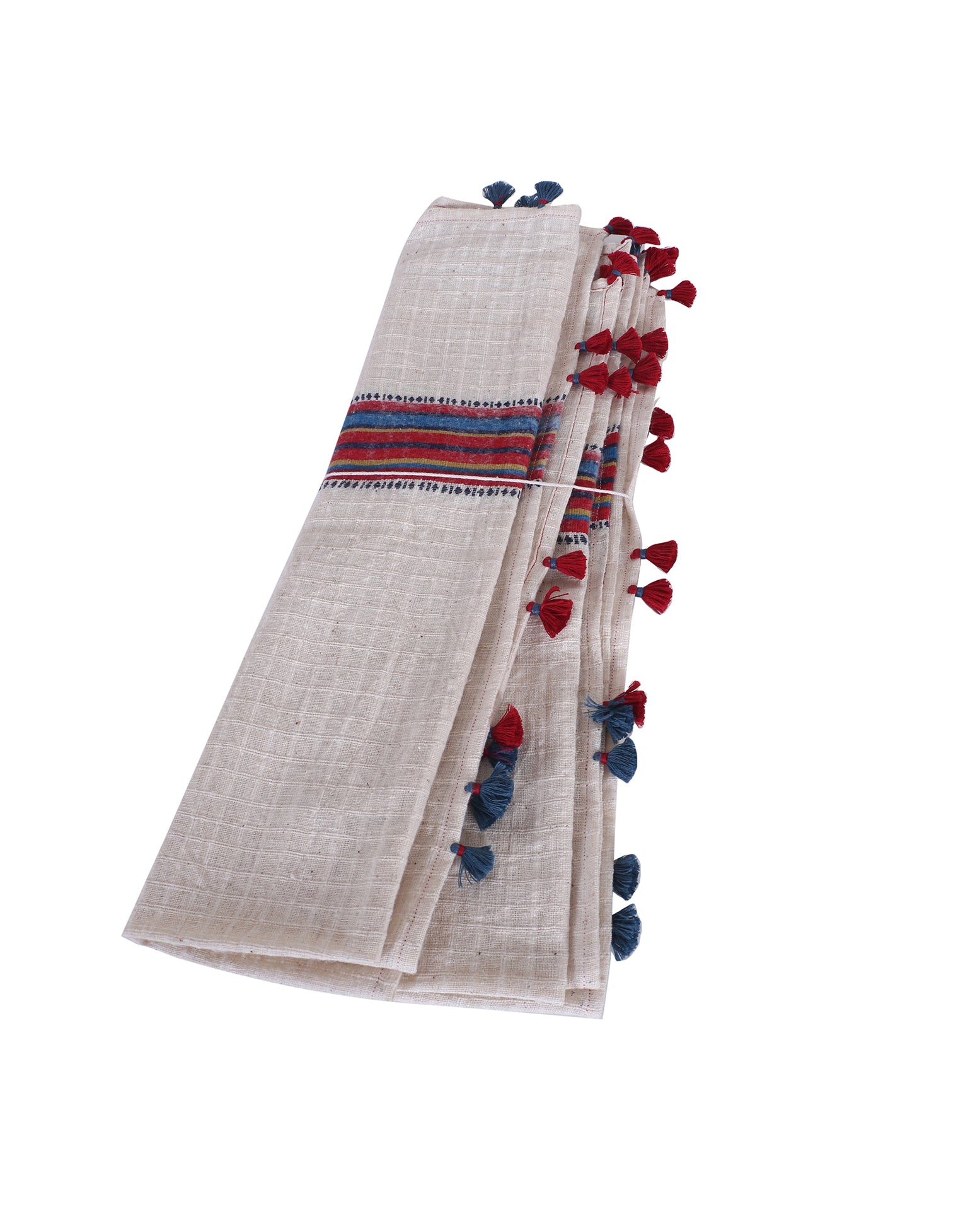 Inspired from traditionalInfian towels, this 'Pichwai' towel is an epitome of Indianess with a contemporary outflook. Woven in pure cotton white base, the towel is adorned with bhujodi woven detailing on the edge and playful tassel detailing.