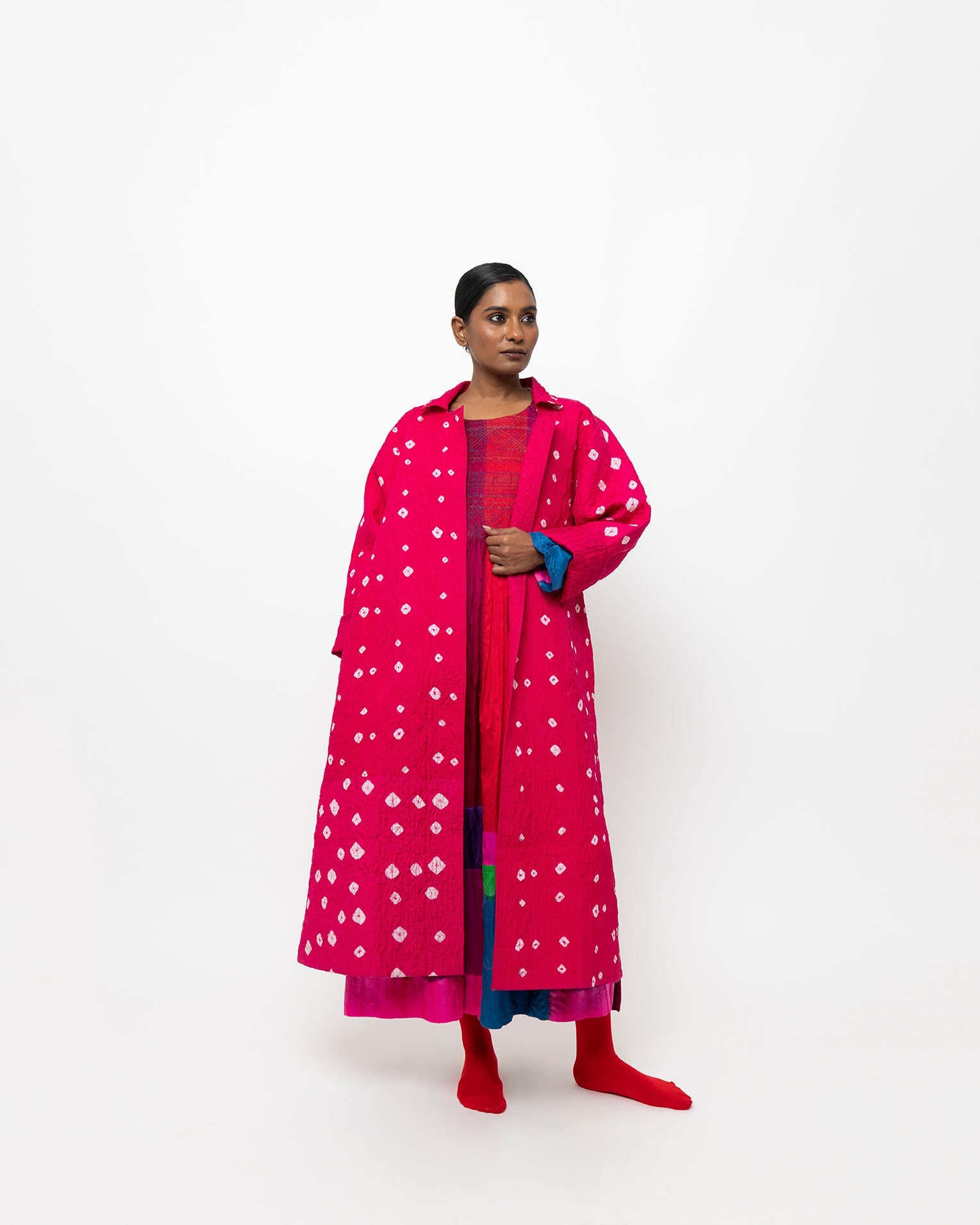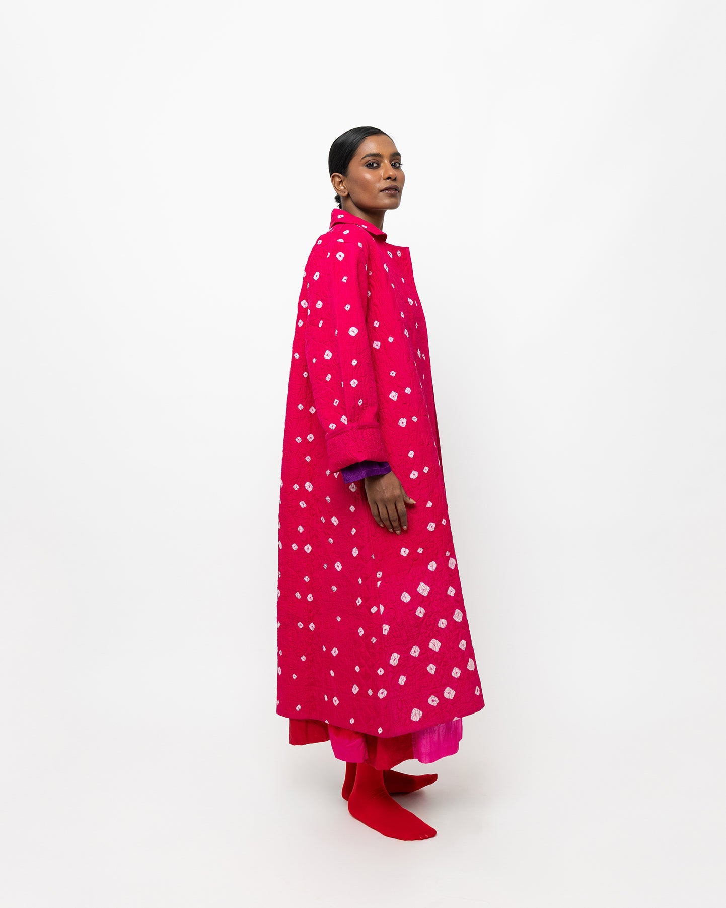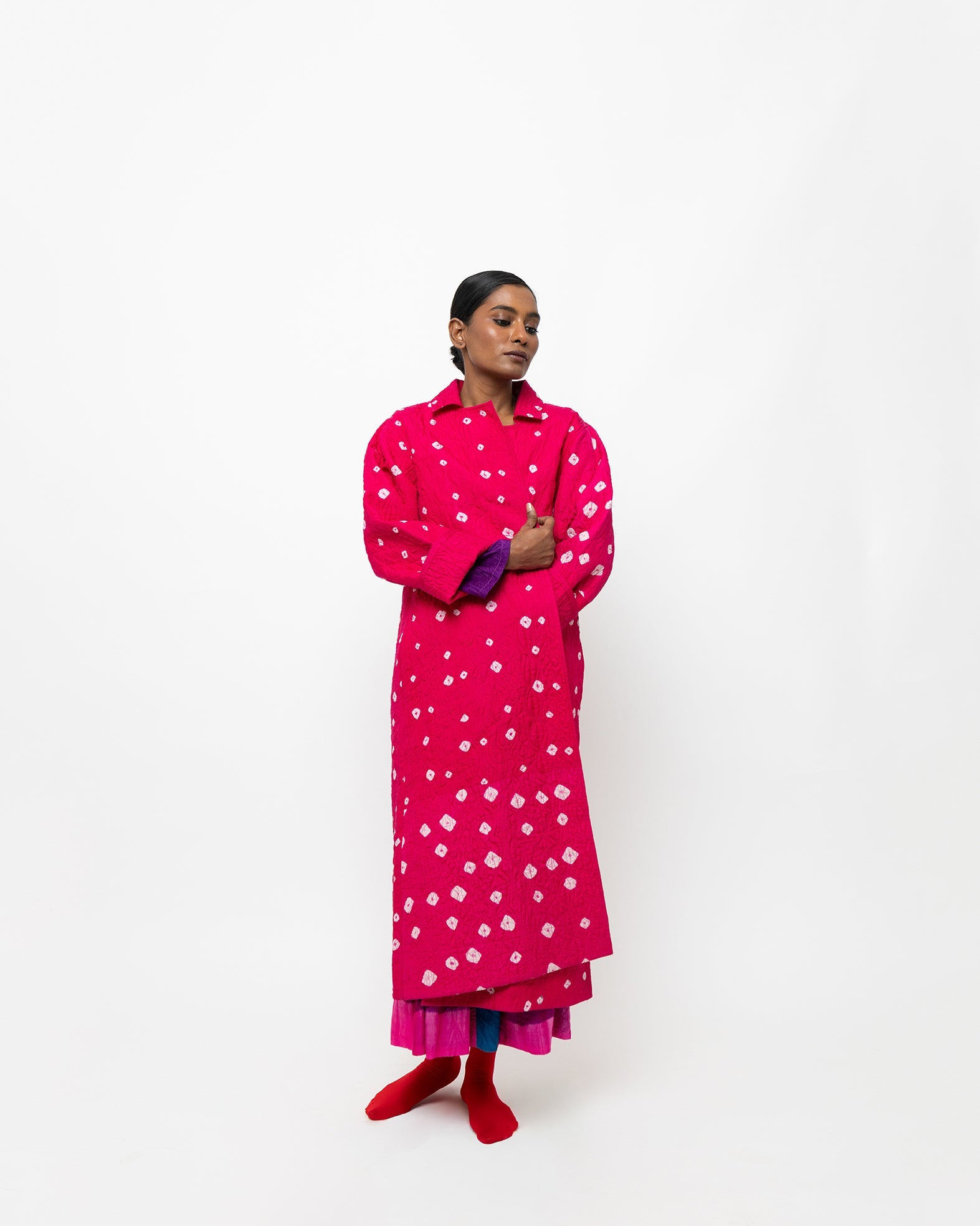 The Pulse jacket is crafted in tie-dyed silk with small resist-dyed motifs scattered across a bright pink base. Designed with a notched collar, front opening, and a relaxed straight fit, it is lightweight and easy to layer over dresses or separates.