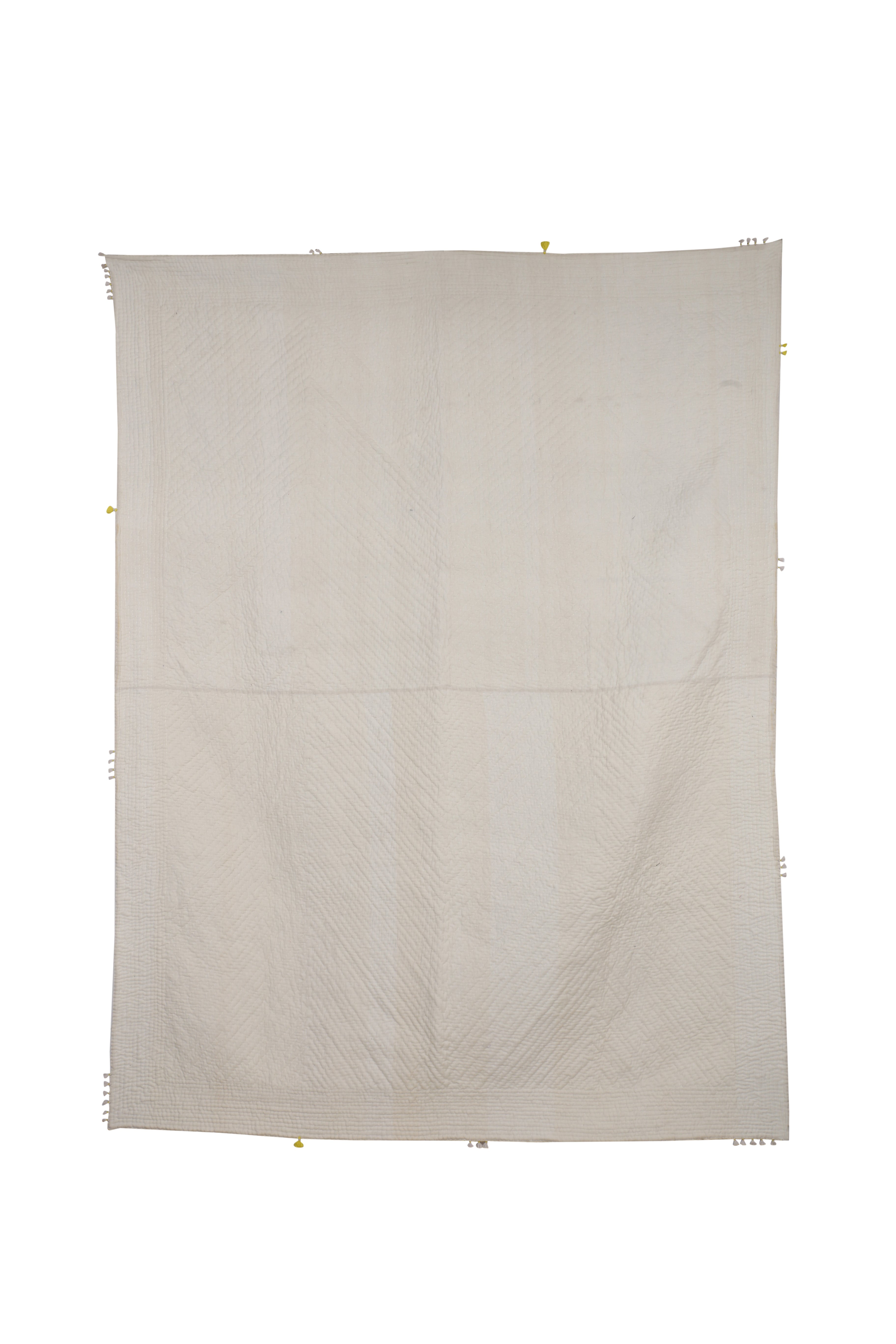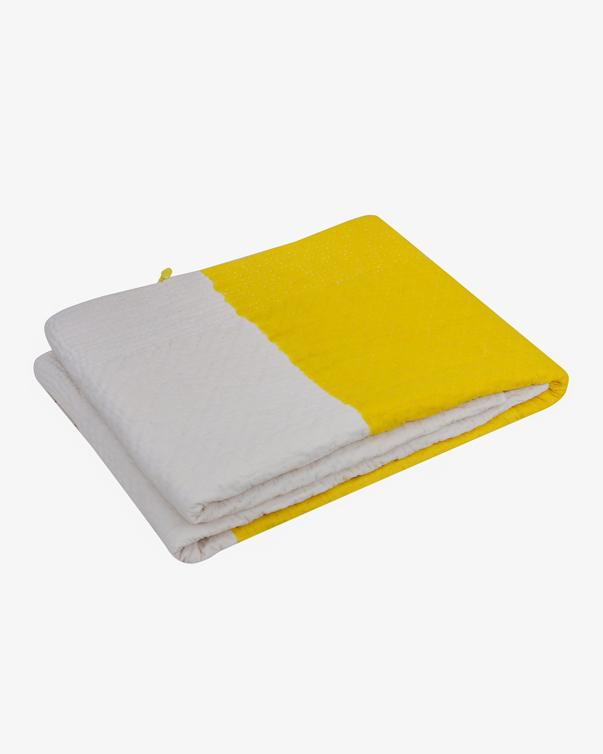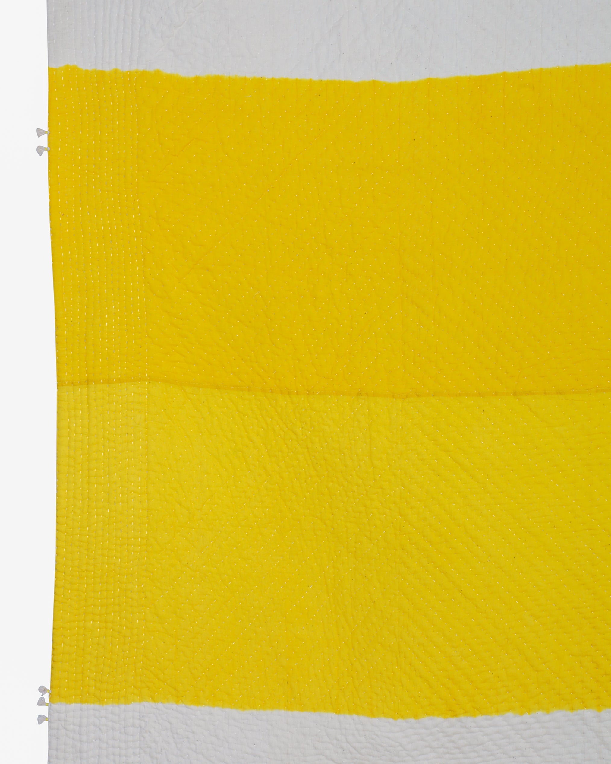 Clamp-dyed quilt, is the perfect addition your bedroom with a fun and playful twist. This 'Rafu' quilt features a bright yellow yed base in the centre, with subtle beige shade above and below it. Fruthermore, tagai embroidery has been done over it to create beautiful texture. Lastly, the addition of hand-tied tassels beautifies it even further. If you're an enthisiast of vibrant home decor, this piece is just for you.