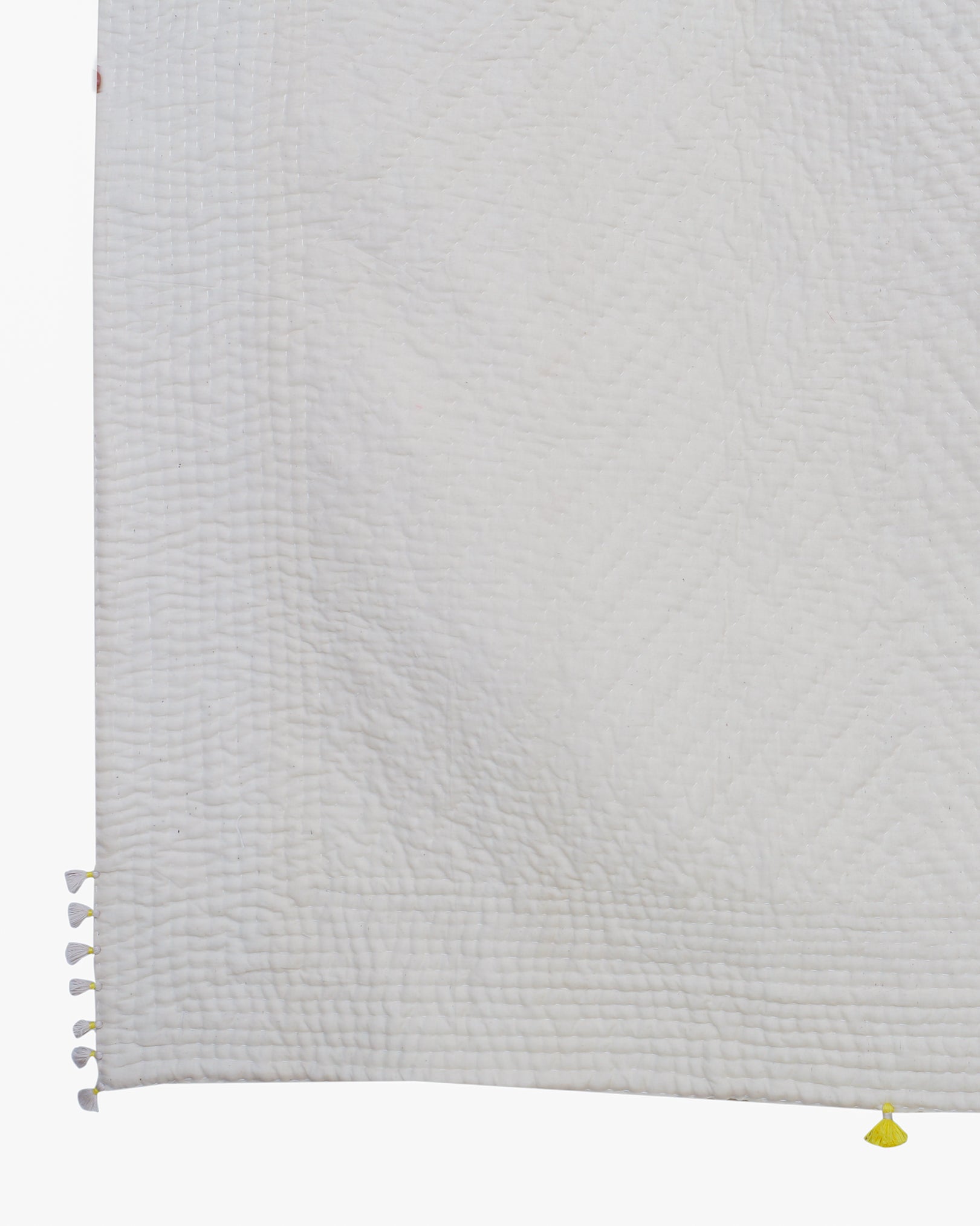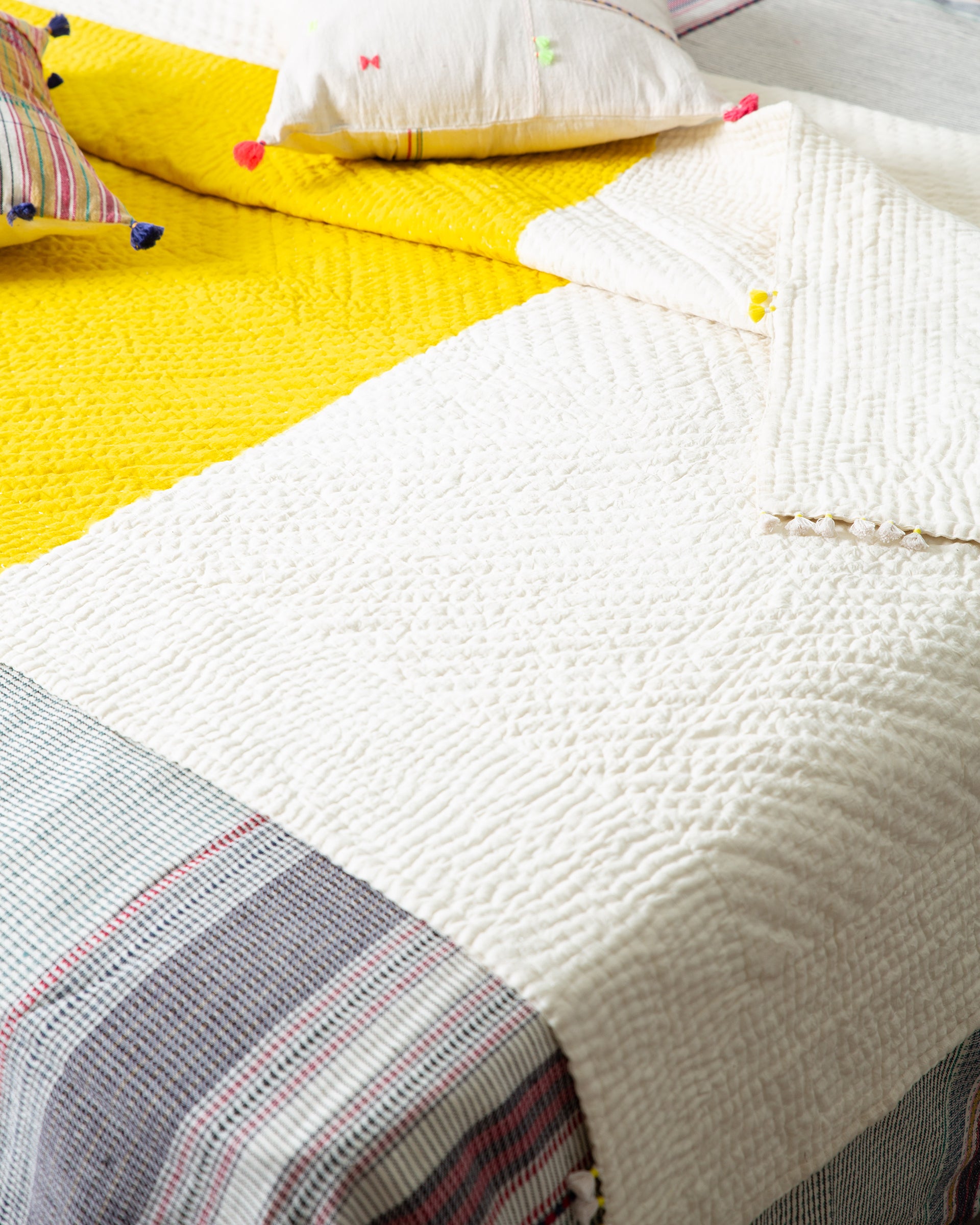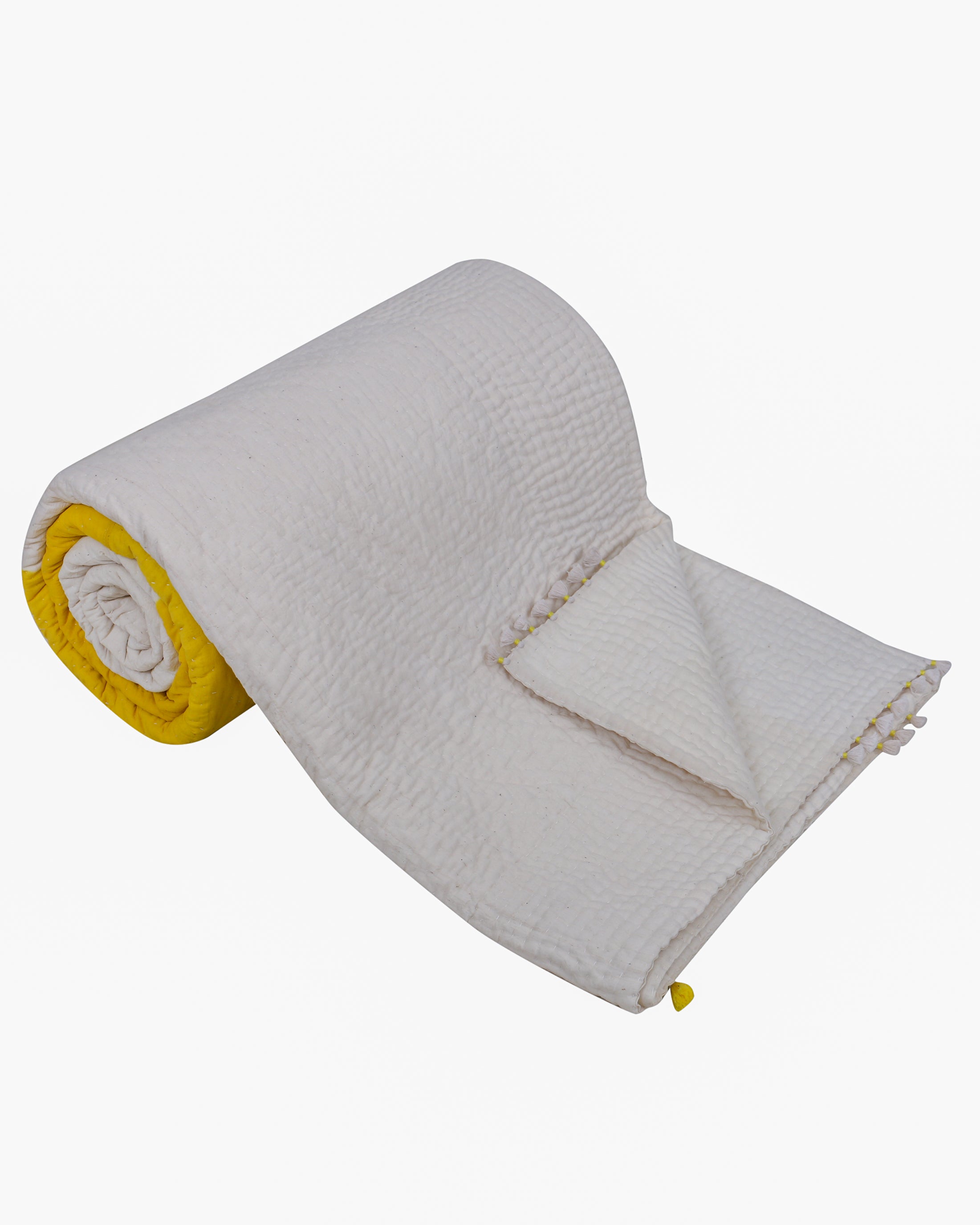 Clamp-dyed quilt, is the perfect addition your bedroom with a fun and playful twist. This 'Rafu' quilt features a bright yellow yed base in the centre, with subtle beige shade above and below it. Fruthermore, tagai embroidery has been done over it to create beautiful texture. Lastly, the addition of hand-tied tassels beautifies it even further. If you're an enthisiast of vibrant home decor, this piece is just for you.