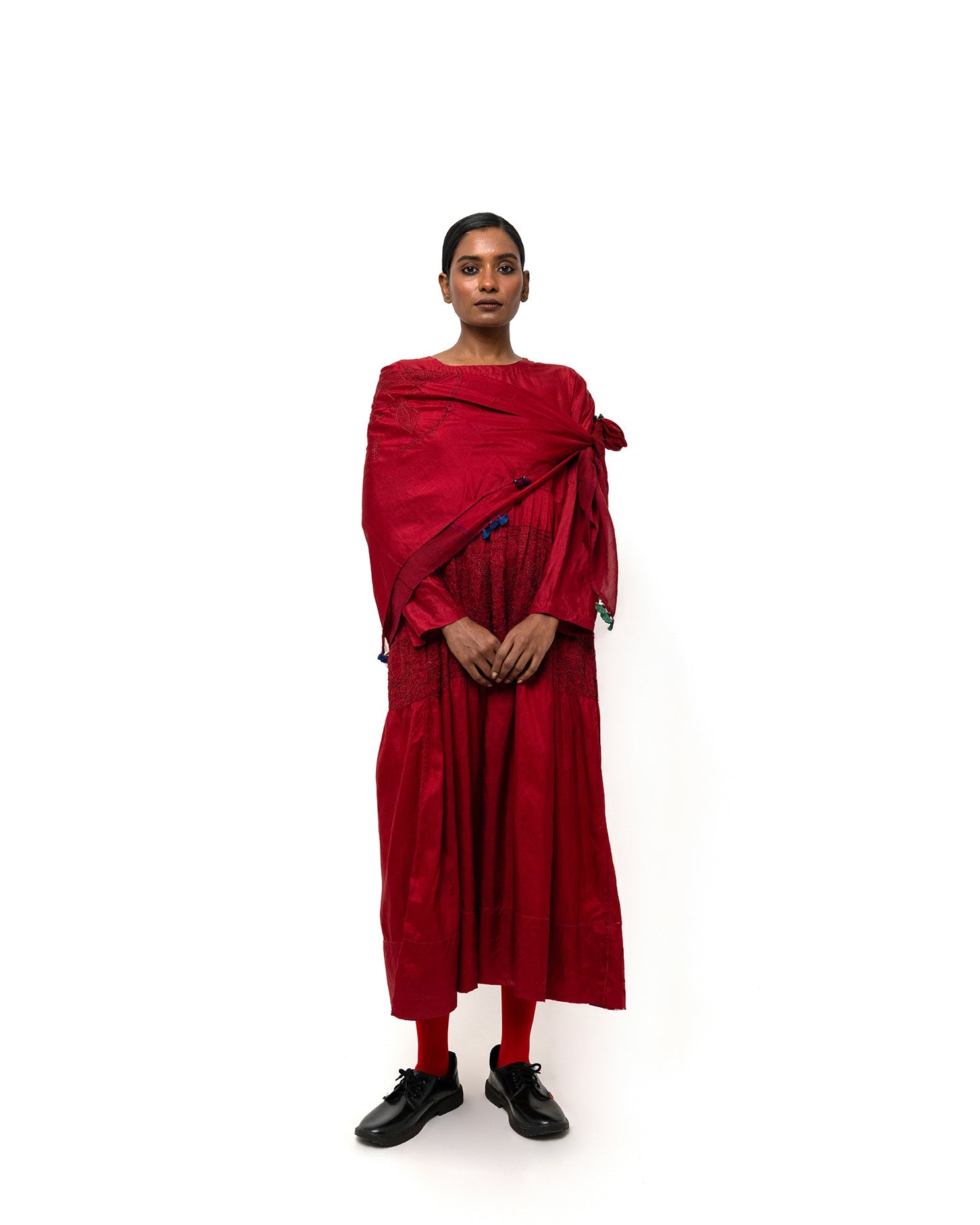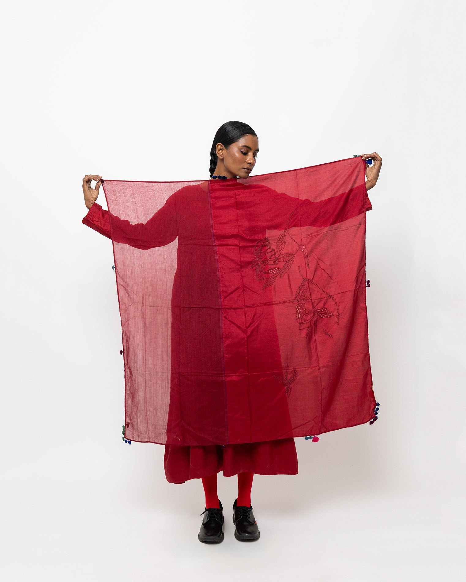 The Rakta scarf is crafted in fine silk and detailed with delicate chikankari embroidery. Dyed in deep, layered reds, it has a soft translucence that allows the embroidery to subtly emerge as it drapes. Light and fluid, Rakta can be worn as a gentle wrap or styled as a statement