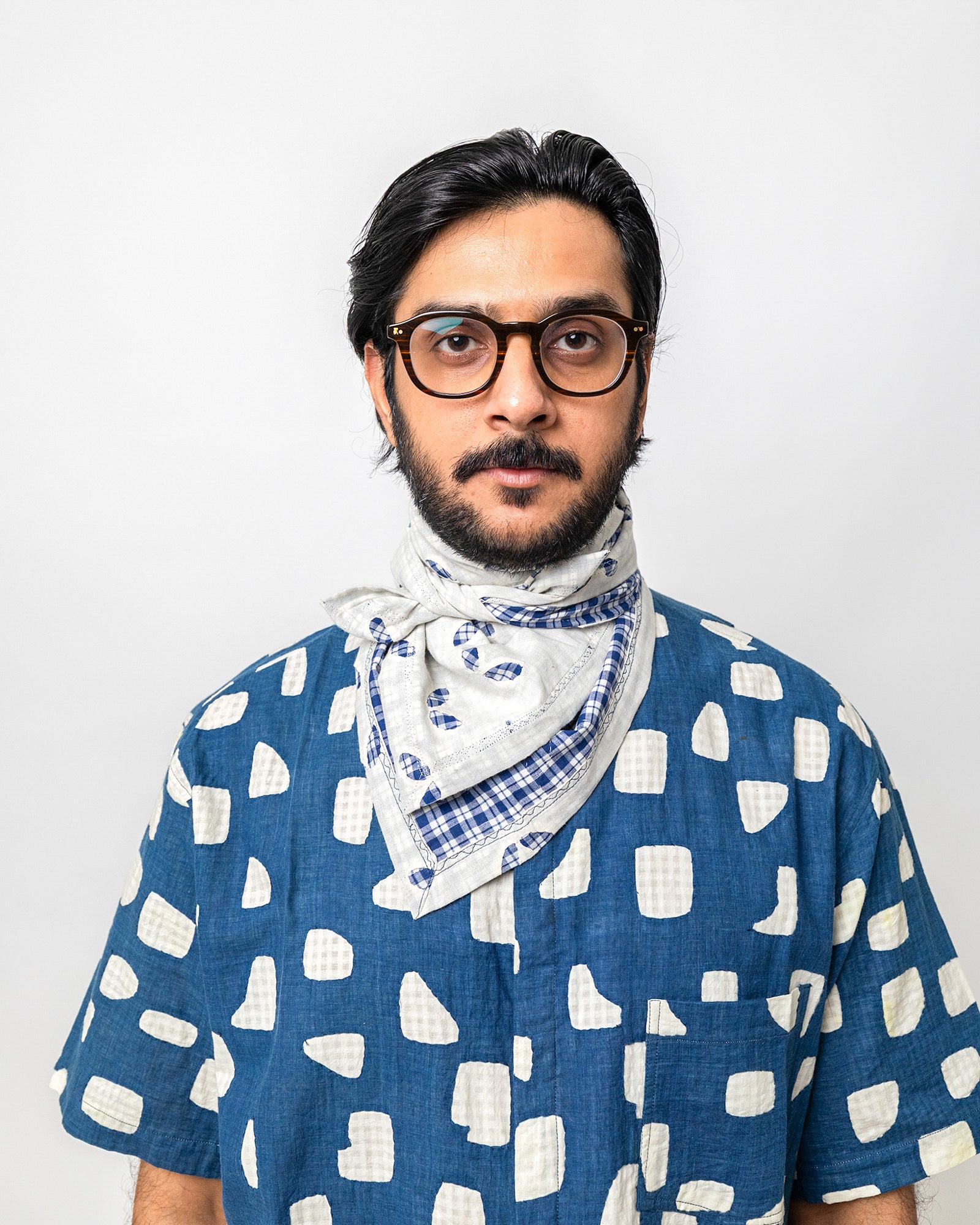 The Rayan Scarf in cotton and detailed with indigo appliquéd motifs on a soft ivory base. Its pattern brings a gentle visual movement, while the lightweight, breathable cotton ensures an easy, fluid drape. Designed in a square format, it can be styled at the neck, layered as an accent, or worn as a pocket square for added texture