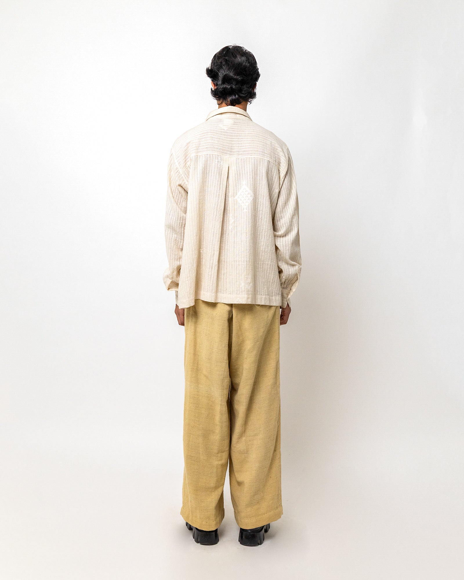 The Rayan Trousers made in handwoven cotton from Gujarat, in a warm beige tone. Designed with a relaxed, wide-leg silhouette, they feature front pleats for added ease, a structured waistband with a button-and-fly closure, belt loops, and functional side pockets. The subtle texture of the weave enhances the fabric’s natural character