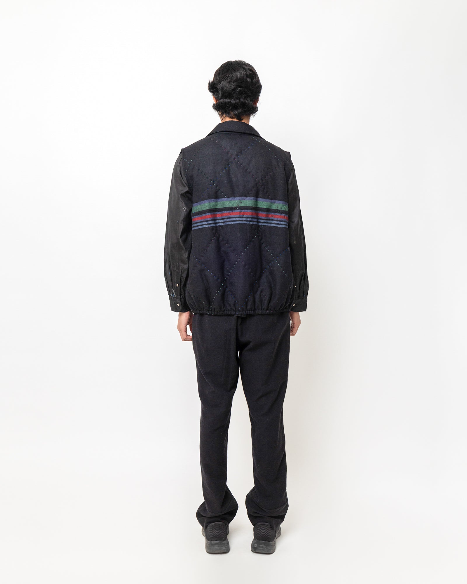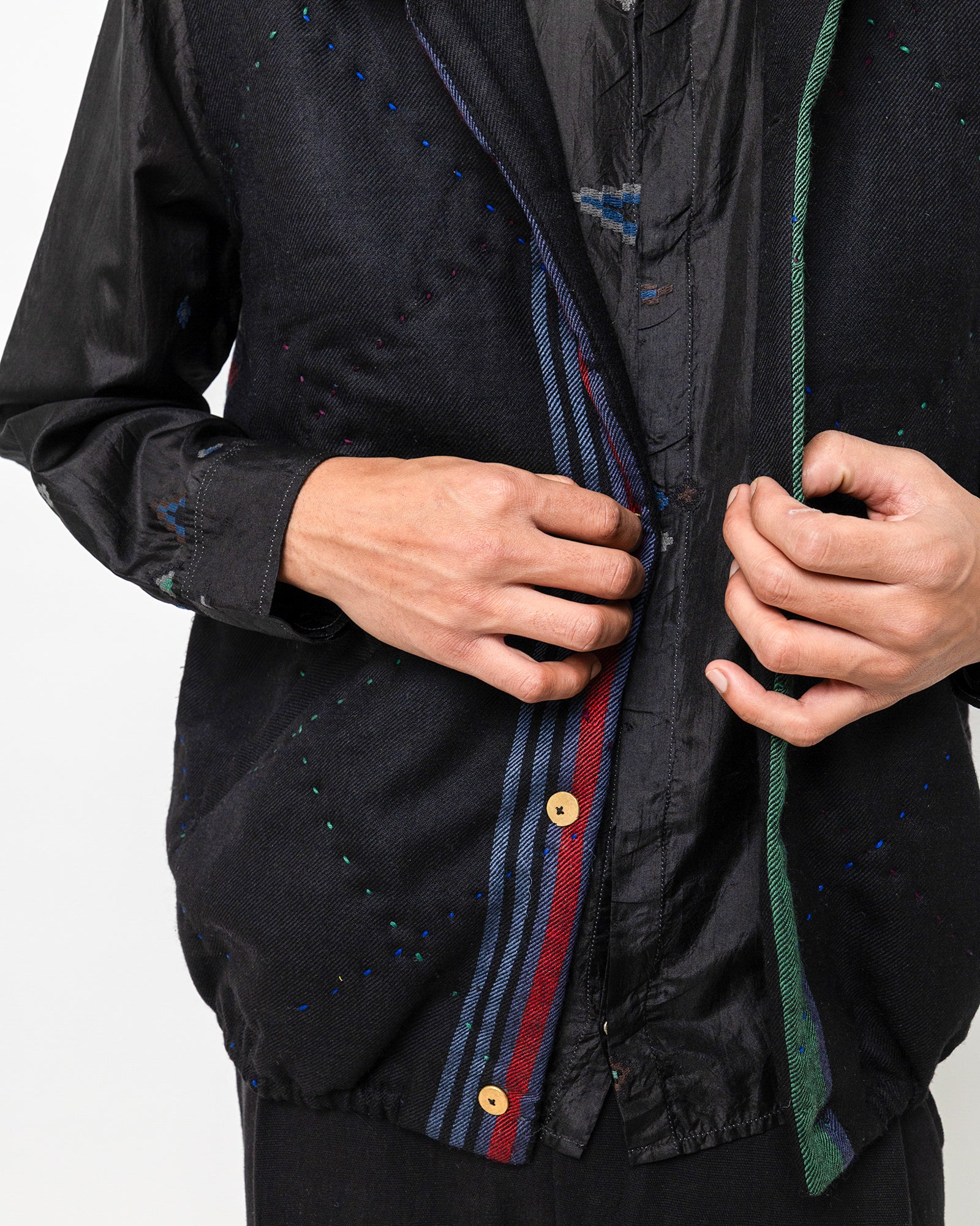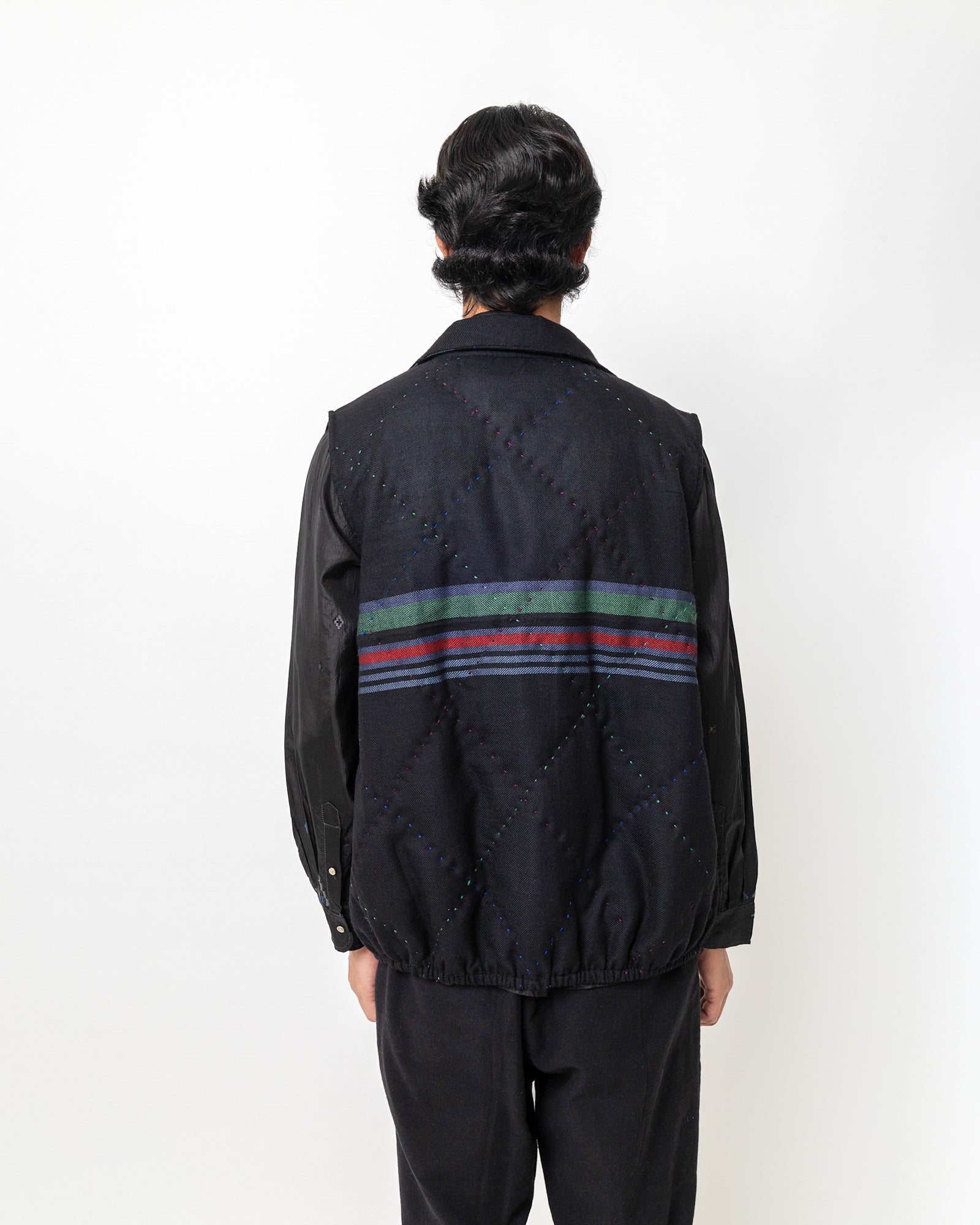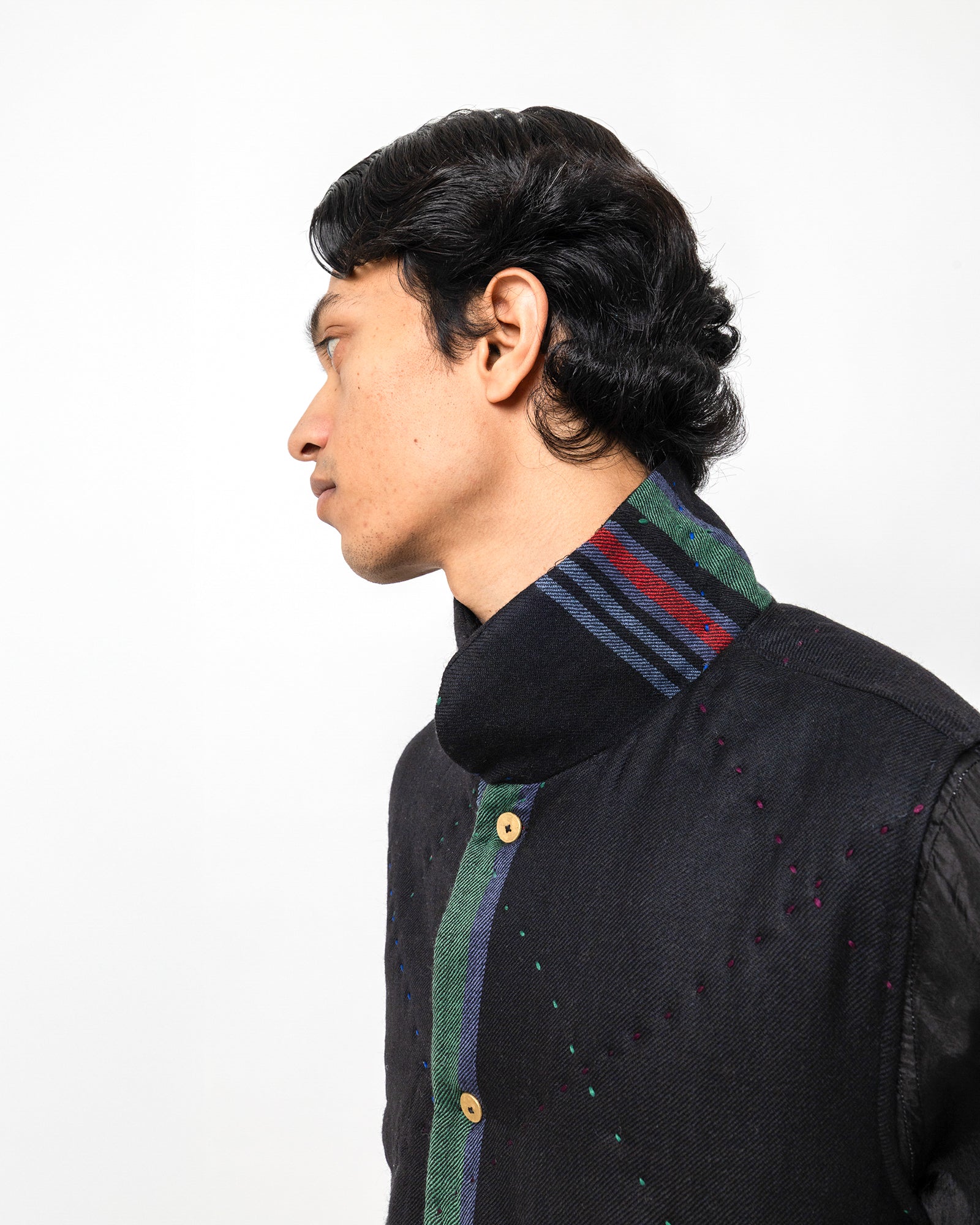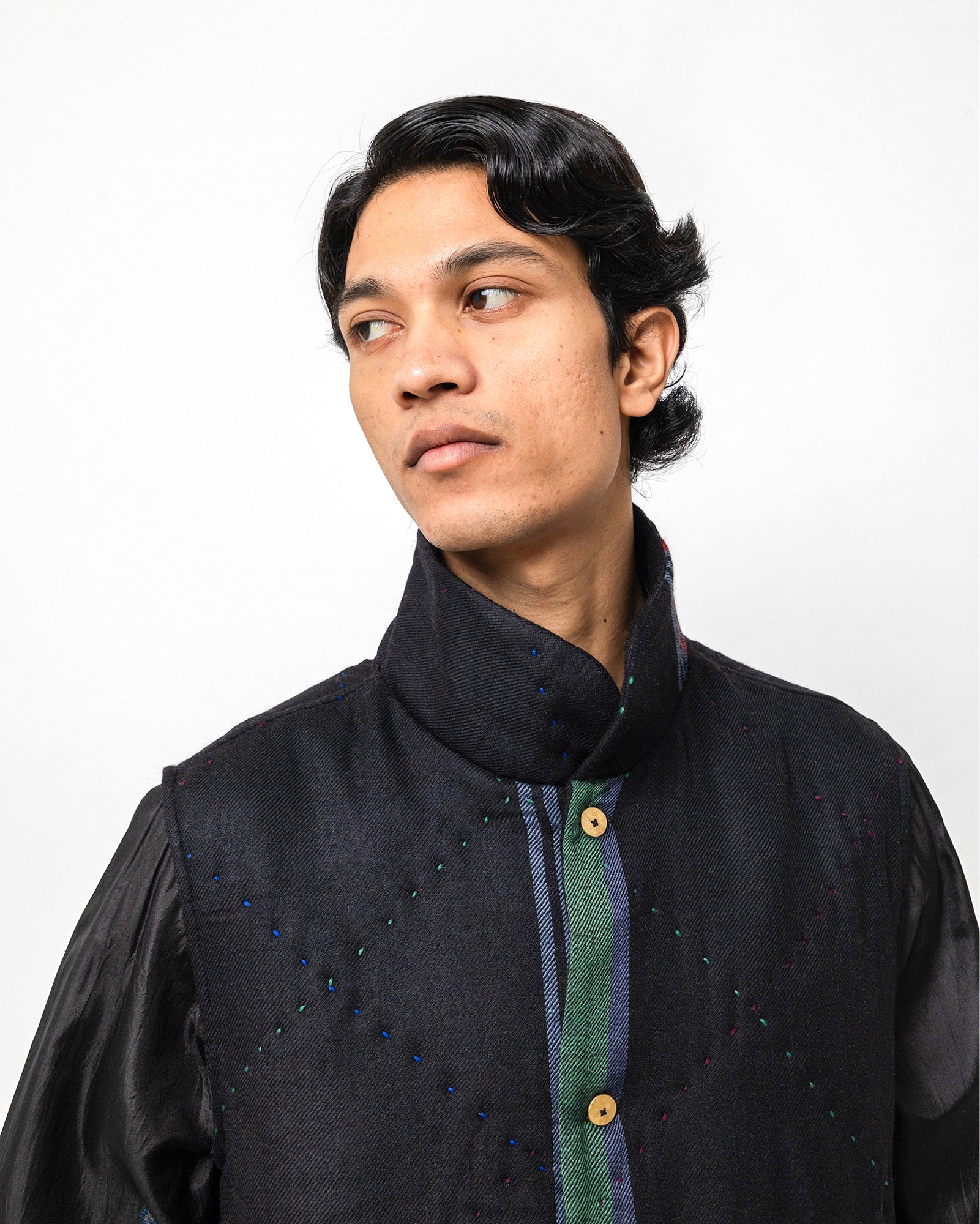 The Revaan Jacket is made in handwoven wool with subtle, all-over running stitches that lend gentle texture to its deep indigo surface. It is fully lined in smooth silk for comfort and refined structure. Designed with a soft collar, front pockets, and a colour-blocked placket, the jacket sits lightly on the body, making it ideal for layering through shifting seasons.