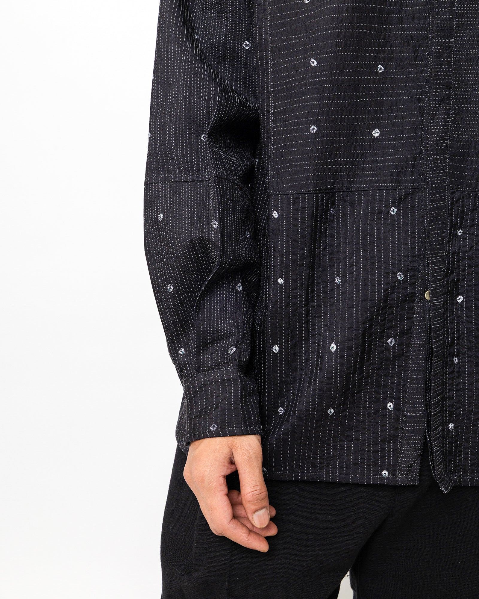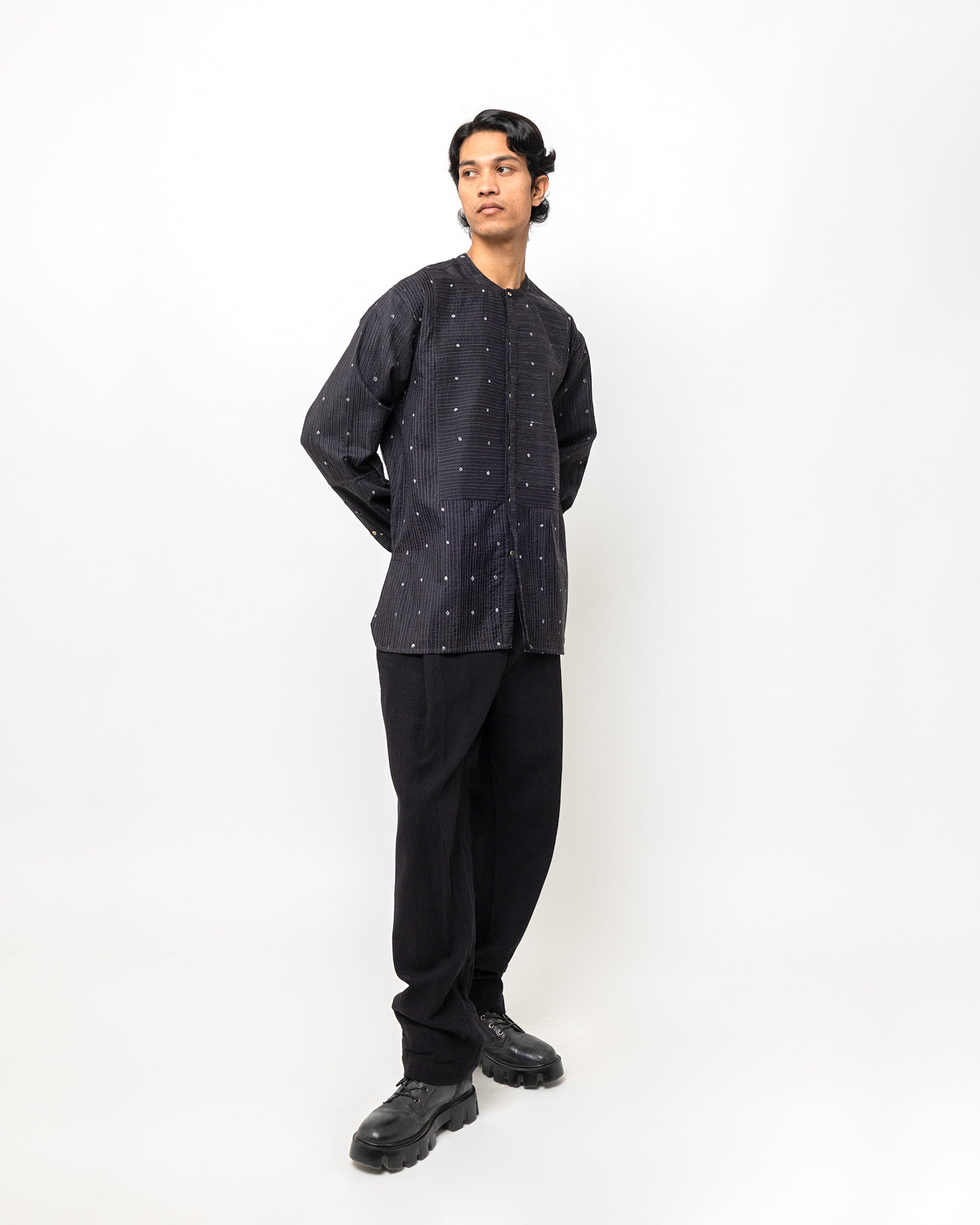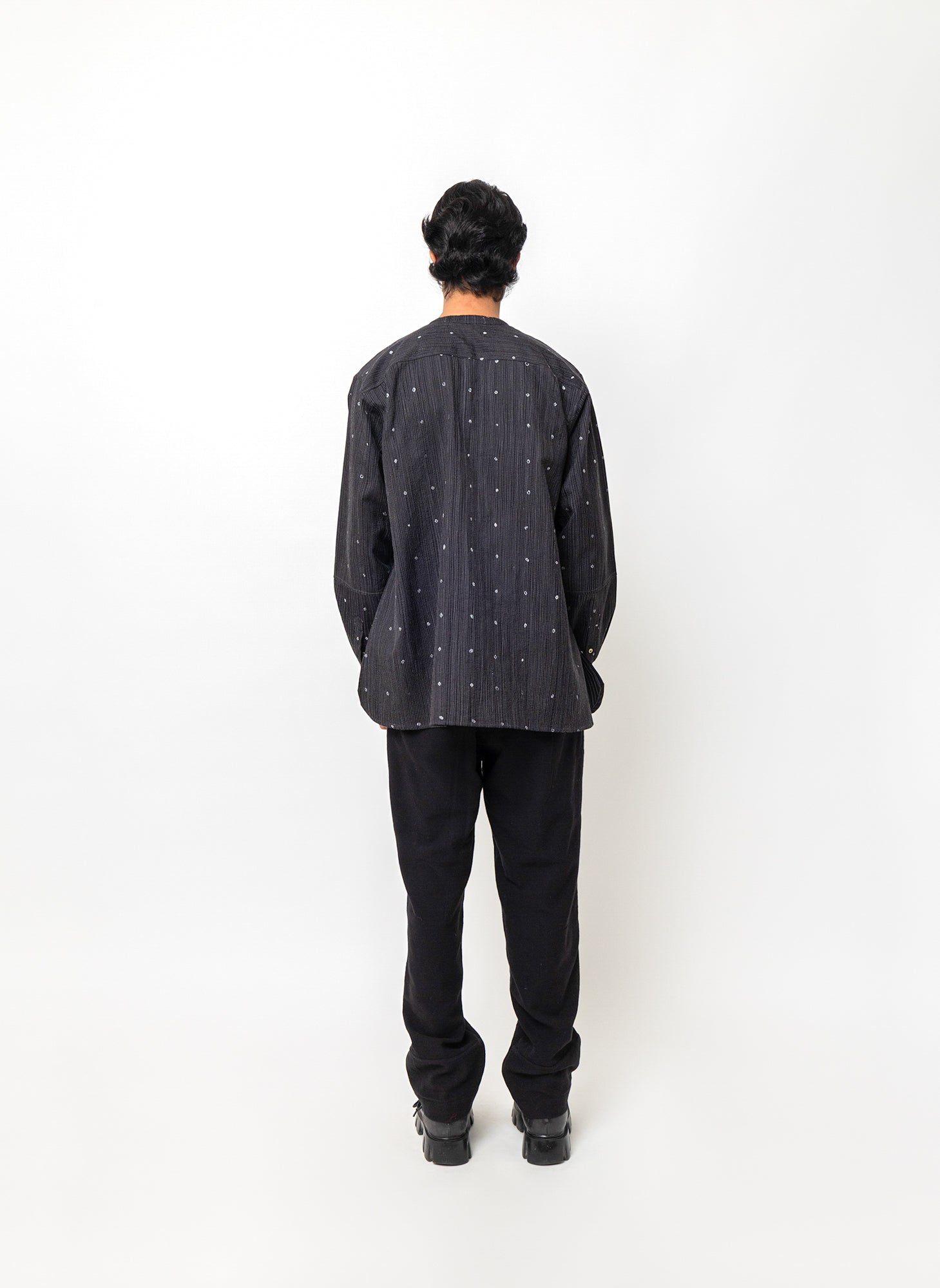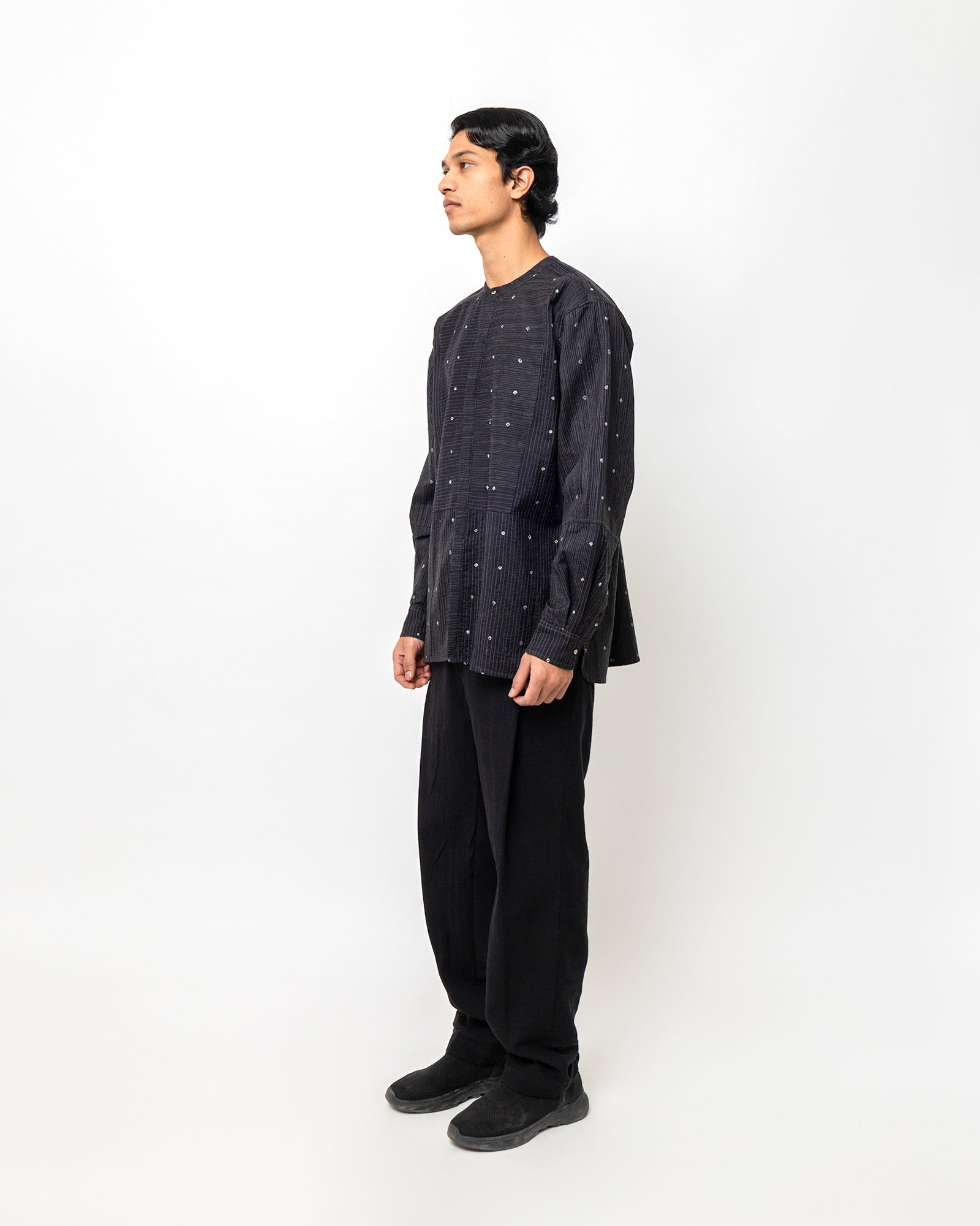 The Reya Shirt is crafted in Bandhani silk with Tagai embroidery. Designed with full-length sleeves and a band collar, it features a regular fit and a full button-down front opening. Subtle Bandhani dots paired with fine stitched details create a textured, refined surface on a deep navy base.