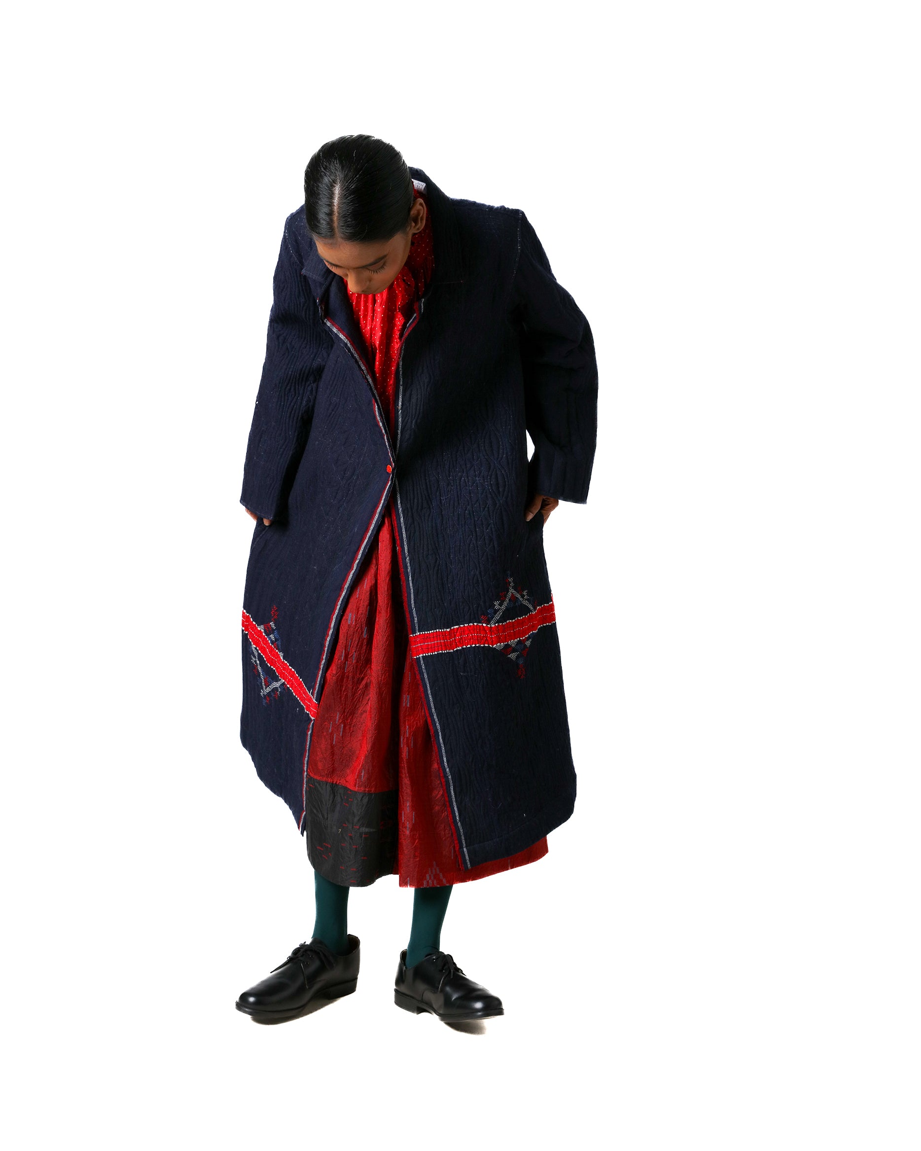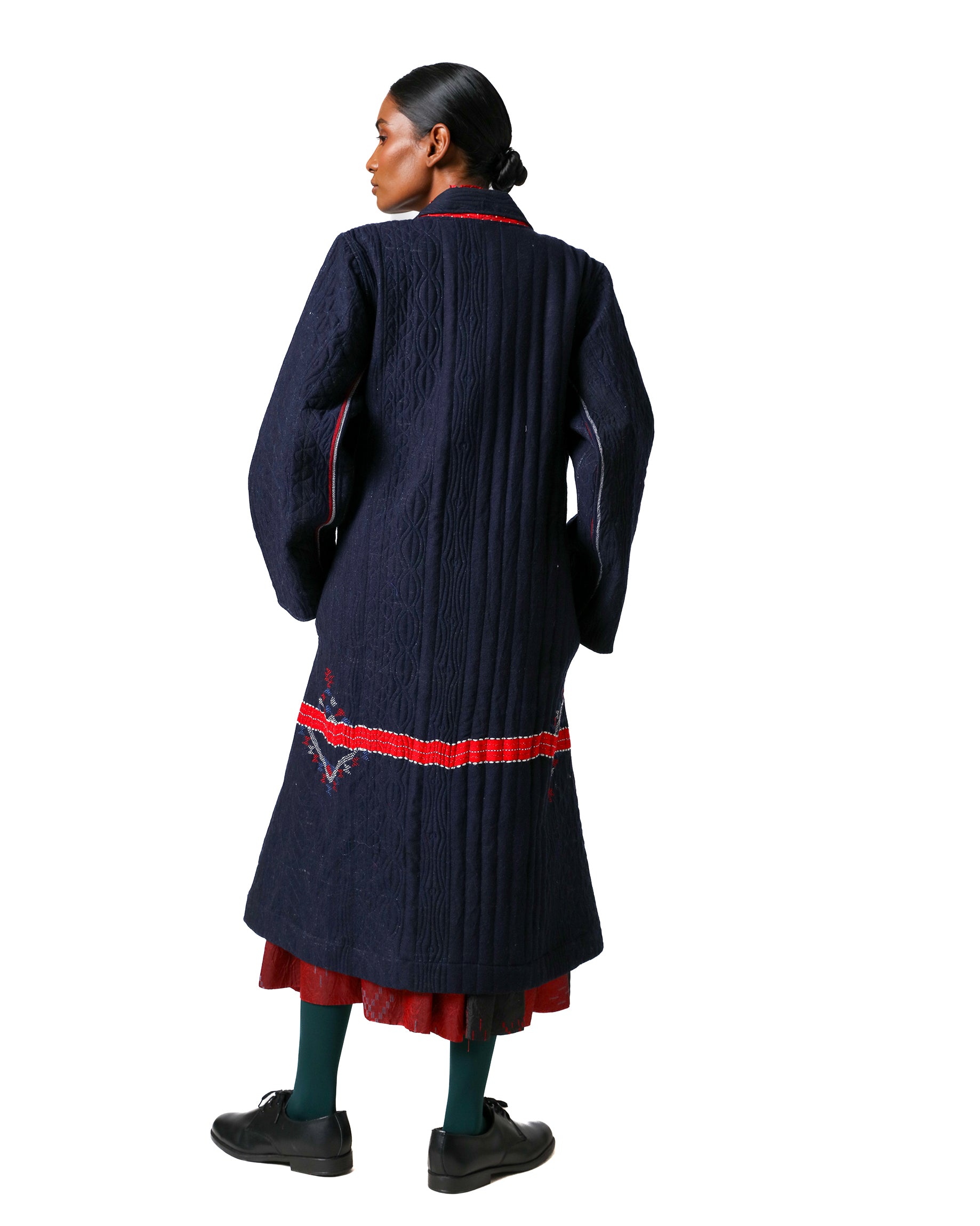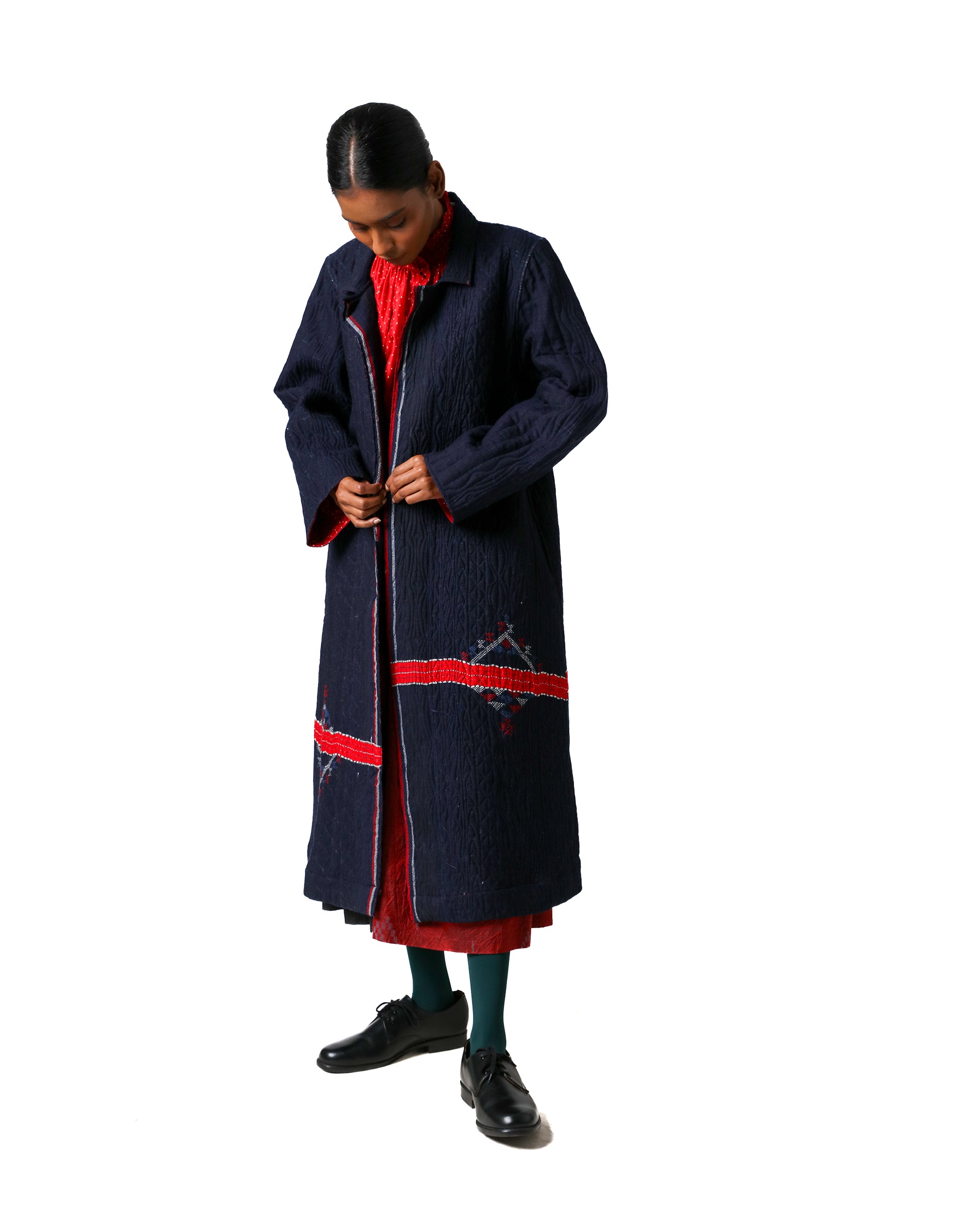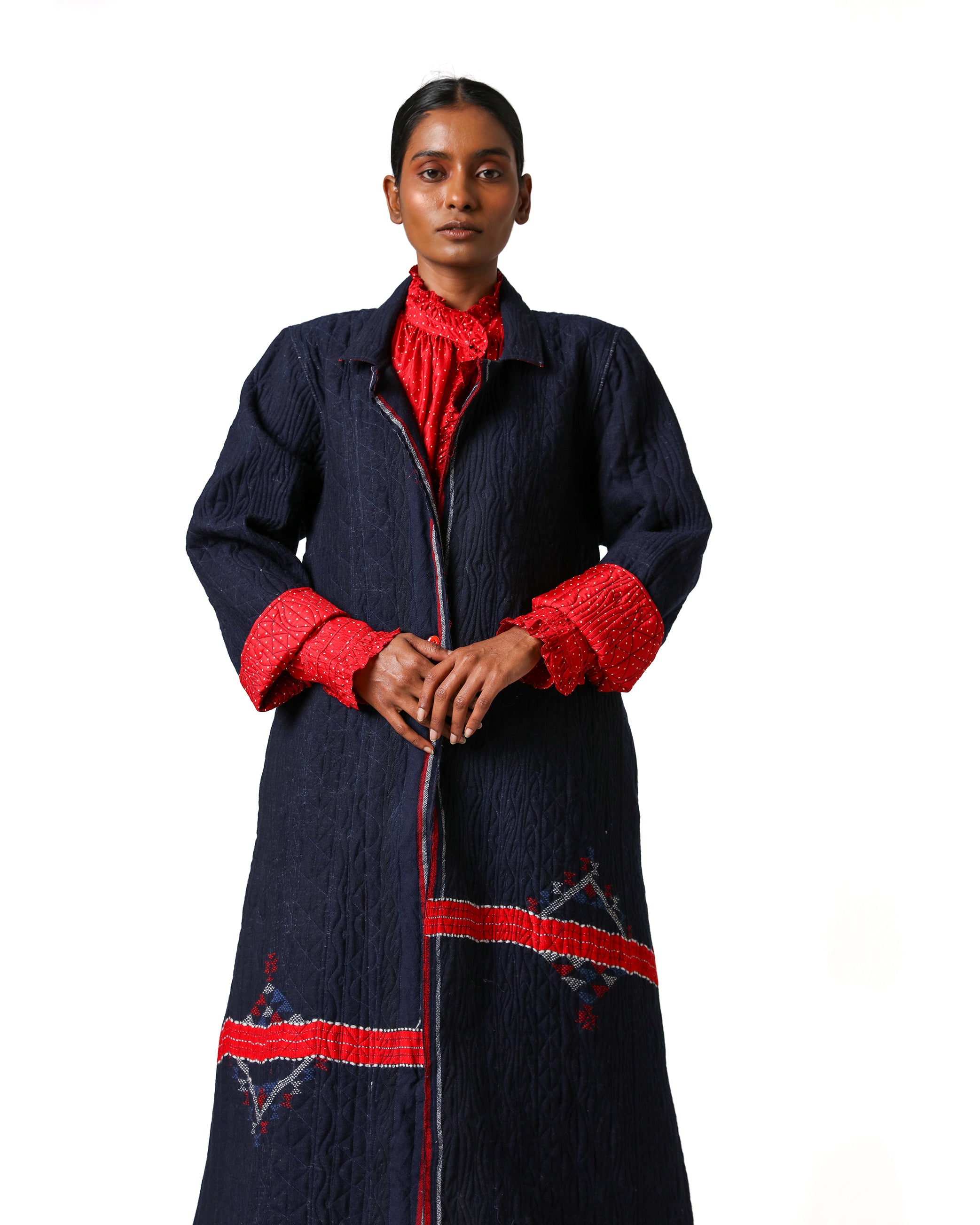 Rong Jacket in merino wool, handwoven in Gujarat. Padded for warmth and adorned with Tagai embroidery all over, it features a structured silhouette, front button closure, and a contrasting red silk lining with tiny polka dots.