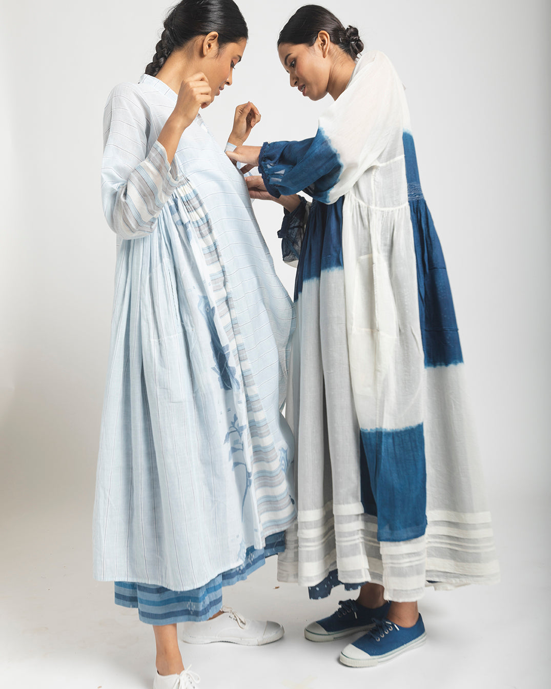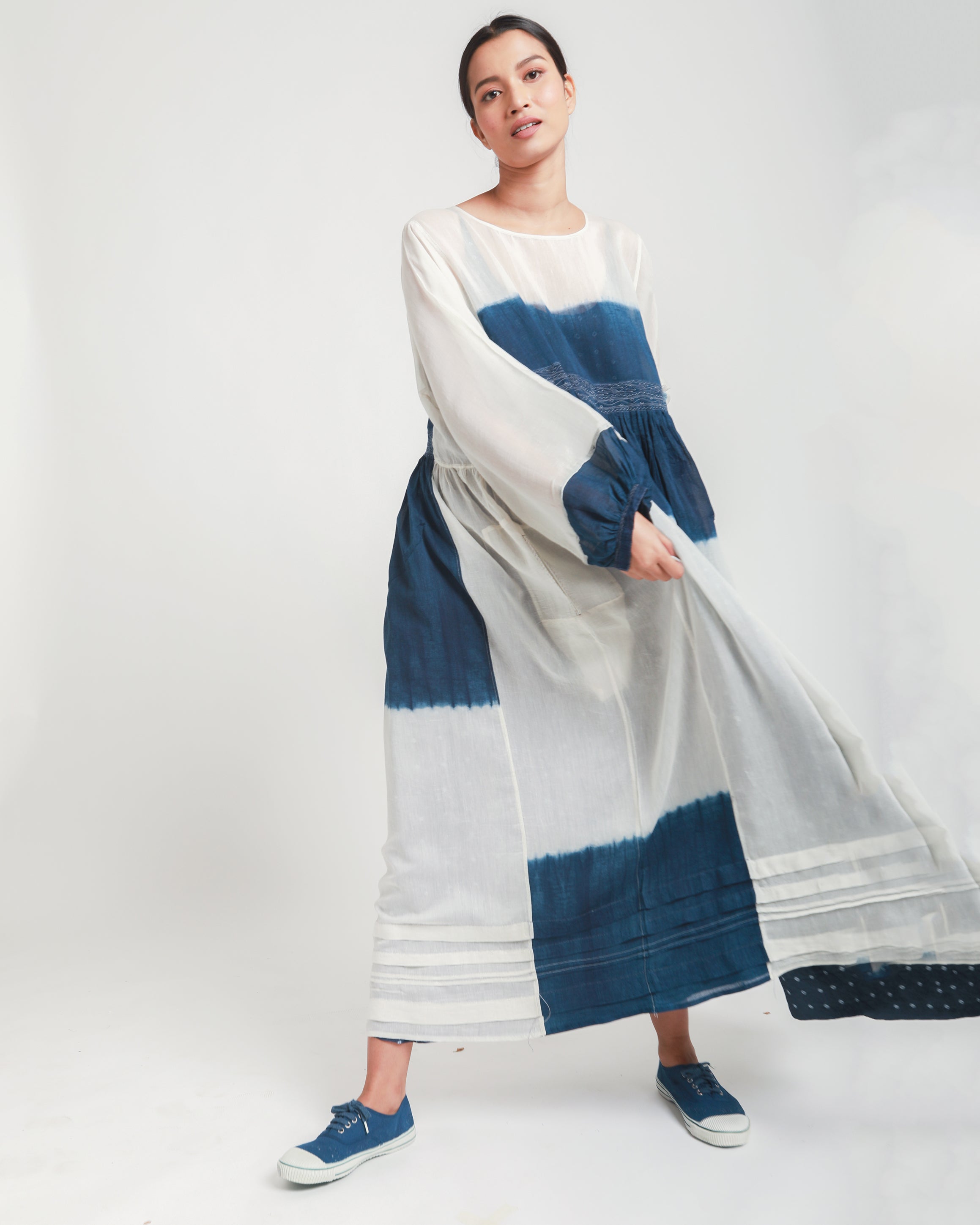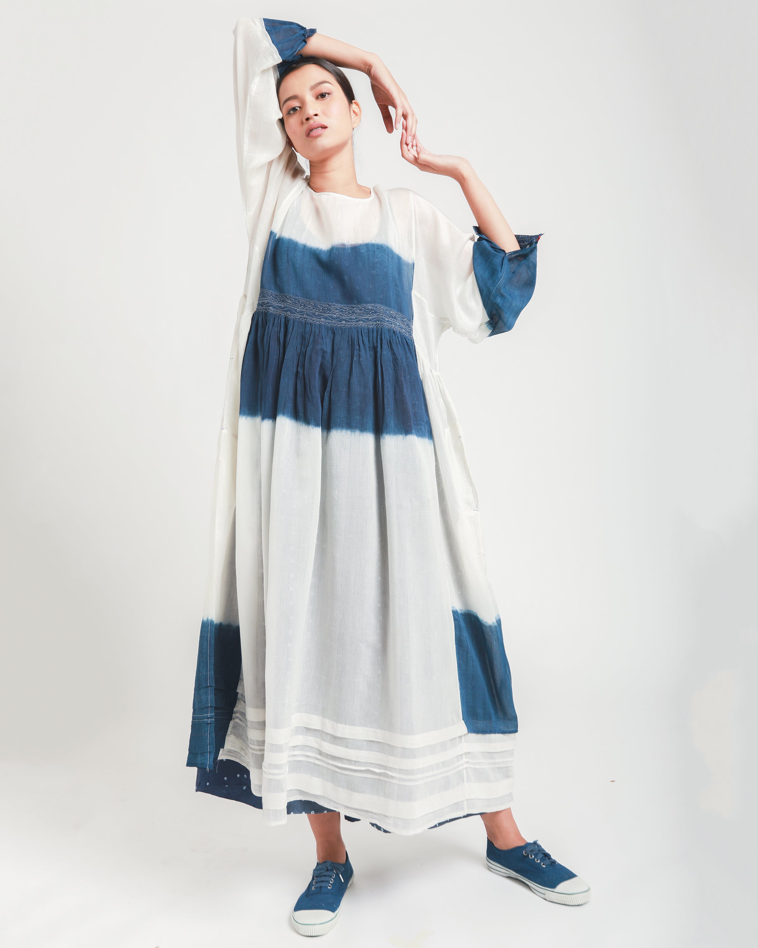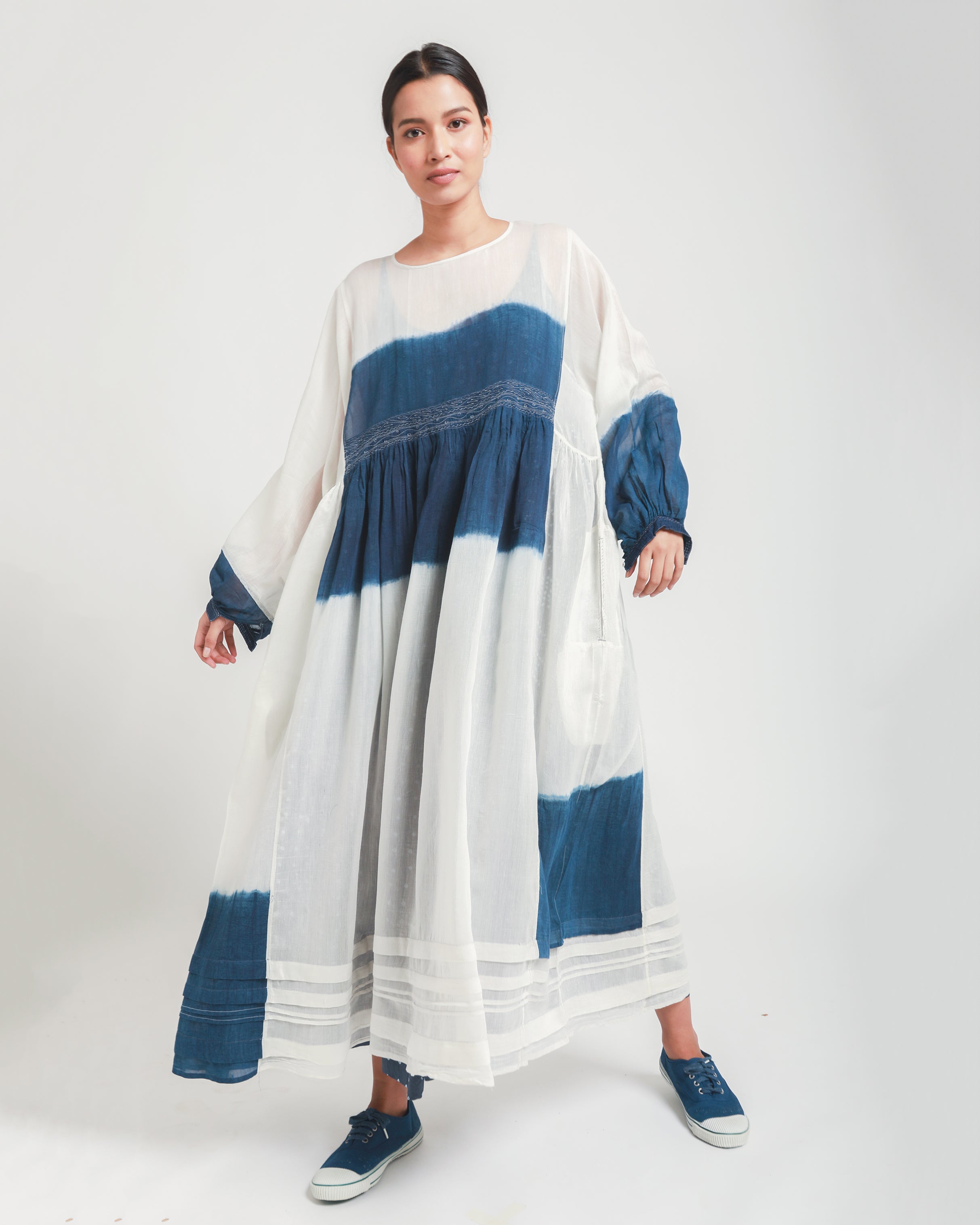 The Sabrina Dress, crafted in lightweight silk-cotton, features deep blue colorblocks along the sleeves, side gore, and under-bust panel. An embroidered waistline, round neckline, and full sleeves add gentle detail to the design. With its soft A-line silhouette, this dress offers a comfortable and relaxed fit.