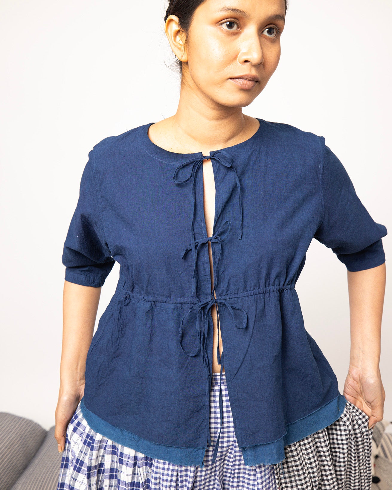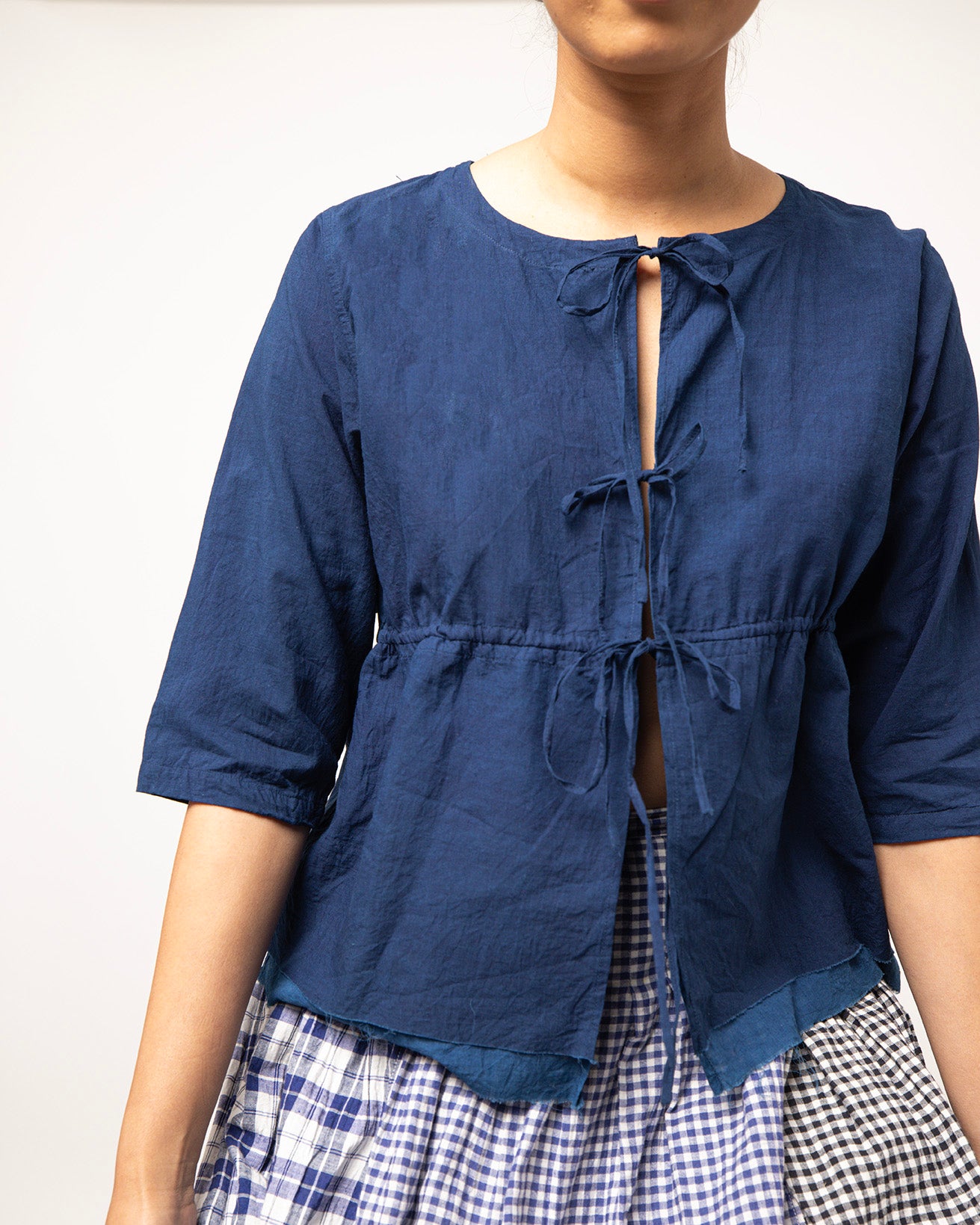 The Sailor Indigo Top, crafted in soft cotton, is naturally dyed in Indigo and features three front ties as its closure. Lightweight and easy, it is designed for a slim fit.
