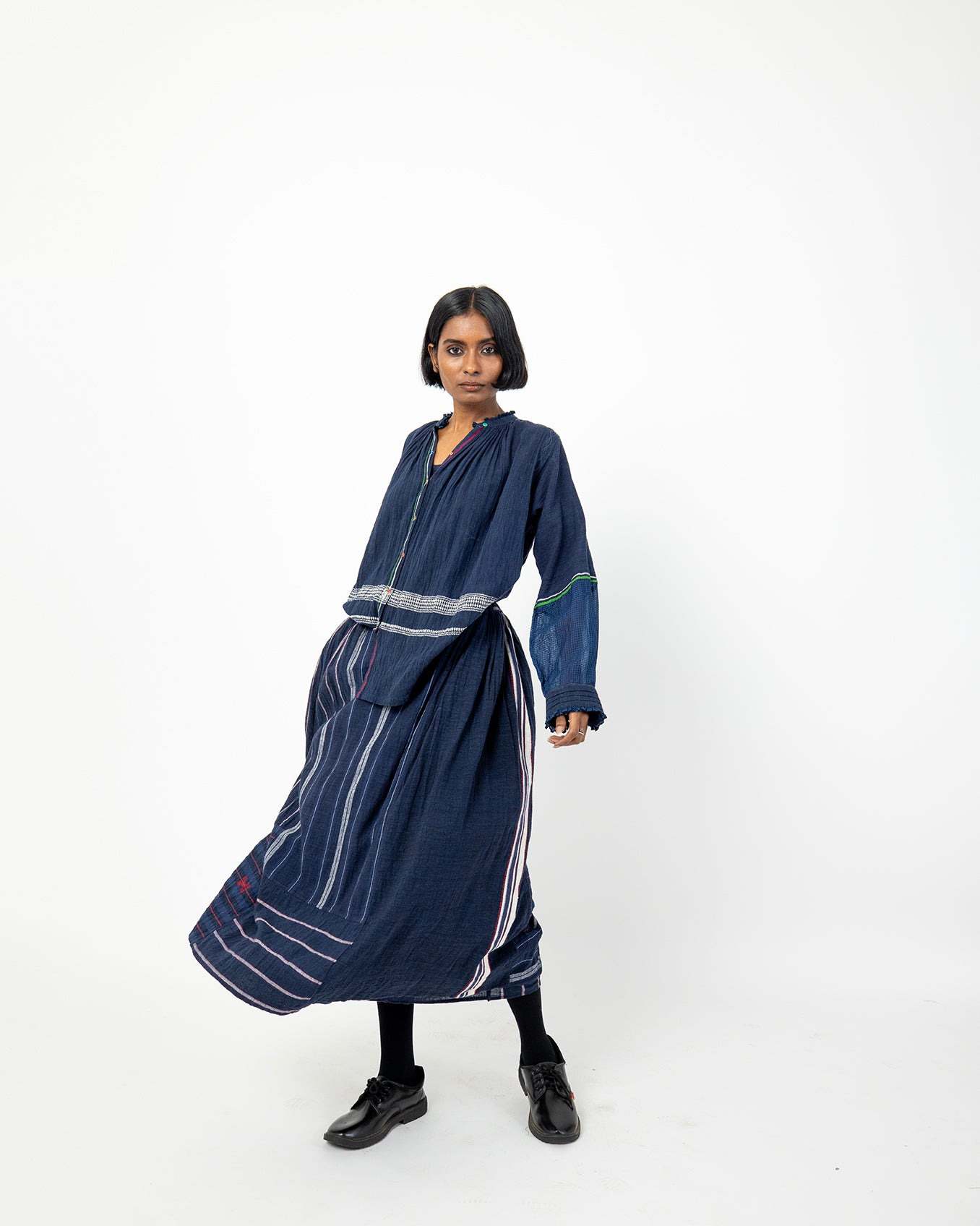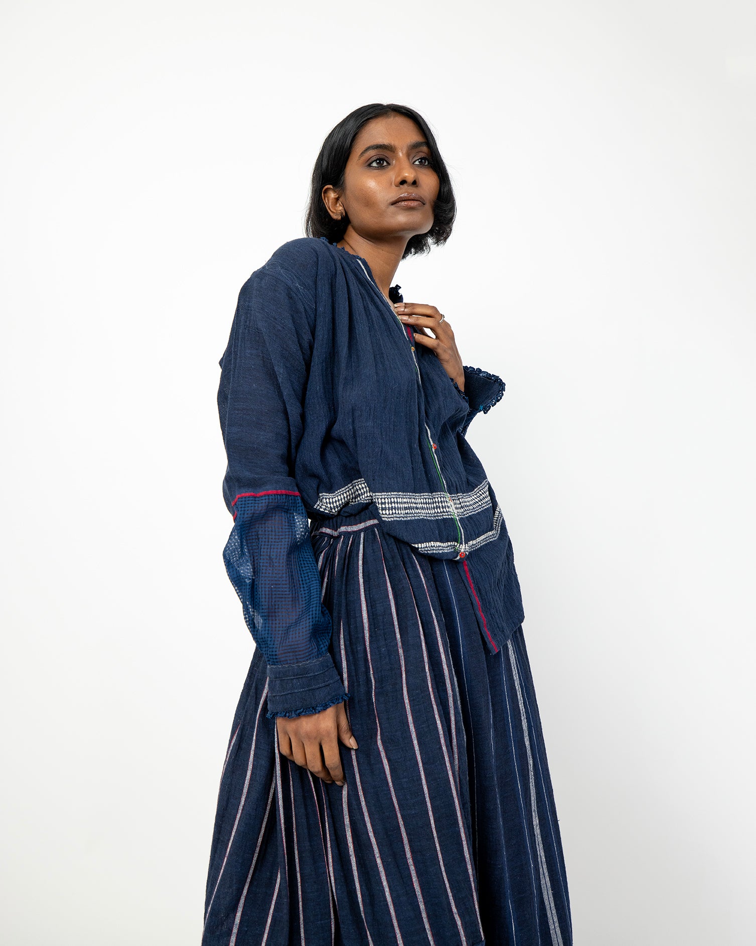 The Sameera Indigo Skirt, crafted in handwoven cotton from Gujarat, features gentle gathers at the sides with a flat waistband at the front and back for a clean, structured look. Designed with a play of vertical and horizontal lines, this lightweight skirt offers ease and understated elegance.