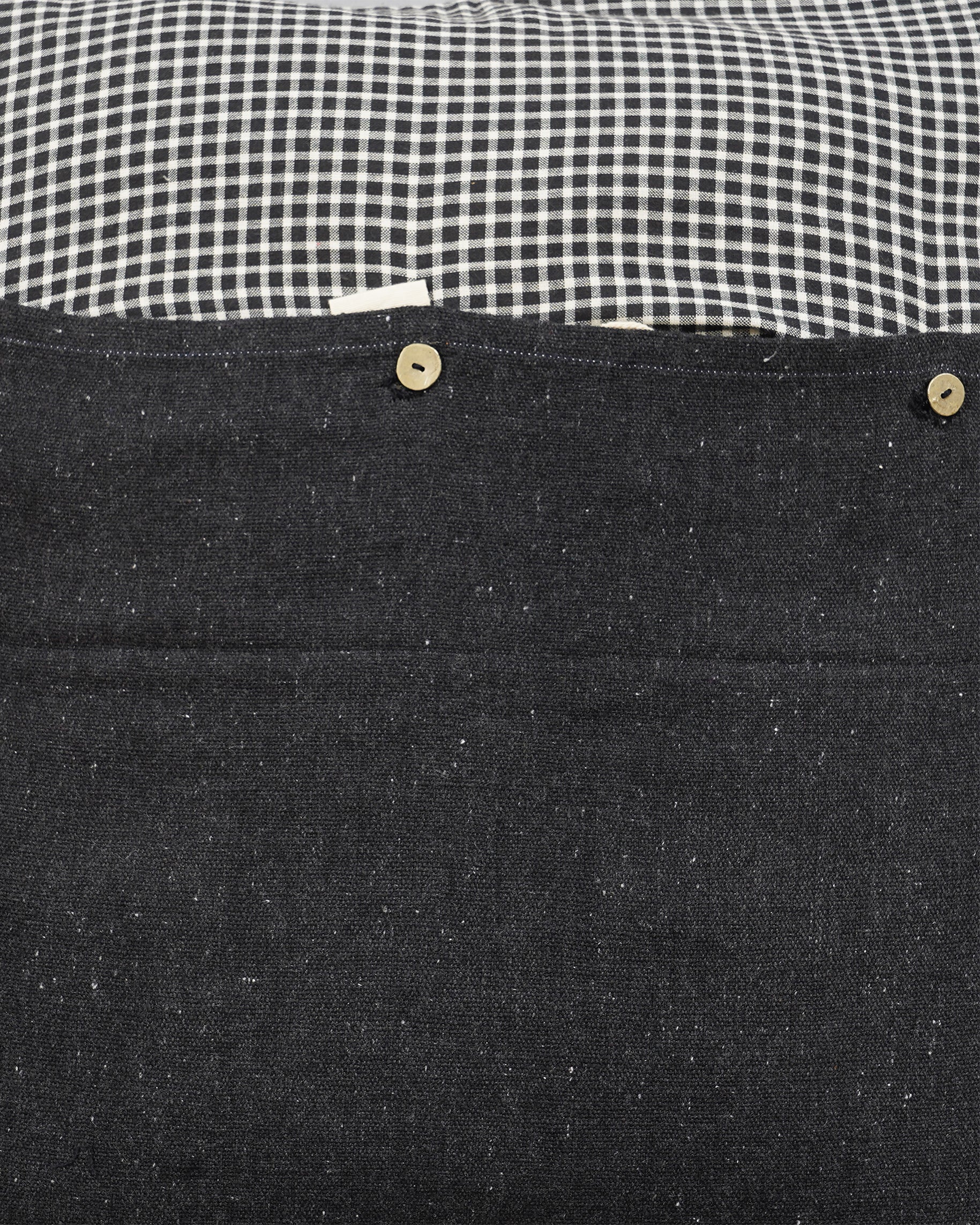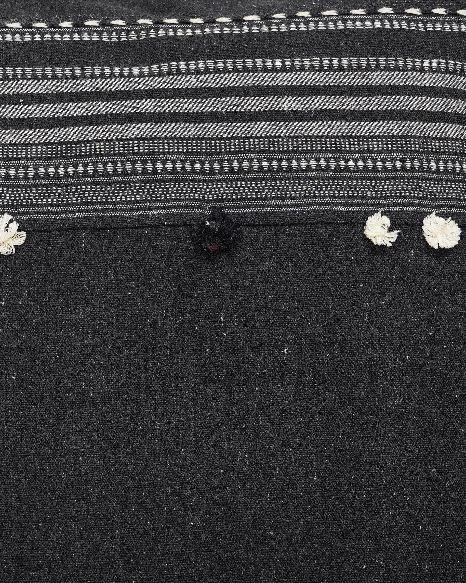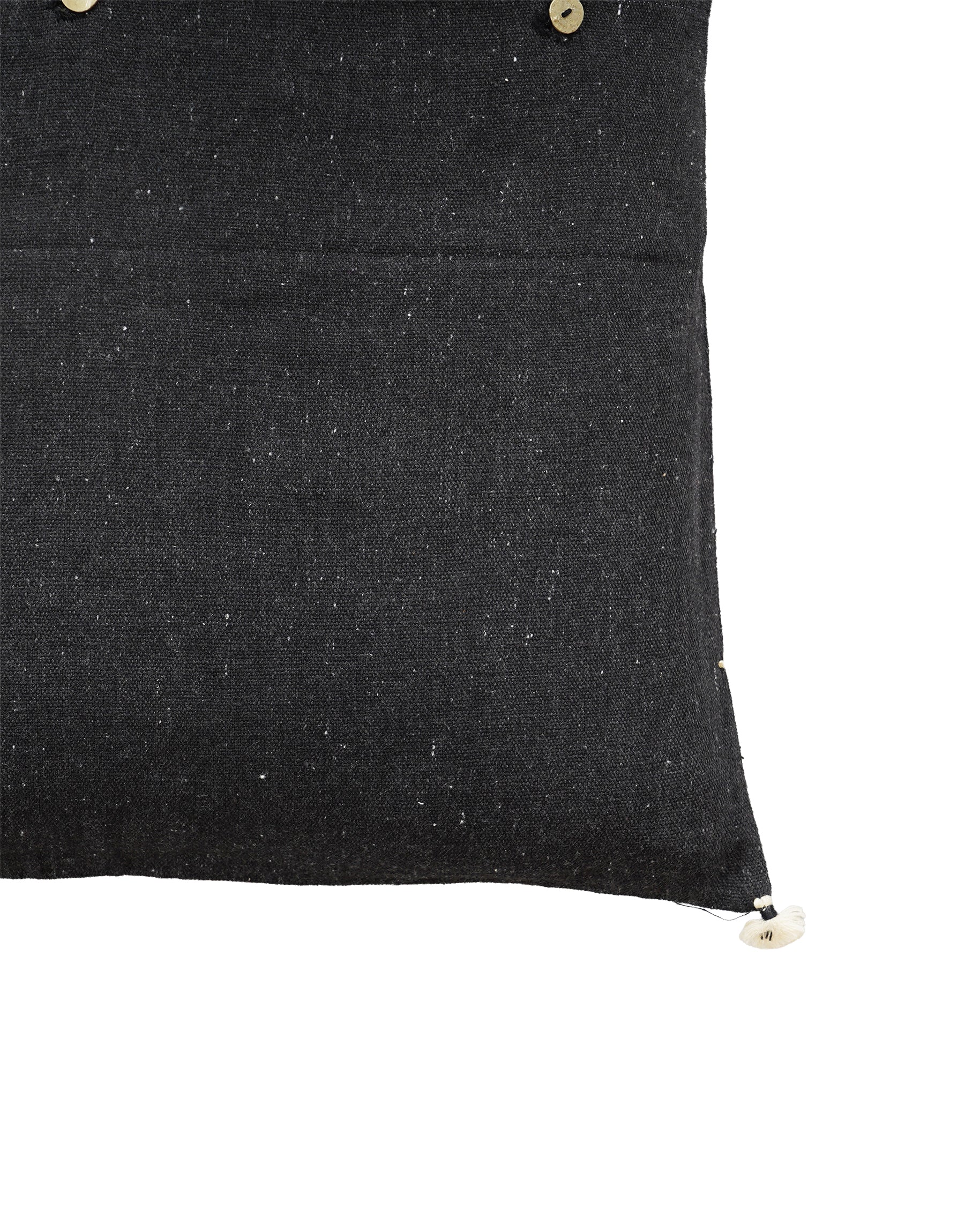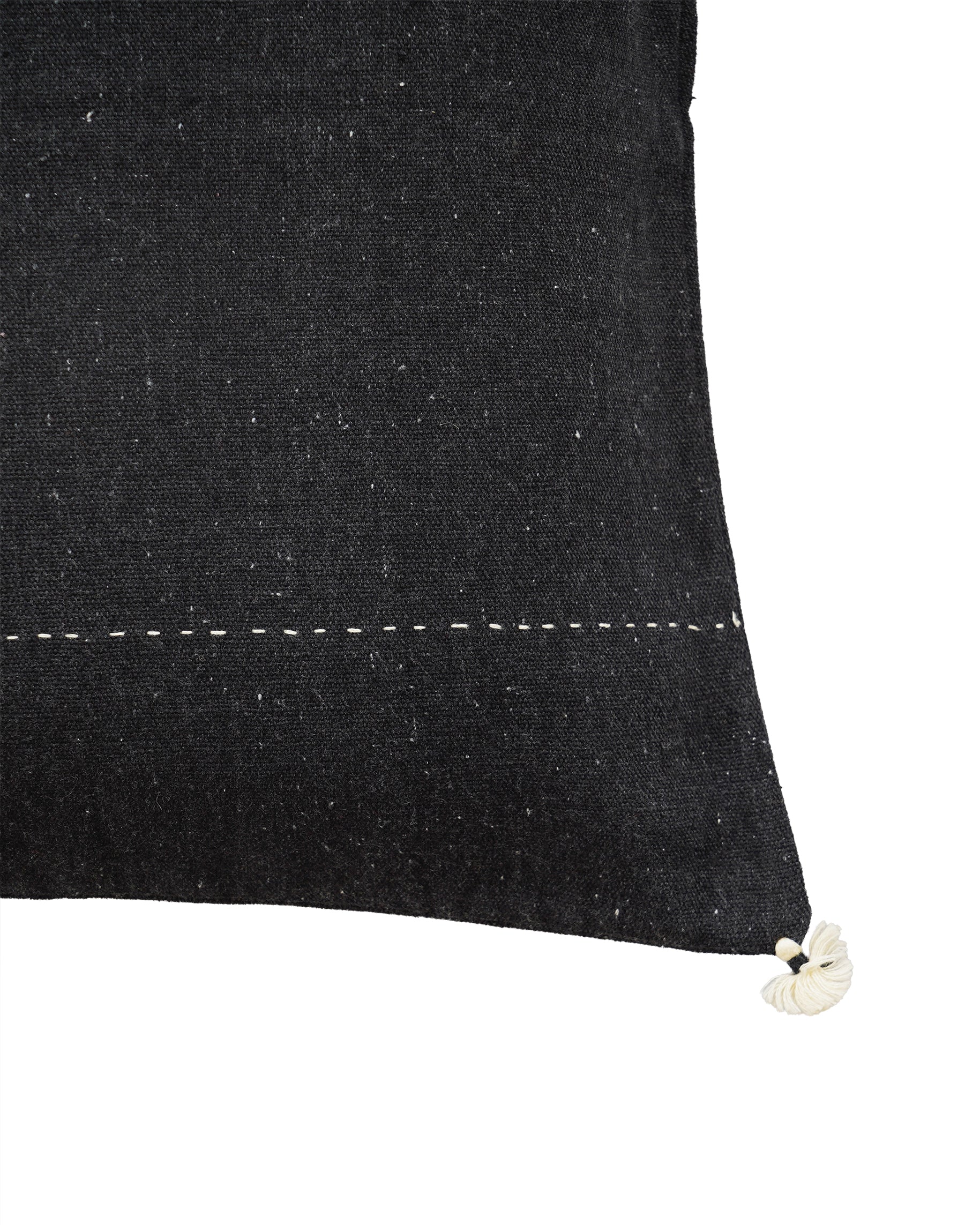 Evoking a sense of heritage, this handwoven cushion 'Saras' is a one-of-a-kind Injiri piece. Using the meticulous technique of bhujodi weaving and kala cotton, it offers a soft texture feel that’s timeless. Strong palette in a black base and tassles along the edges, add a unique touch to it. Add it to your collection for a touch of warmth and tradition that transcends trends.