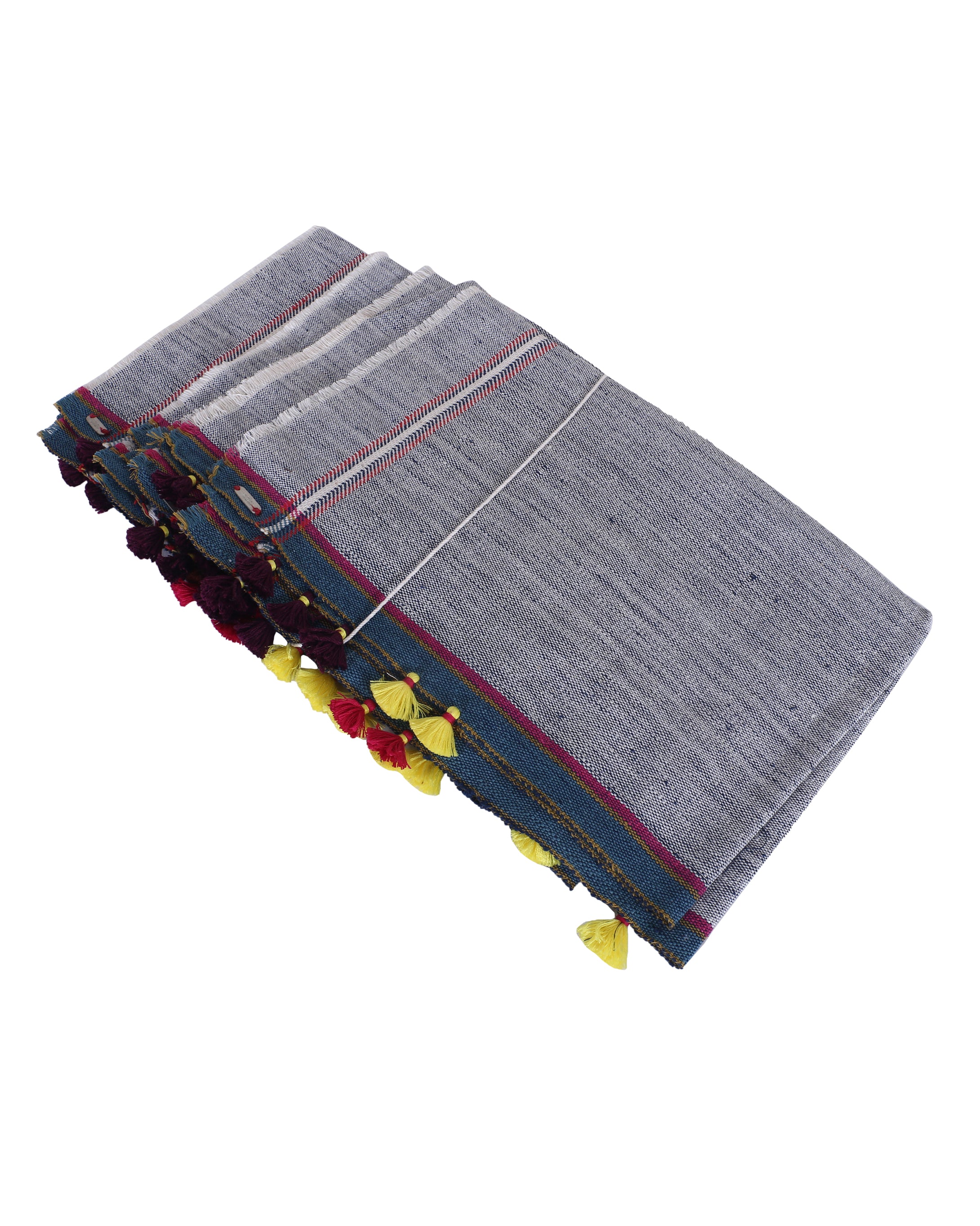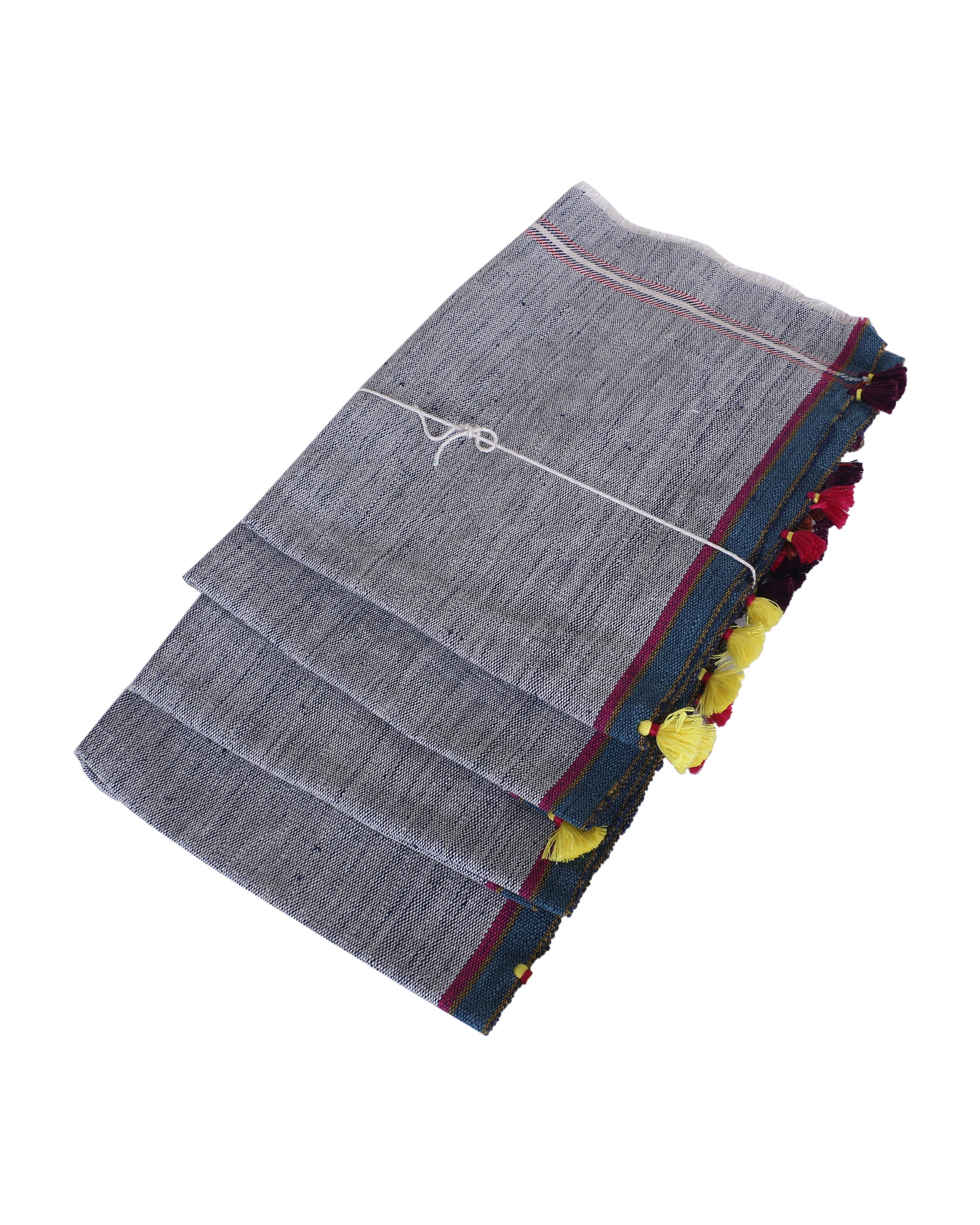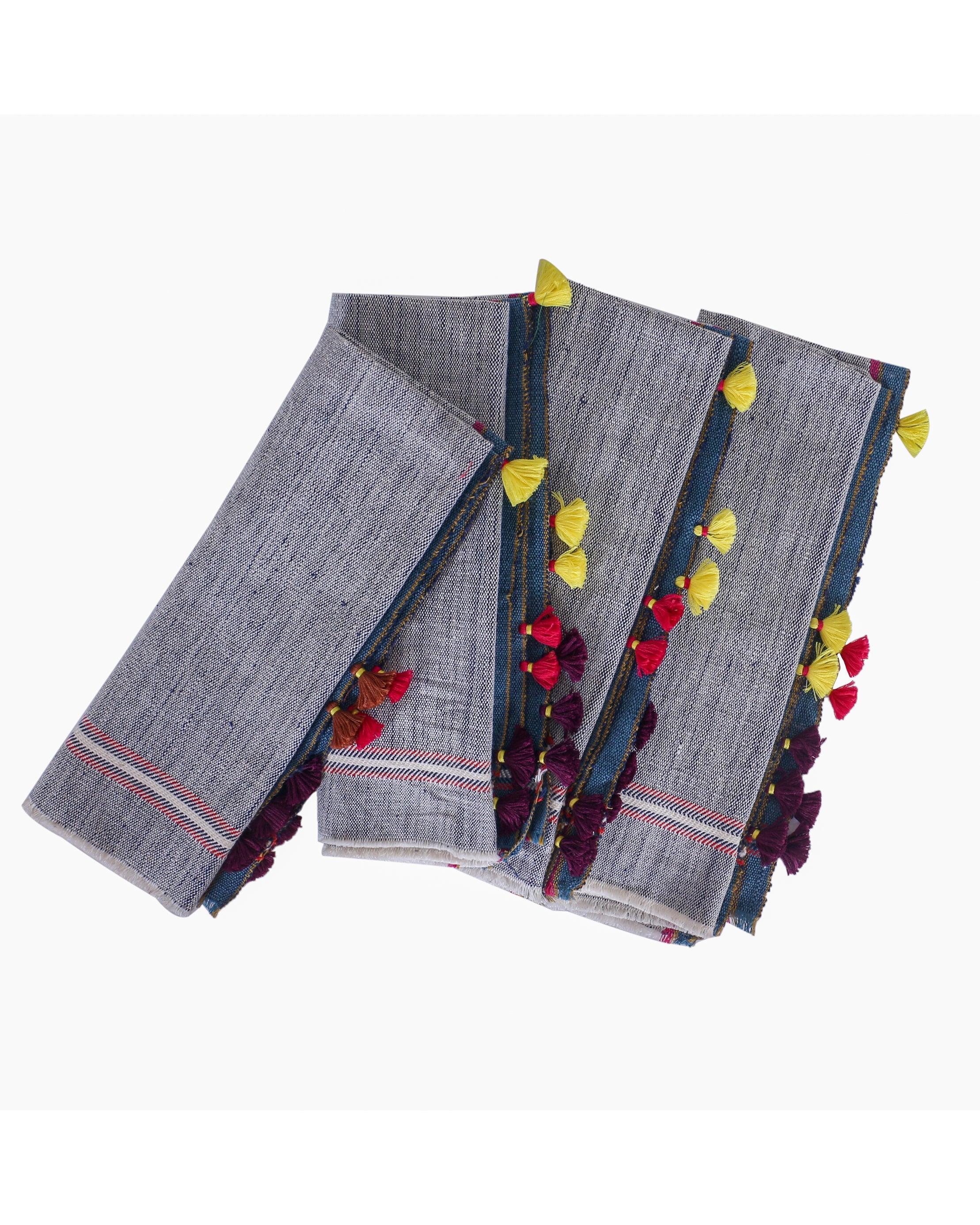 Crafted with 100% pure cotton, this 'Shilo' placemat showcases the intricate bhujodi weaving, known for its interesting texture and fluid design. The natural softness and breathability of the fabric are complemented by delicate stripes. Hand-tied tassels on the edges add a playful yet refined finishing touch, making this mat a functional piece of contemporary design