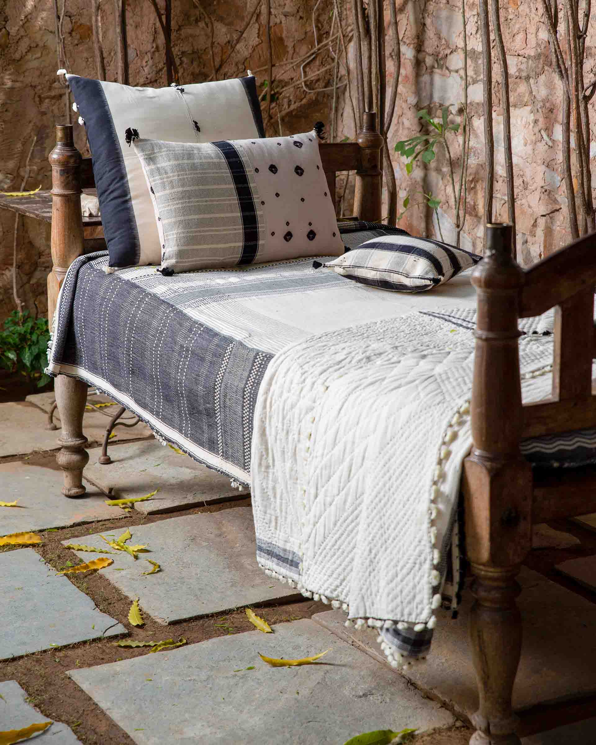 Silaayi' quilt is crafted from 100% pure cotton, that feels soft against the skin and in functional to store. It has been crafted using the bhujodi technique and it features strippes pattern along with tassels on the edges. The palette resembles galaxy, hues of white, black and grey. It's ideal for those who appreciate muted craft elements in their homes.