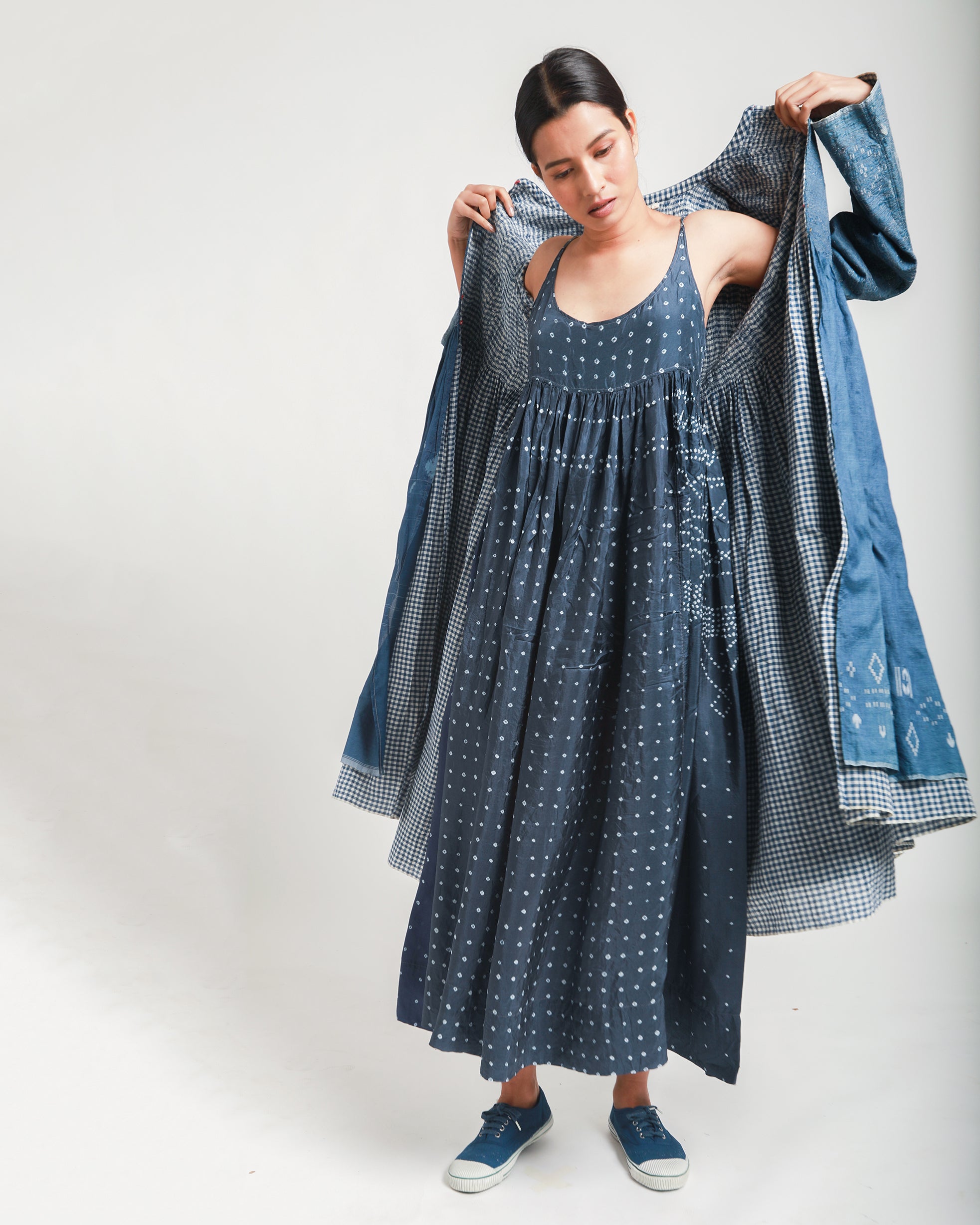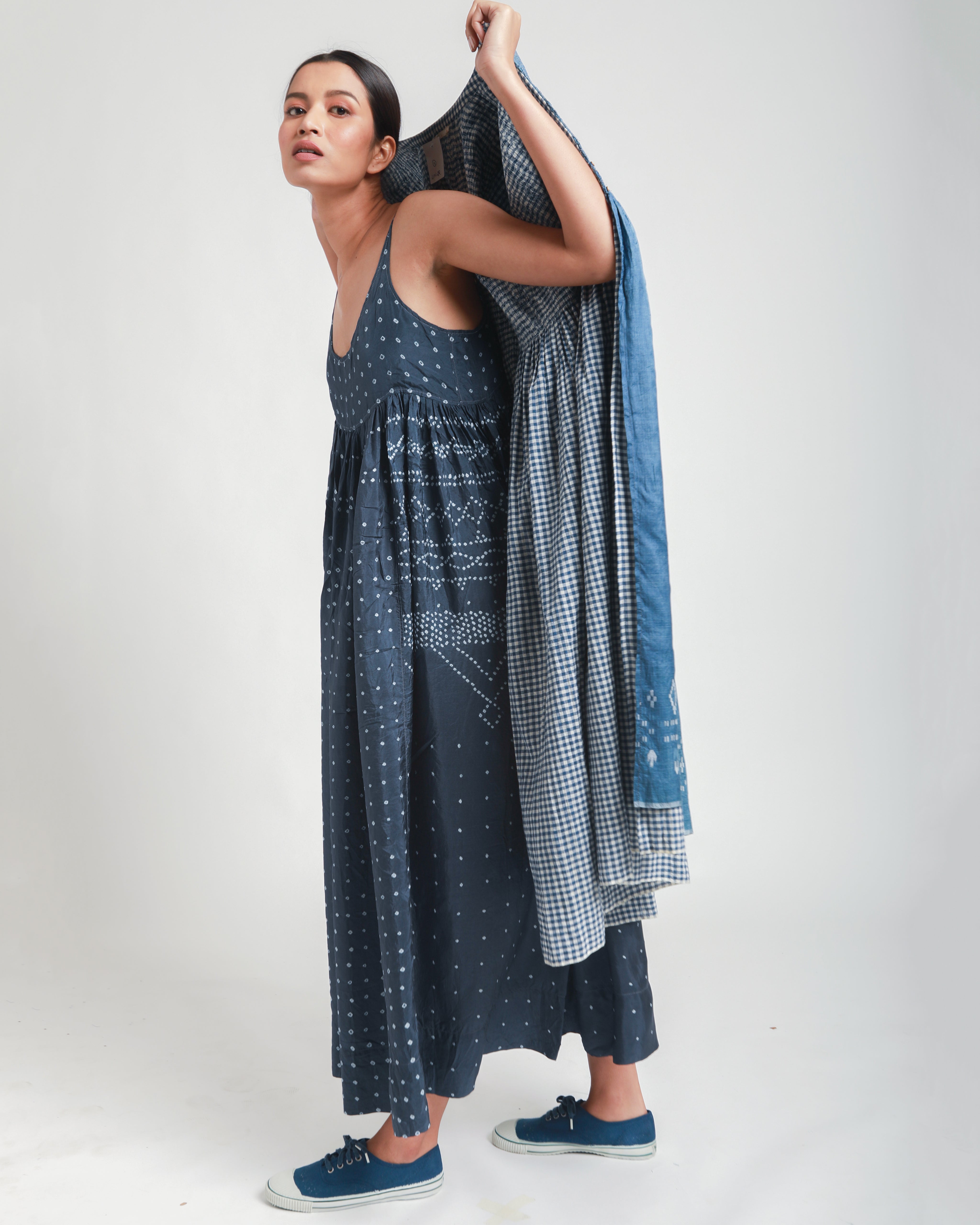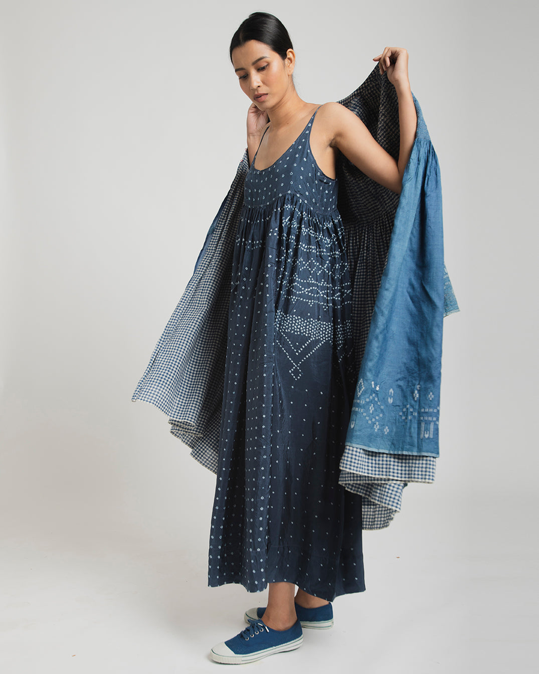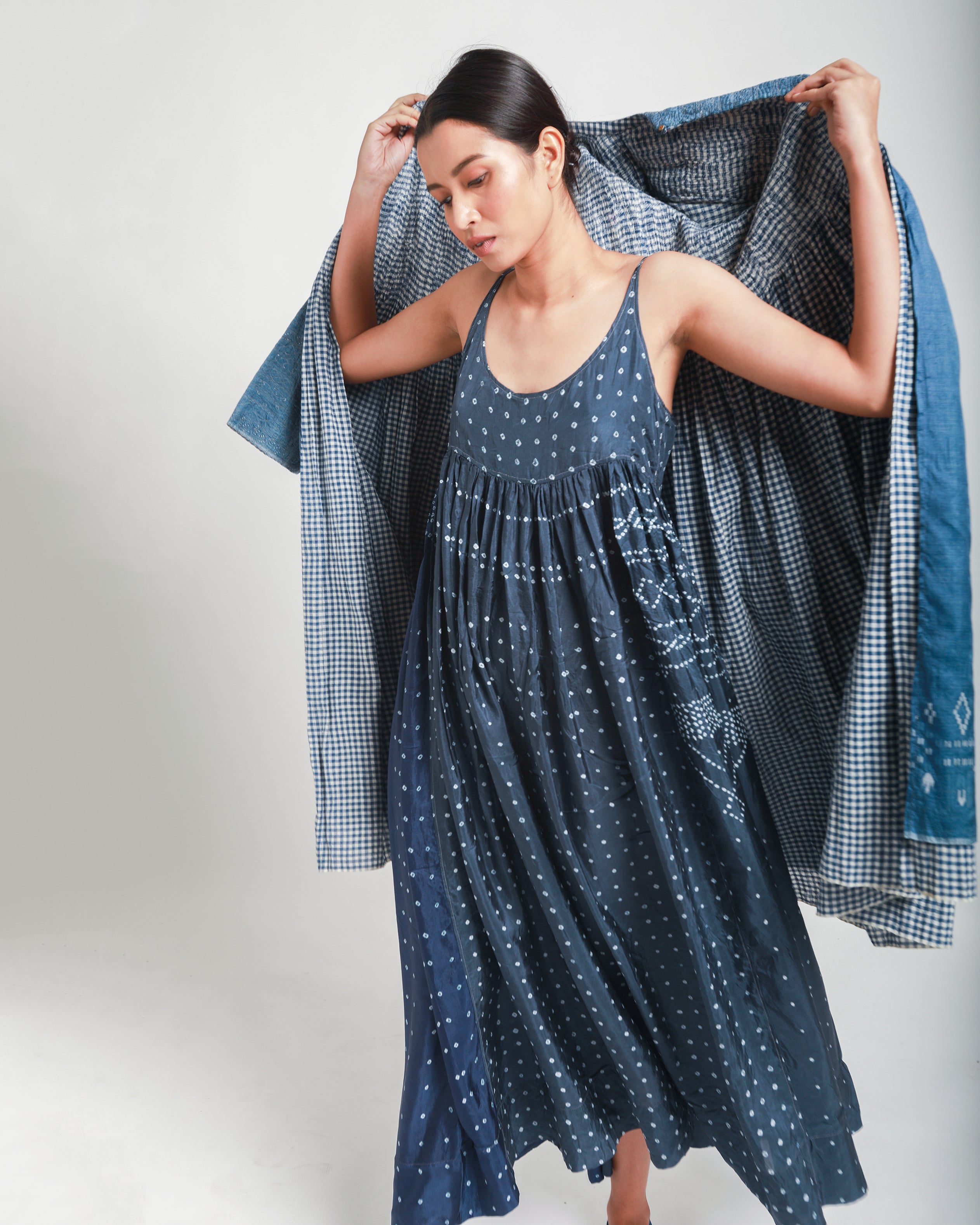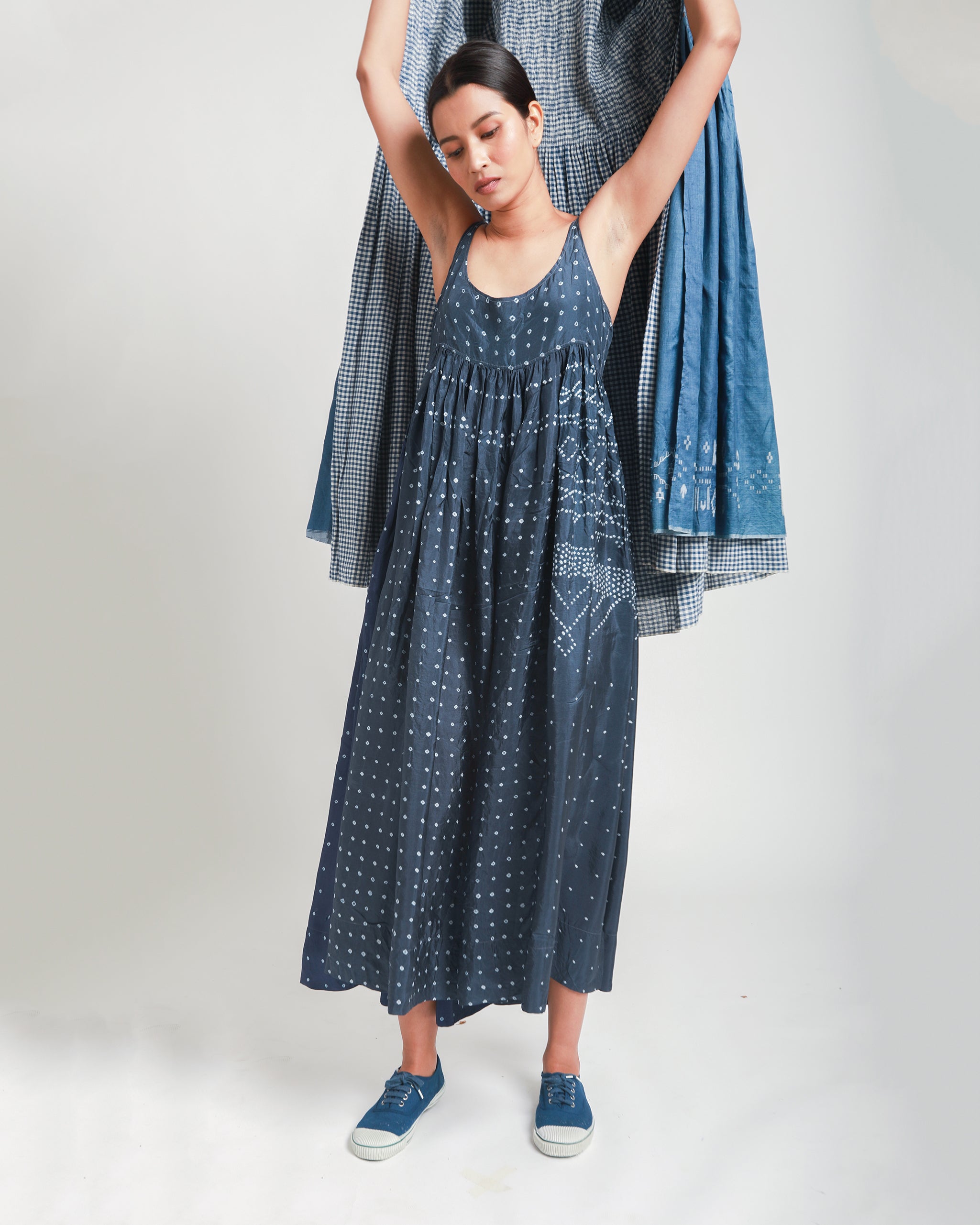 The Sophia Slip Dress, crafted in soft silk, features a deep indigo base adorned with white Bandhani dots in varied arrangements. Designed with a deep U-neckline and delicate gathers at the waist, it offers a fluid silhouette for an effortless, refined fit. True to size.