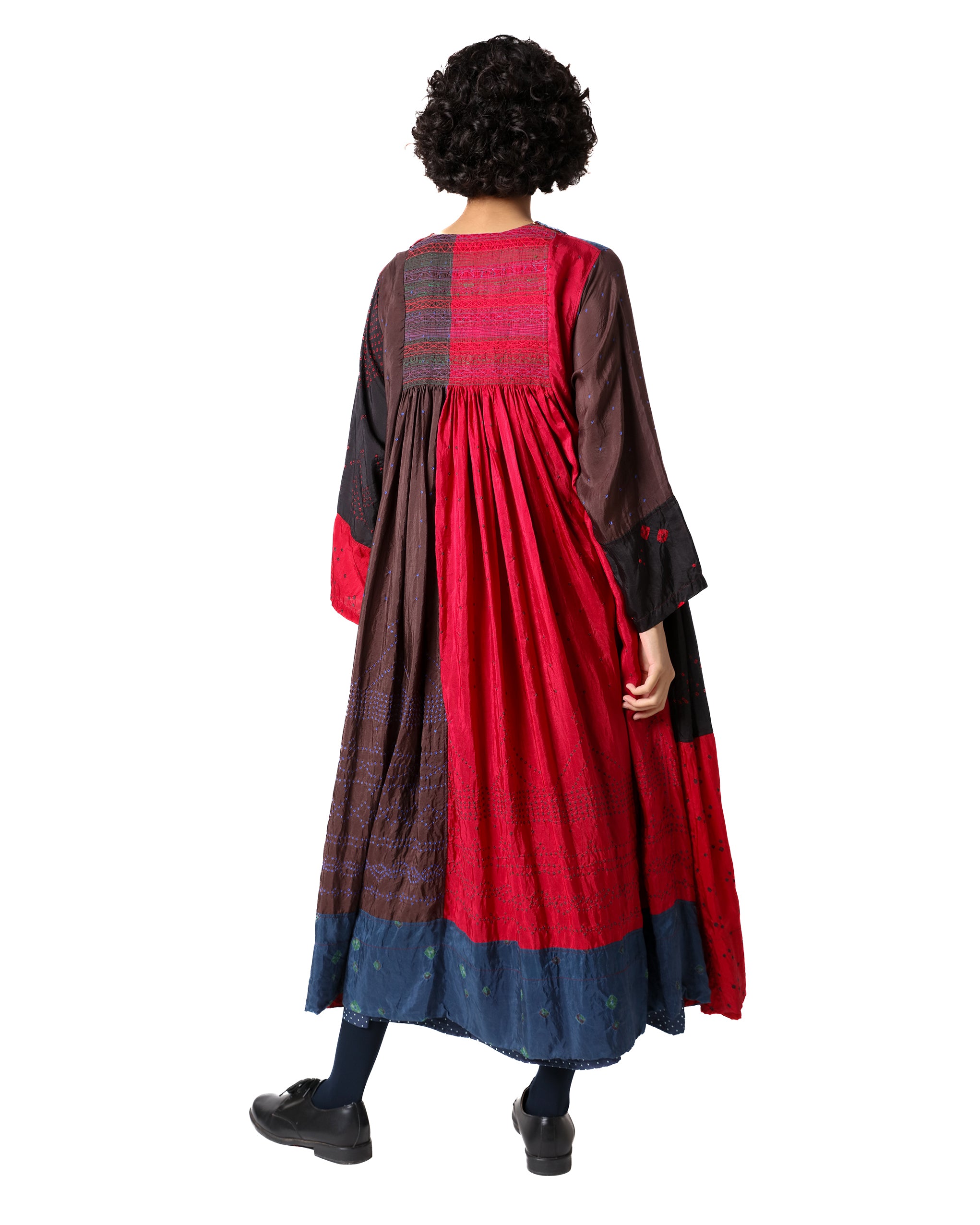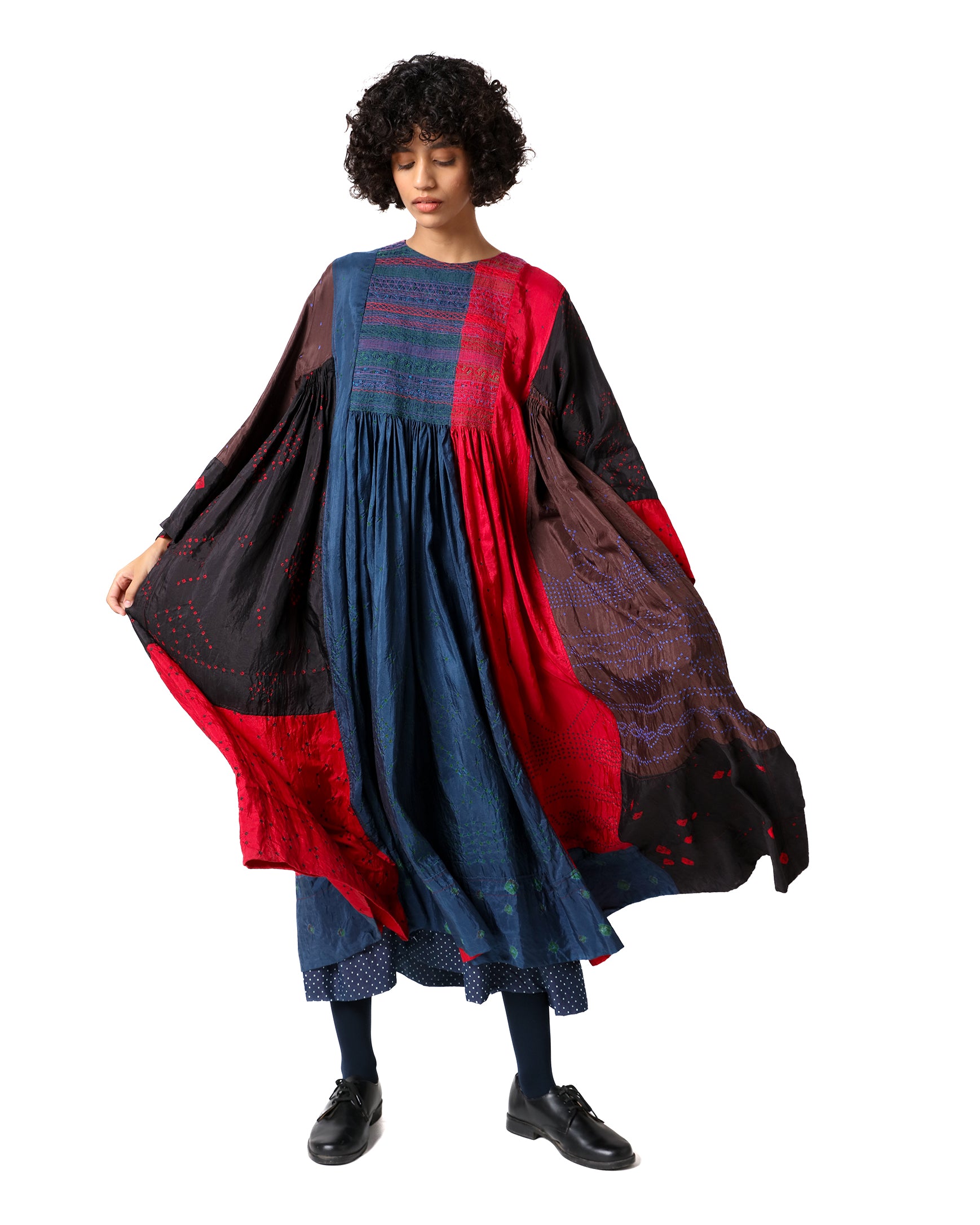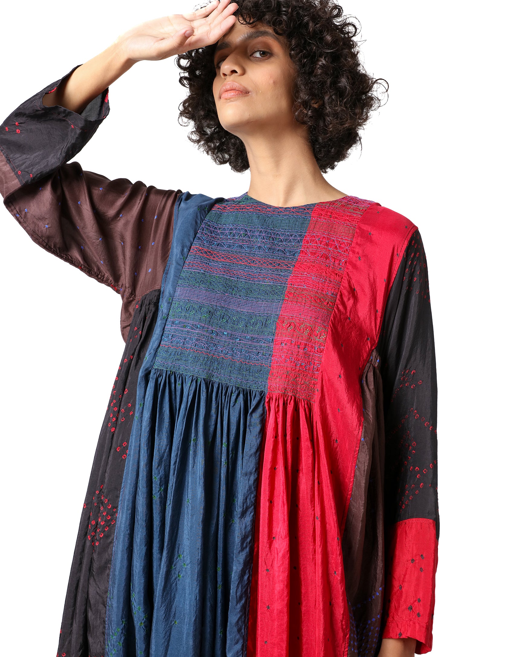 Stok Dress in silk, crafted using the hand tie-dye Bandhani technique. It features a closed round neckline, A-line sleeves, and gathered detailing at the waist. Adorned with bandhani dots in red, blue, brown, and black, with tagayi embroidery on the yoke, it creates a graceful, textured, and handcrafted silhouette.