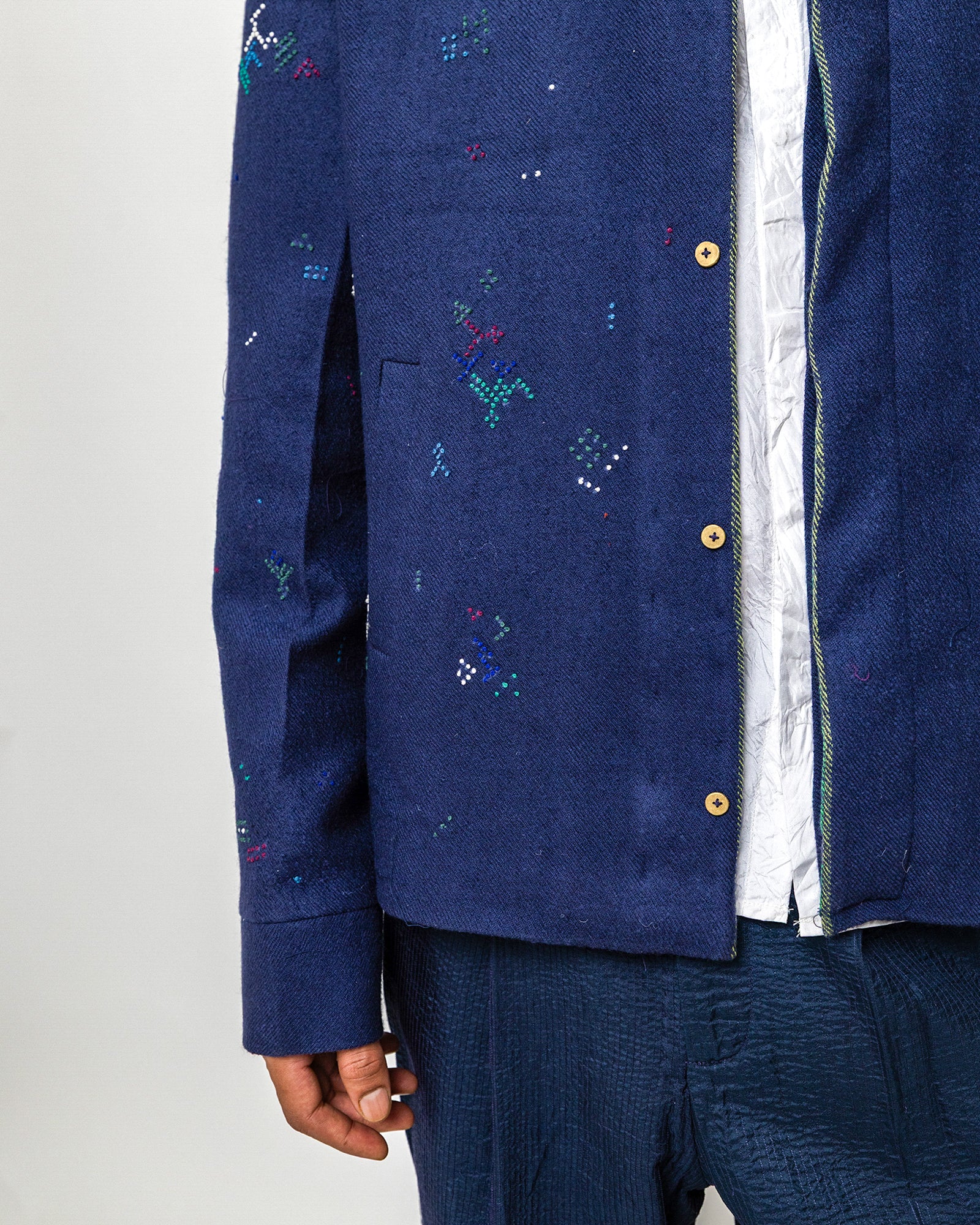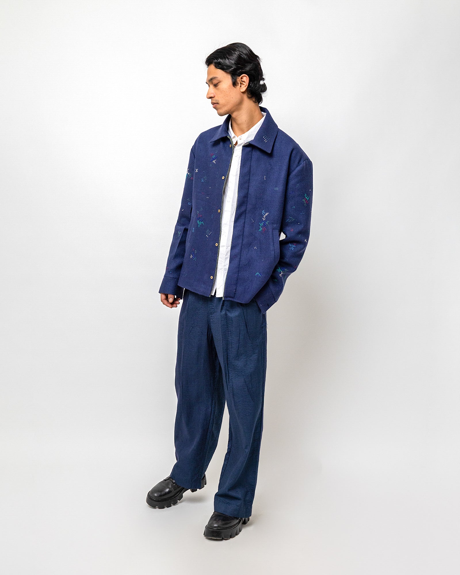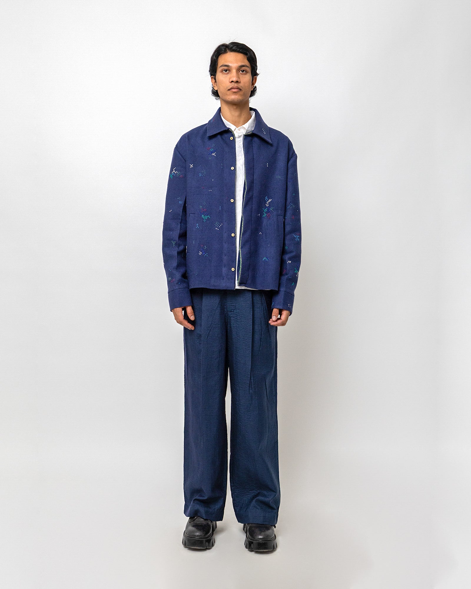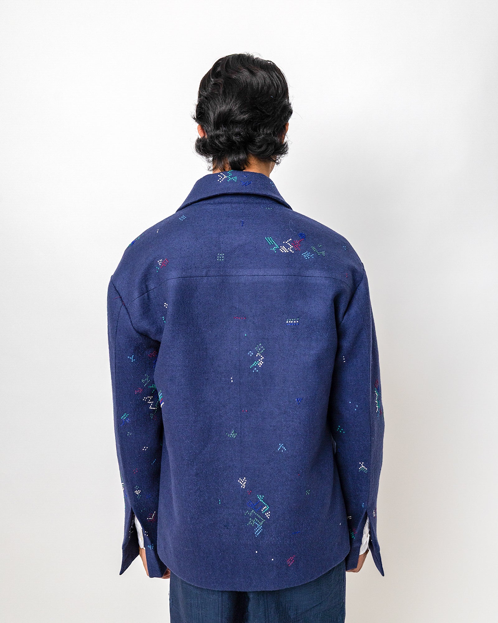 The Taarak Jacket is made in wool and hand-embroidered in tonal and contrast stitches across a deep indigo base. Designed in a relaxed, easy silhouette, it features a classic collar, a concealed placket, and welt pockets that lend quiet structure.