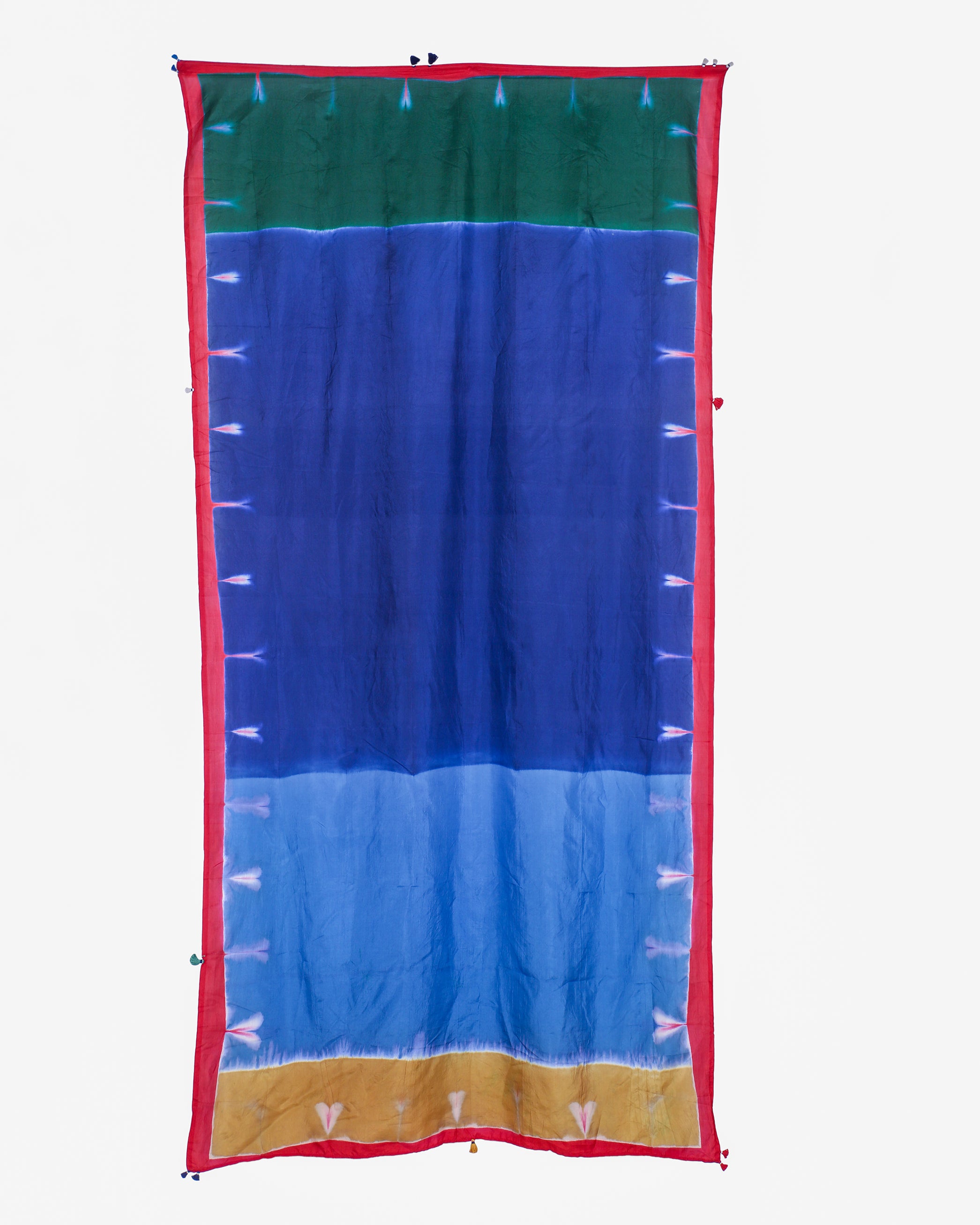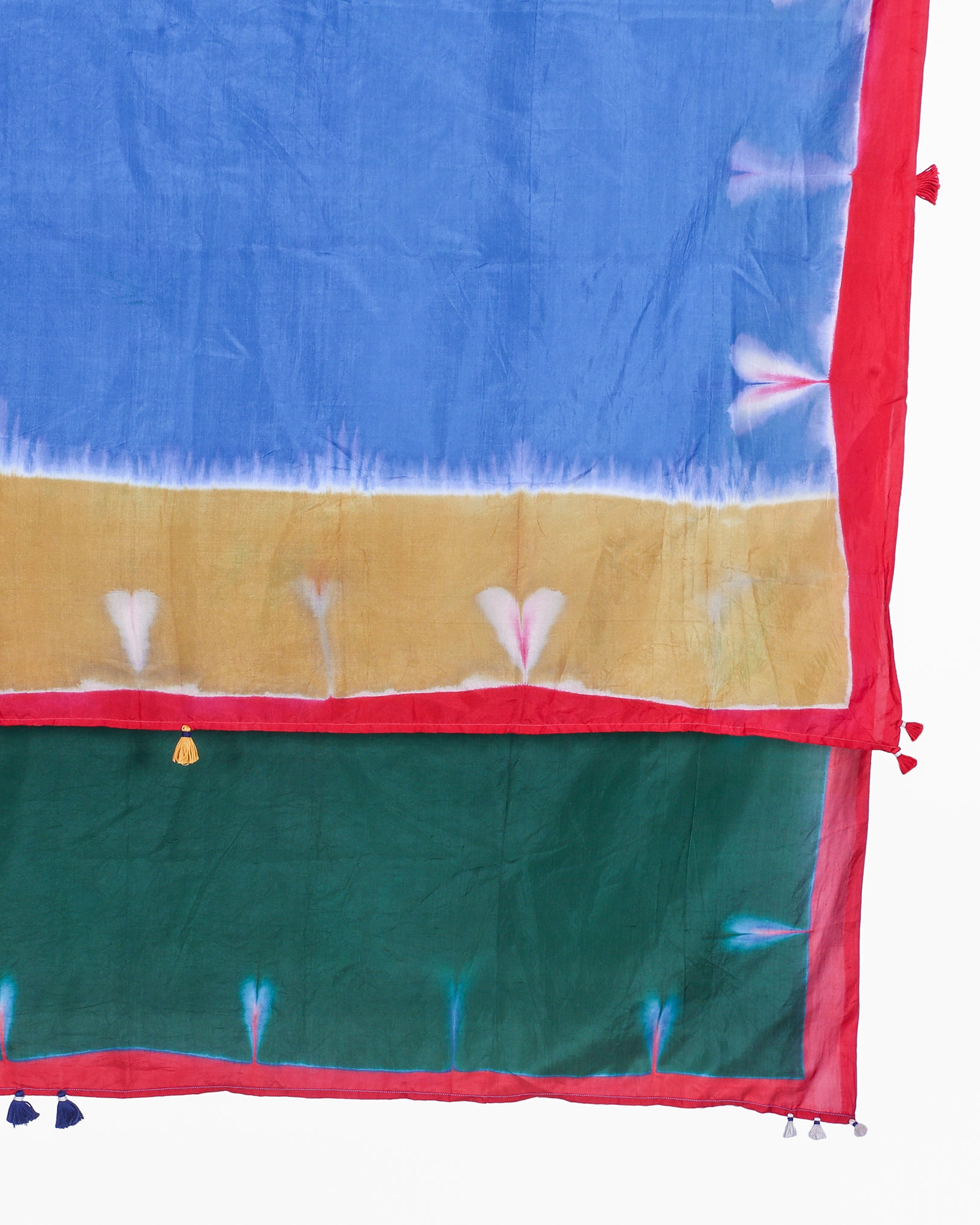 ikkat, extra weft, clamp-dye- are all located in different geographical locations. We monitor quality of these in our capacity but being handmade there do come minor errors which we do not treat as defects, sometimes a Bandhani dot may leave a slight mark or extra weft may cause slight color bleeding . These are not defect for us but features of working with handcrafted products.
