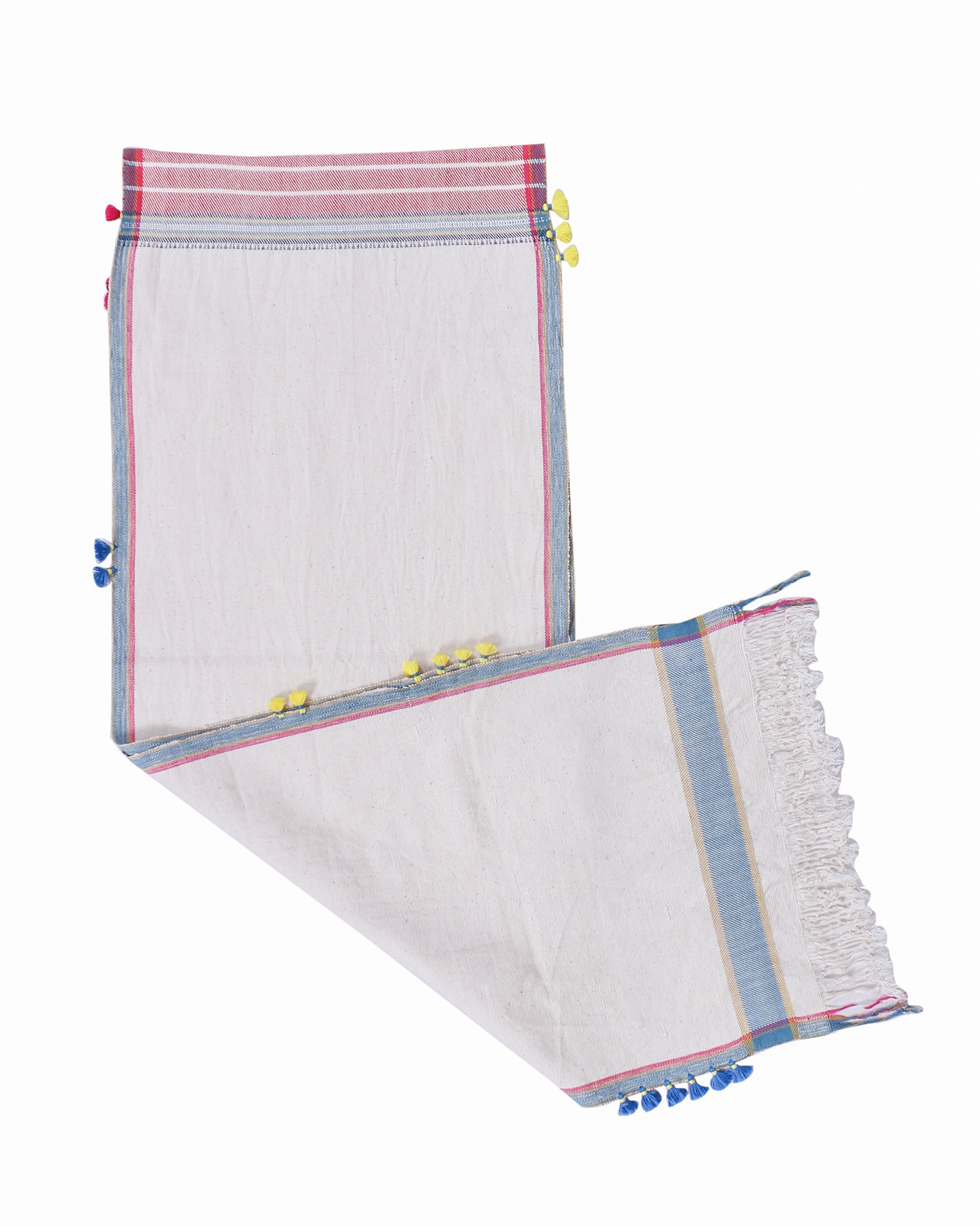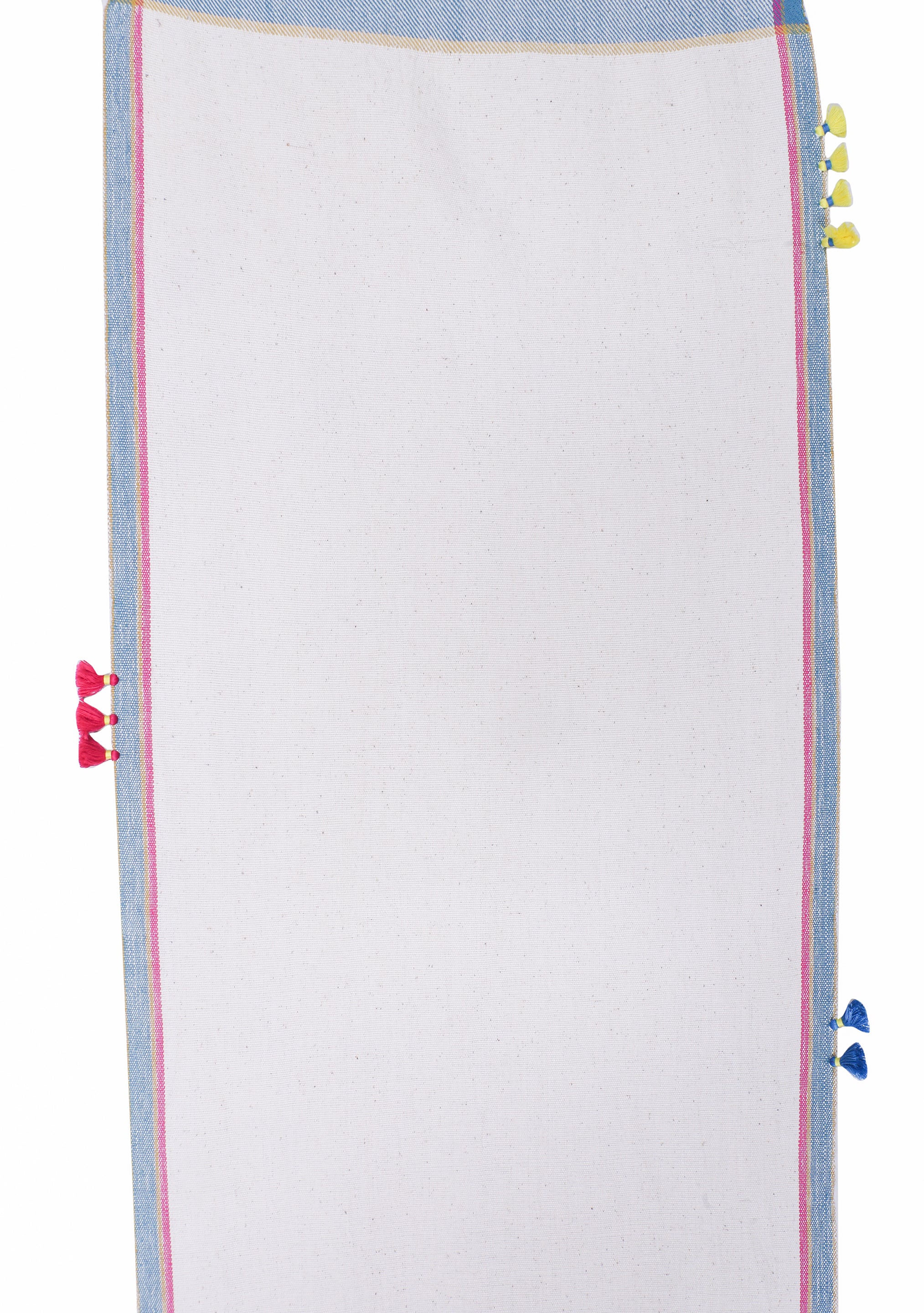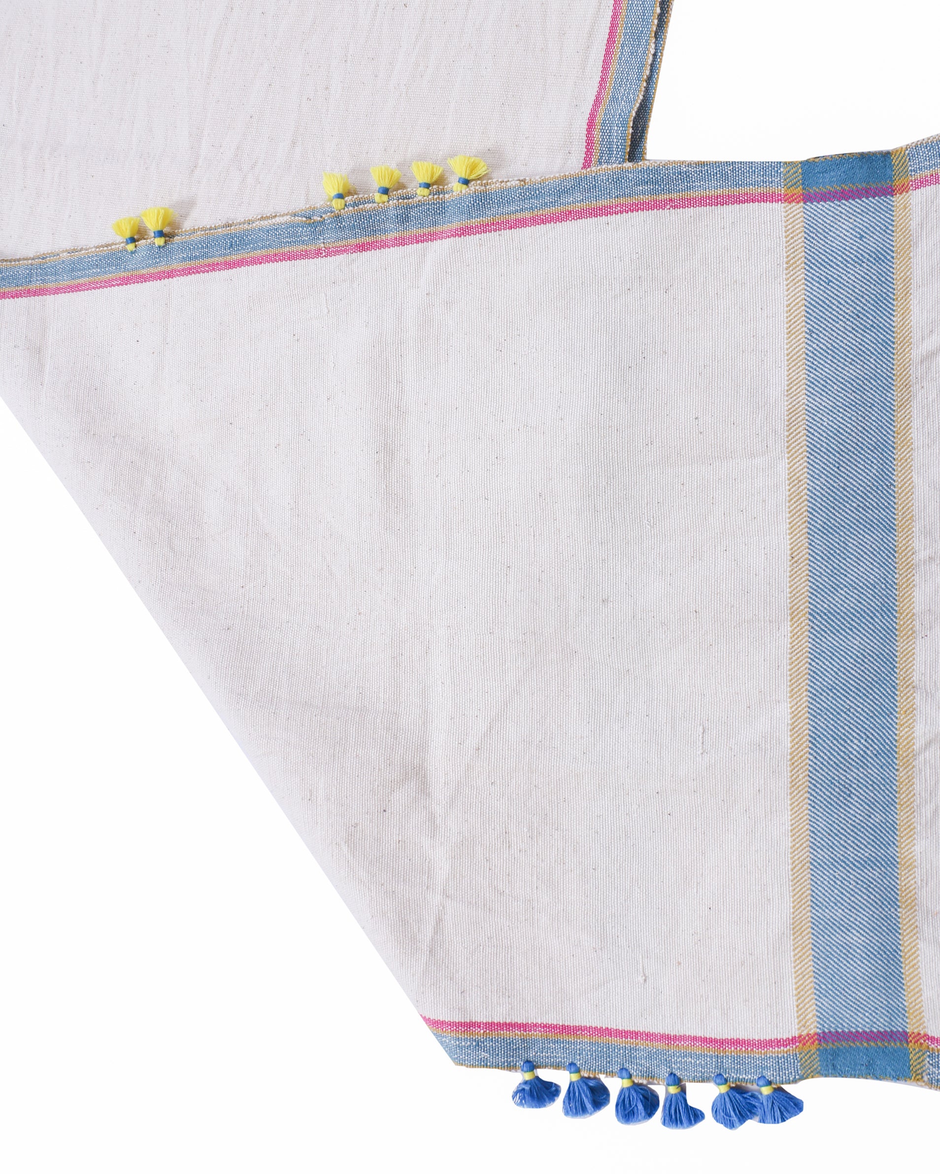 Bring a touch of heritage into your home with this cotton runner, "Takht' featuring exquisite Bhujodi weaving. The rich, handwoven details on pure cotton fabric create a timeless look, while the tassel edging adds an element of fun and whimsy. Ideal for layering over a neutral table or placing at the foot of your bed for a soft contrast with bed linens. It’s a versatile piece that adapts effortlessly to various styling needs.