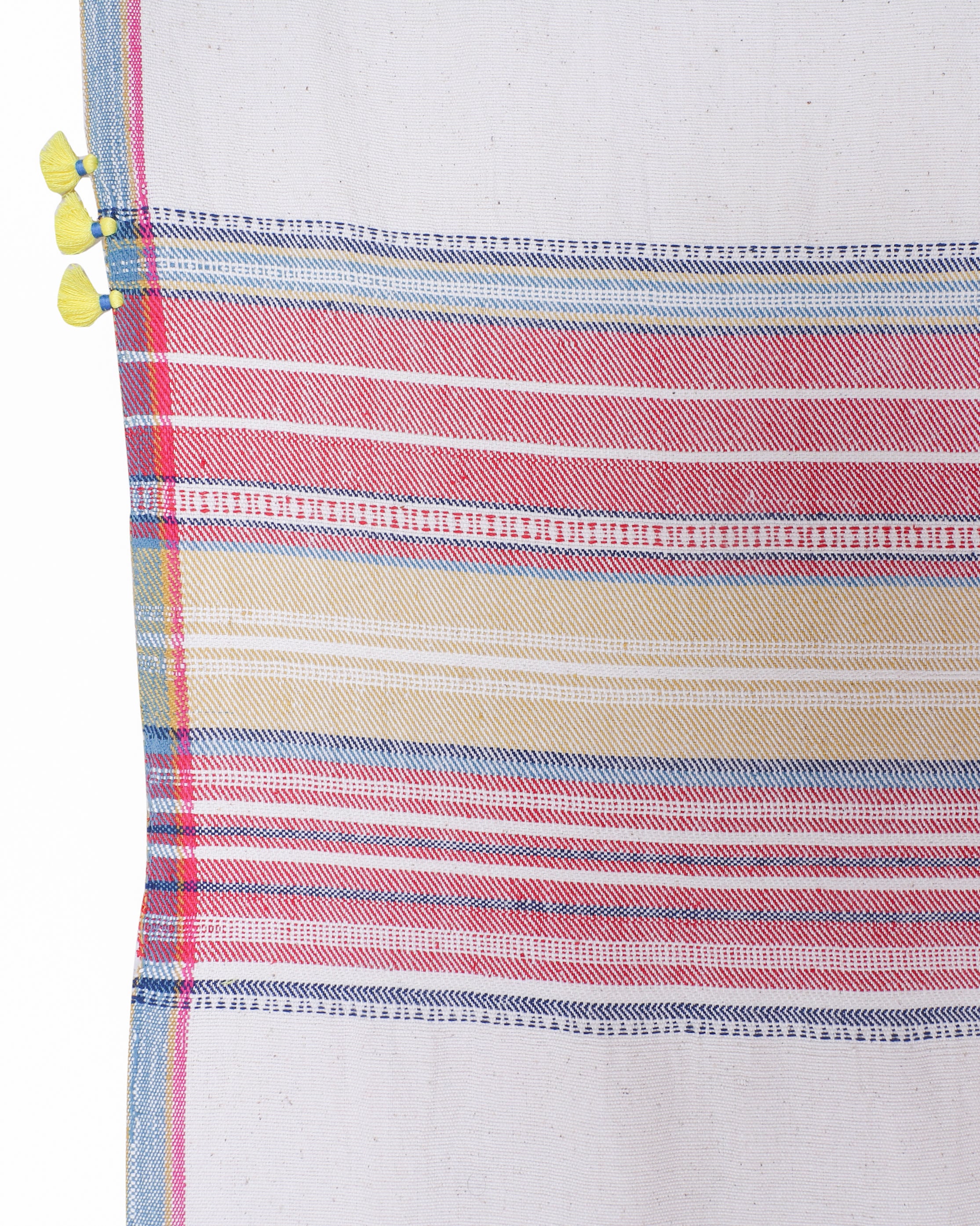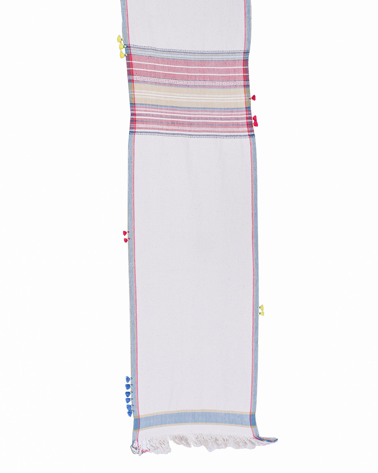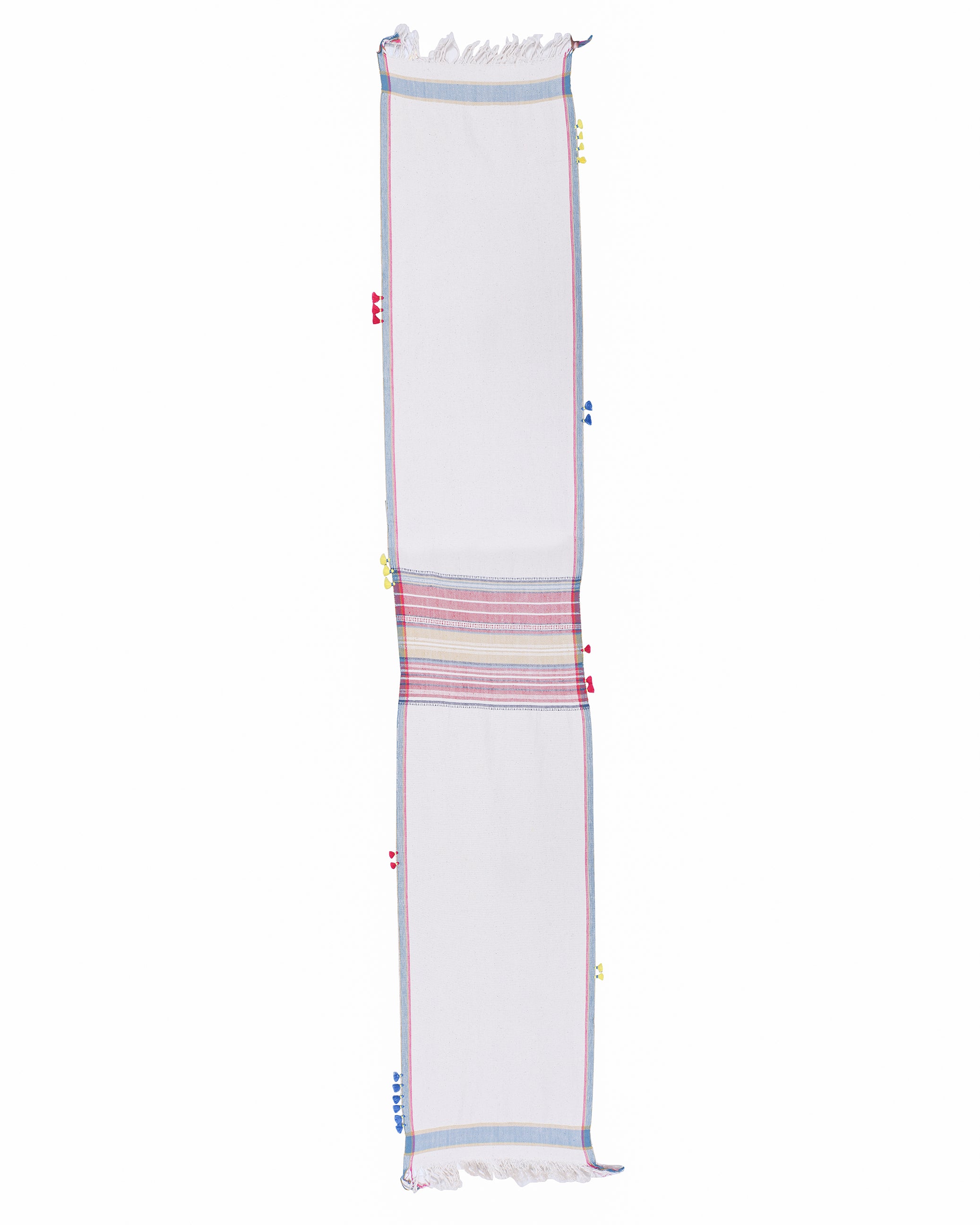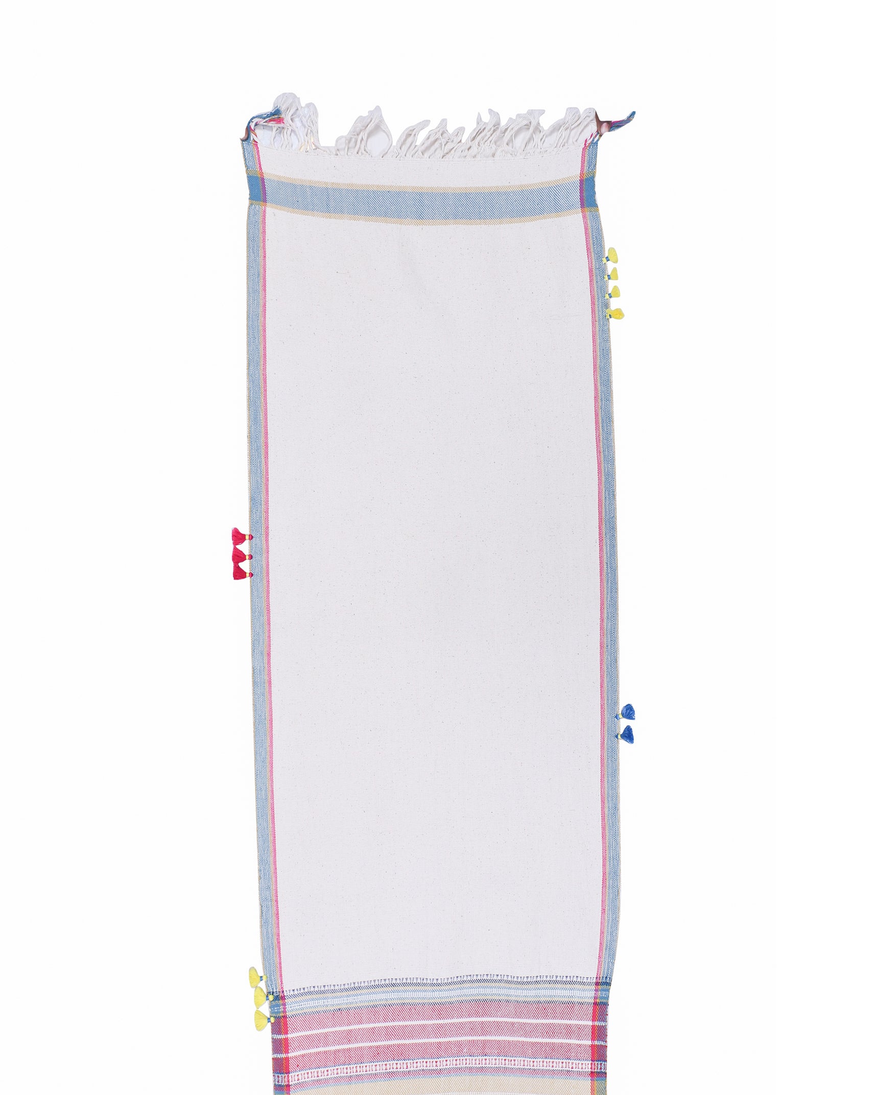 Bring a touch of heritage into your home with this cotton runner, "Takht' featuring exquisite Bhujodi weaving. The rich, handwoven details on pure cotton fabric create a timeless look, while the tassel edging adds an element of fun and whimsy. Ideal for layering over a neutral table or placing at the foot of your bed for a soft contrast with bed linens. It’s a versatile piece that adapts effortlessly to various styling needs.