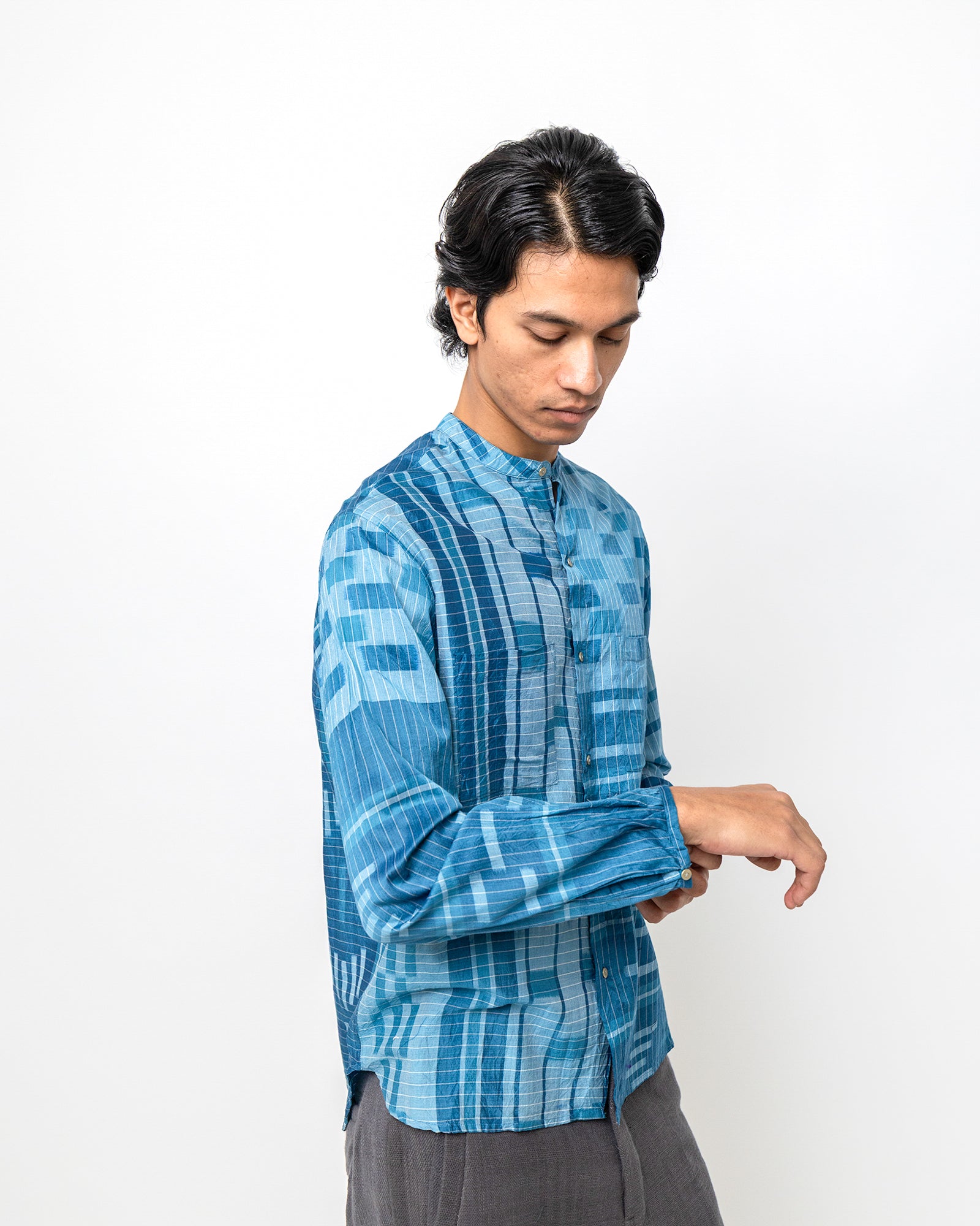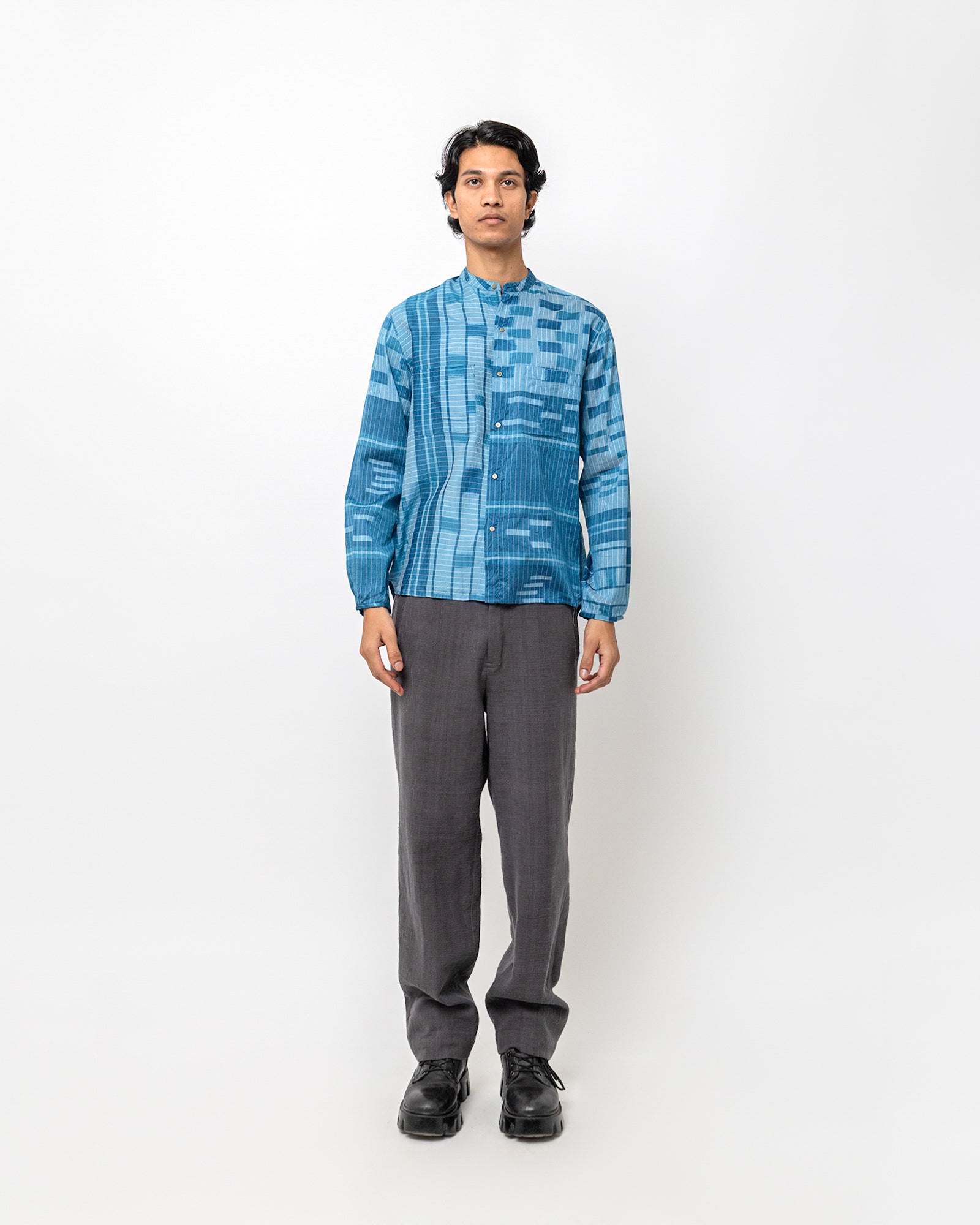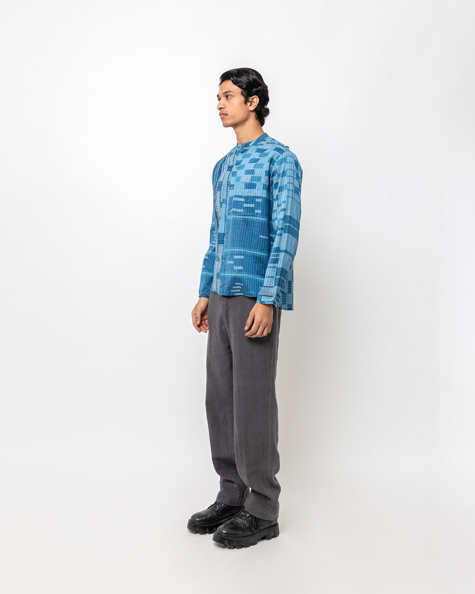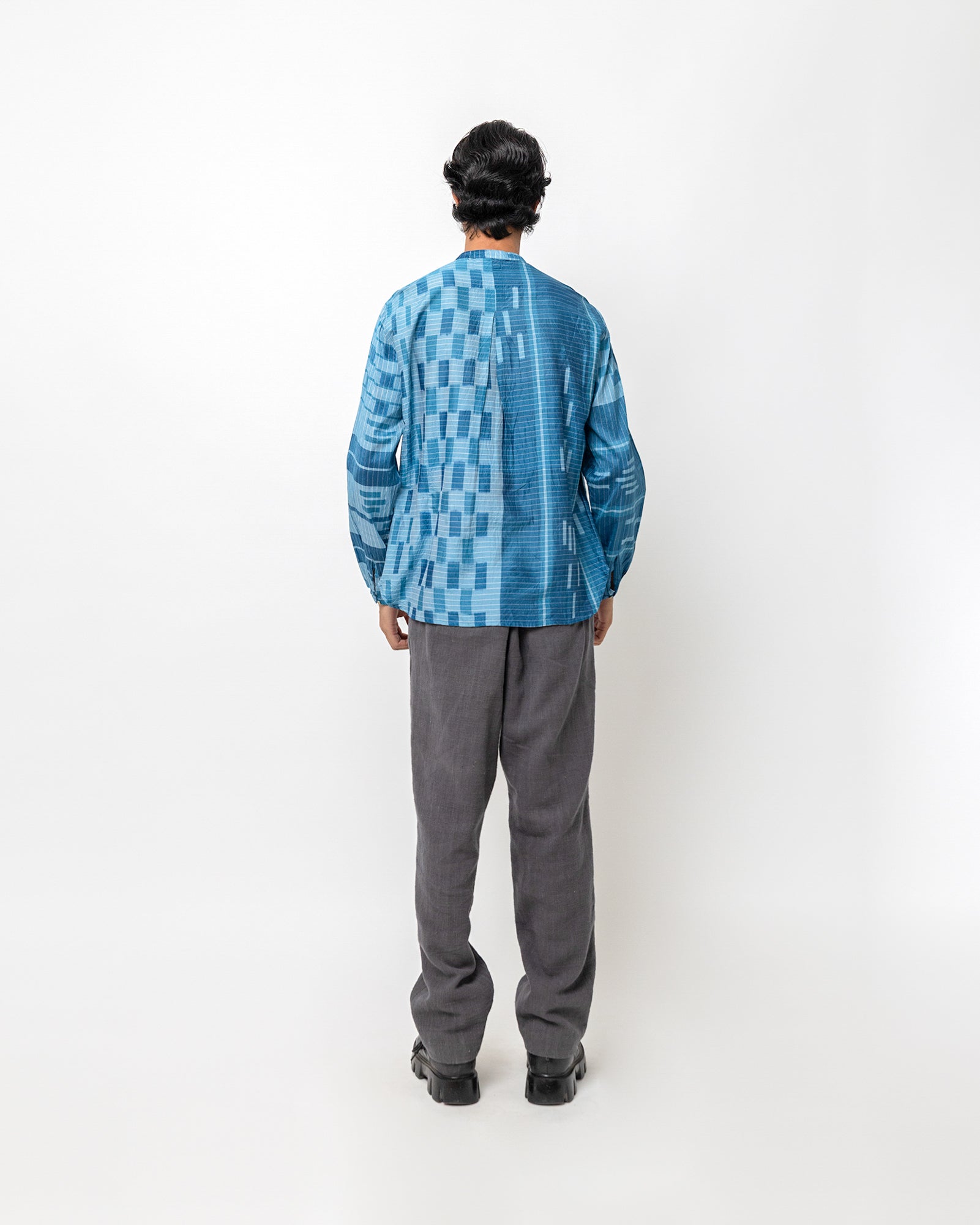 The Taran Shirt crafted in handwoven Ikkat featuring a striking layout of blocks, stripes, and shifting motifs in tonal shades of blue. Designed in a relaxed fit, it includes full-length sleeves, a band collar, and a full button-down front. The curved hem and lightweight drape add ease to the silhouette, while the intricate ikat patterning creates a bold yet refined surface.