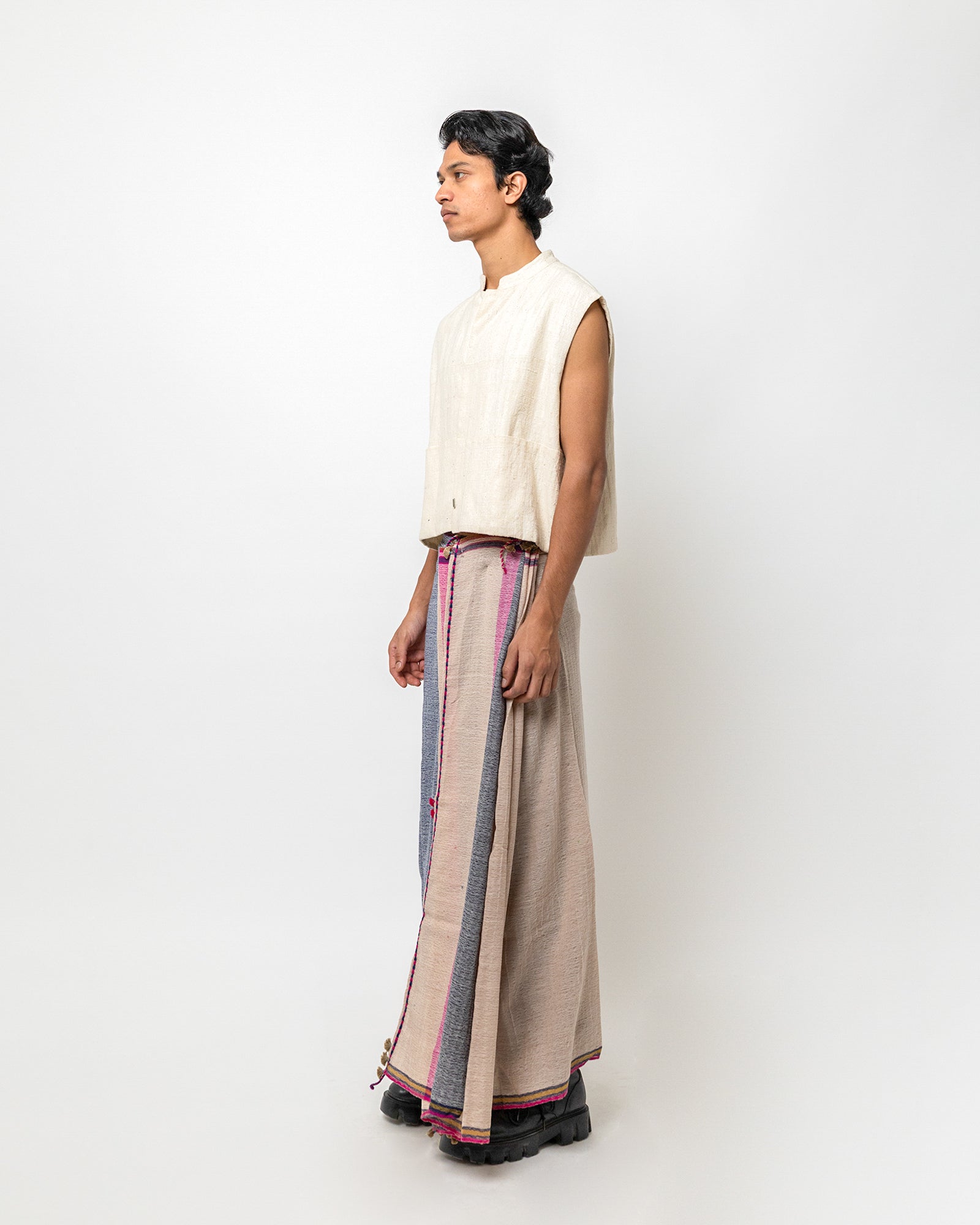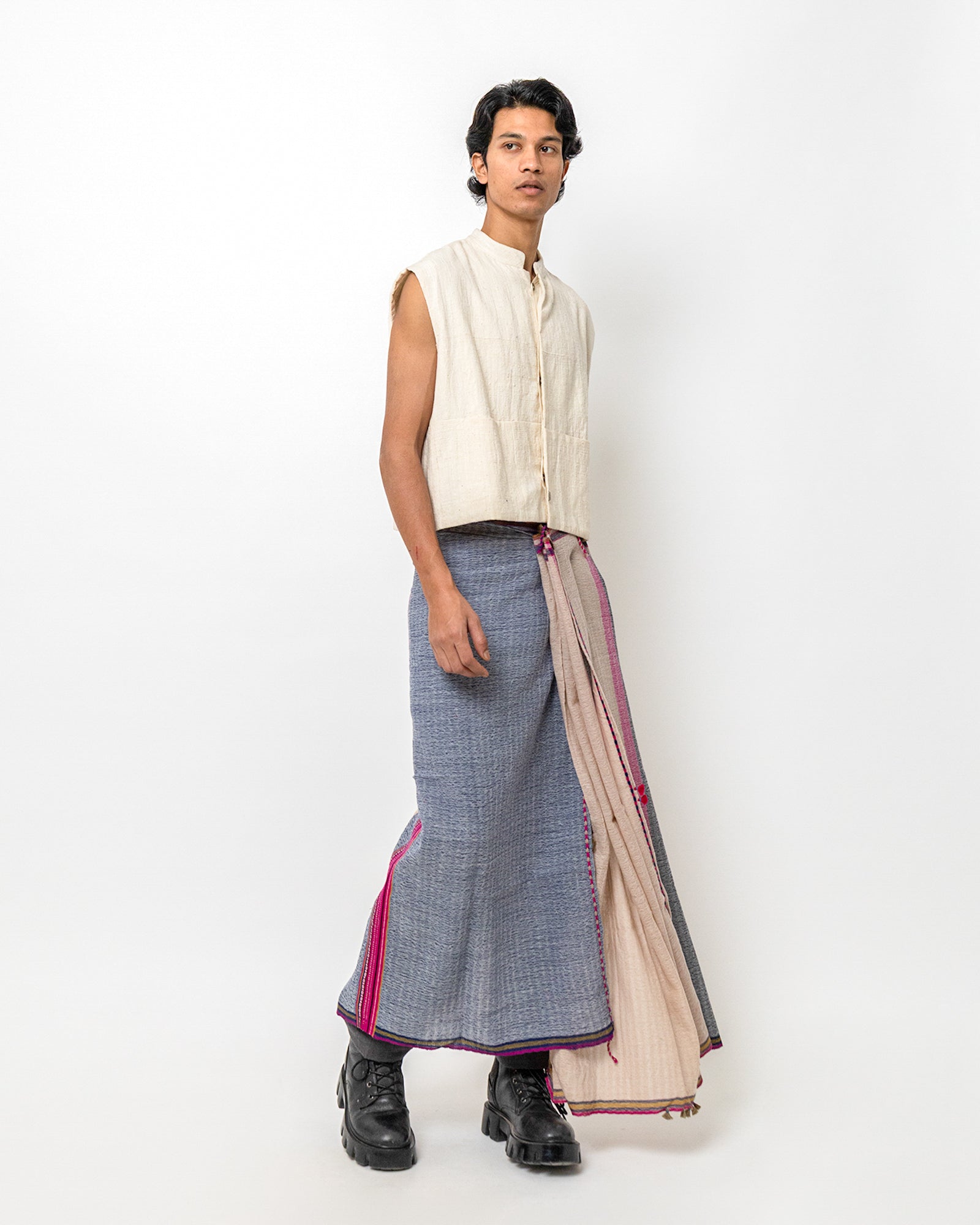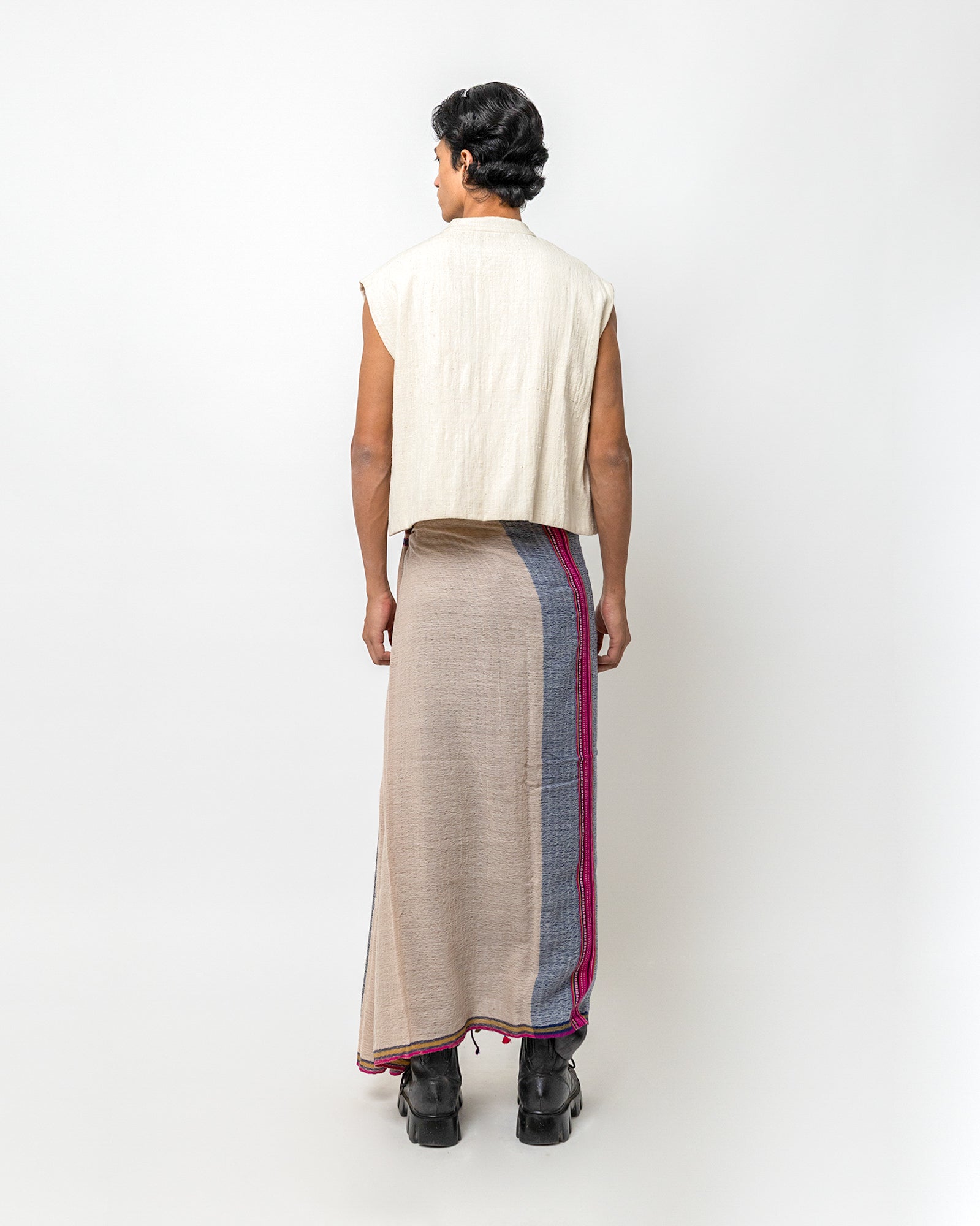 The Tavish Jacket is crafted in handwoven cotton from Gujarat. Designed in a clean, structured silhouette, it features a band collar, a concealed front placket, and two deep front patch pockets. Lightweight and breathable, it layers effortlessly over shirts or kurtas.