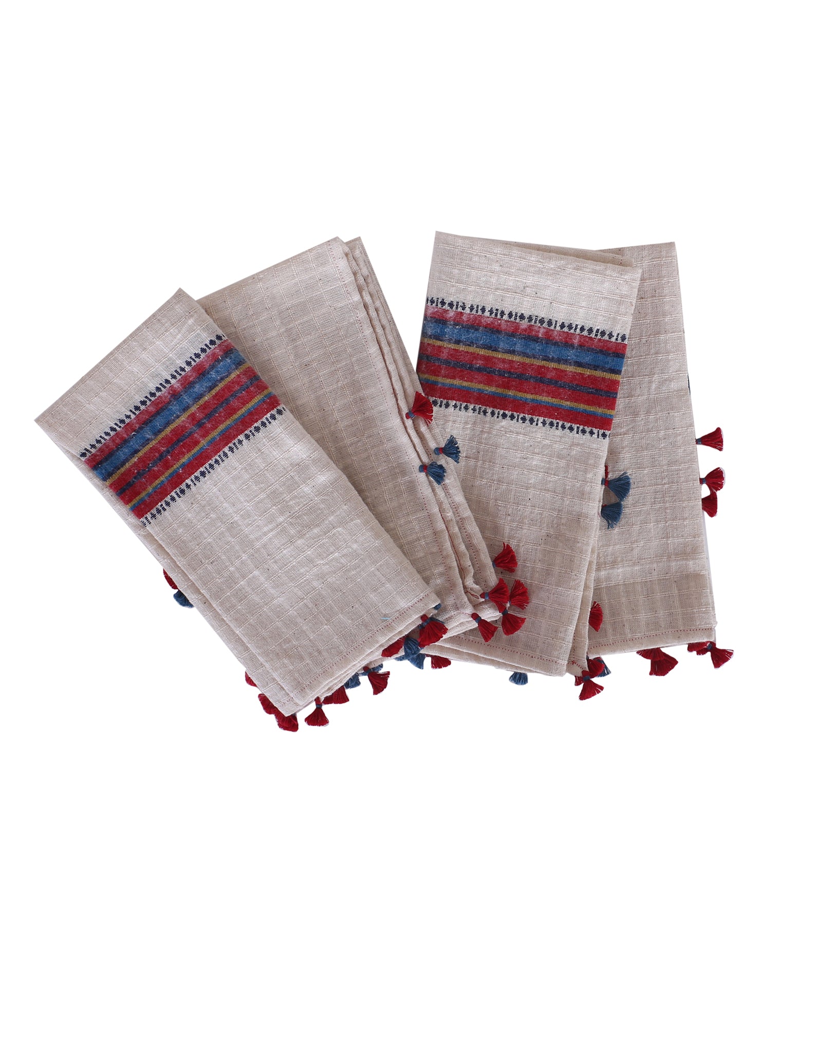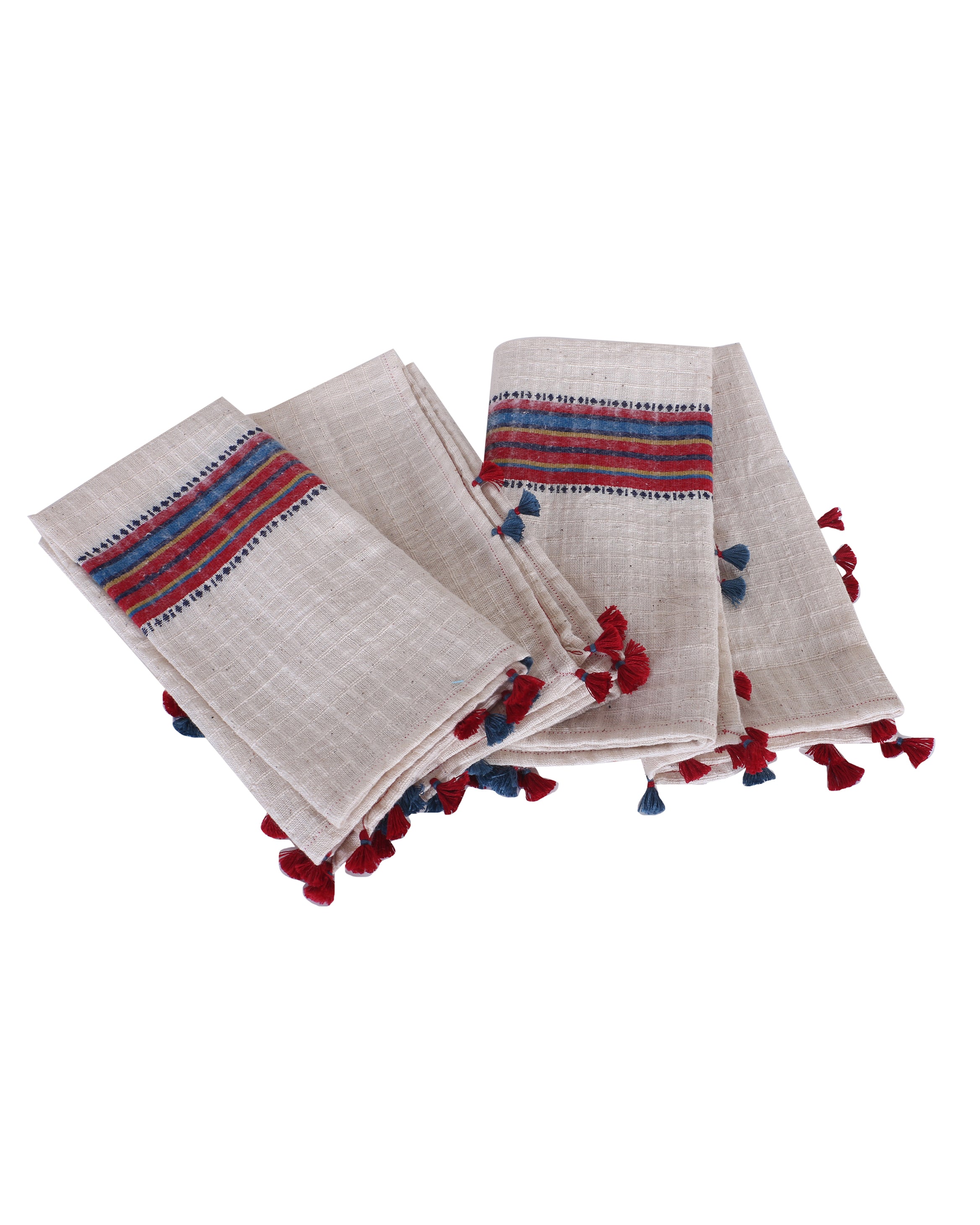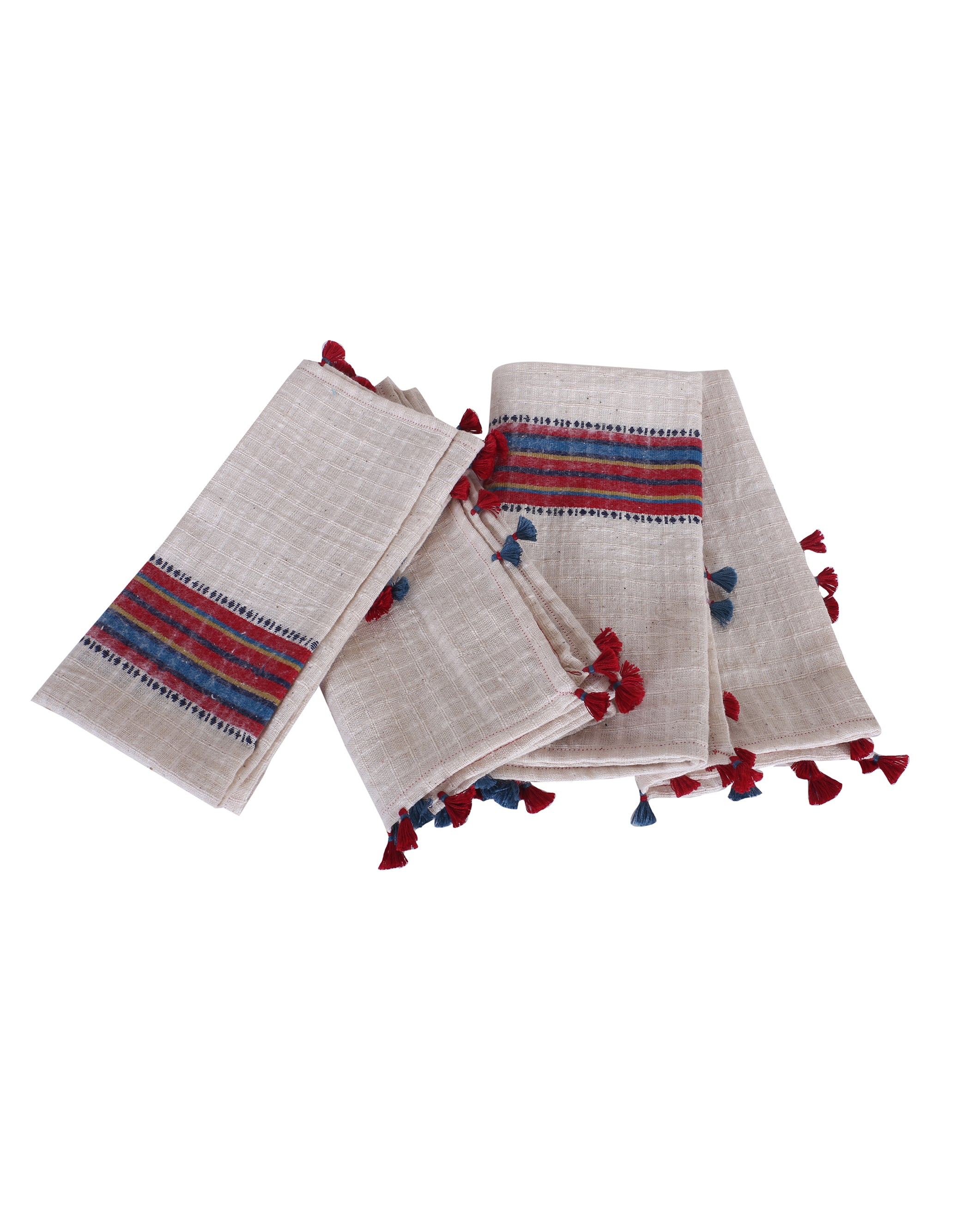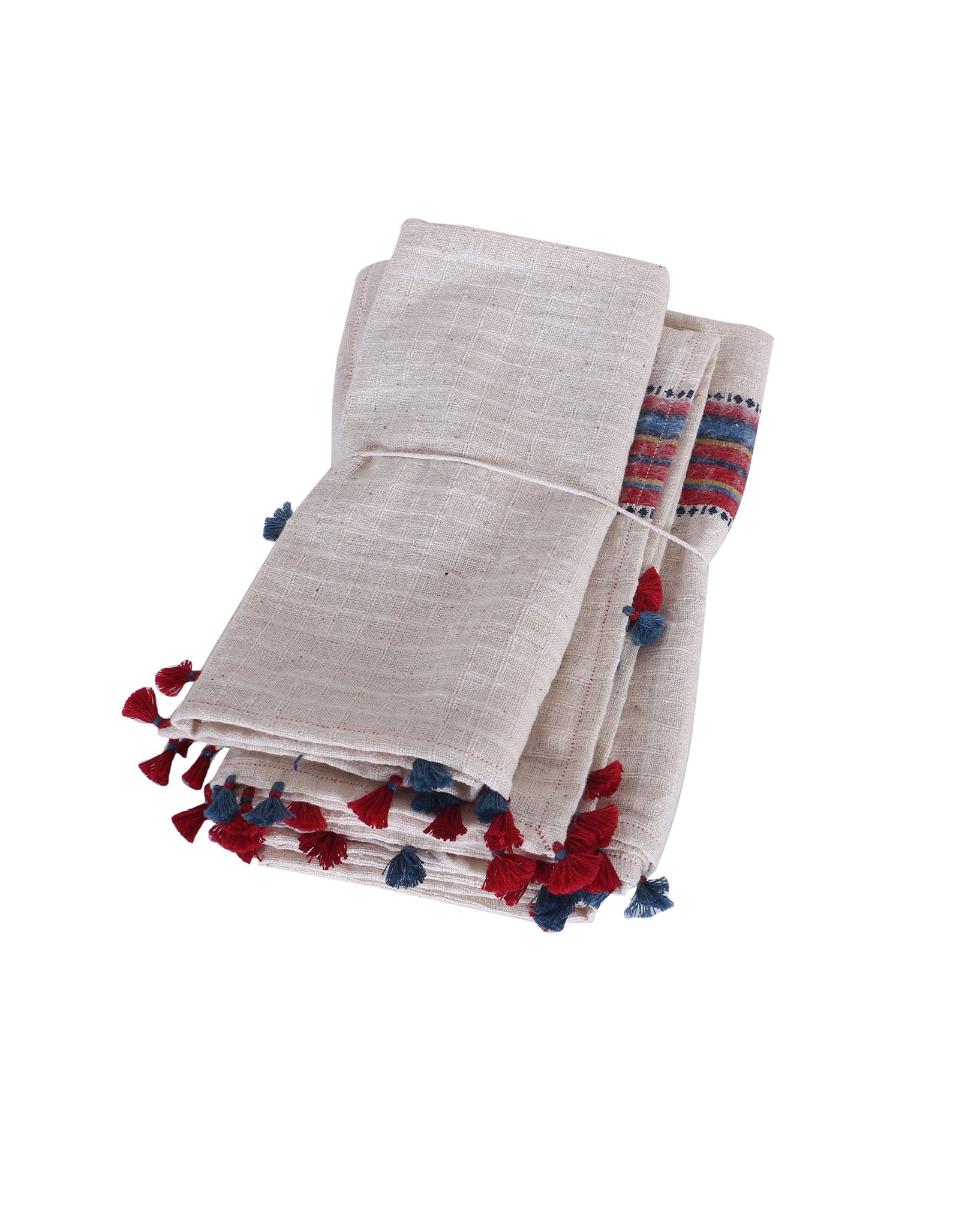 Thathera' coasters are a beautiful blend of function and tradition, woven in pure cotton using the Bhujodi technique. The coasters feature charming tassel edges, making them a fun yet elegant addition to your home. Lightweight and durable, they are perfect for use on any table, offering both protection and style. For an easy, stylish look, pair these coasters with a wooden tray and simple glassware. They also look stunning when combined with earthy tones or contrasting patterns.