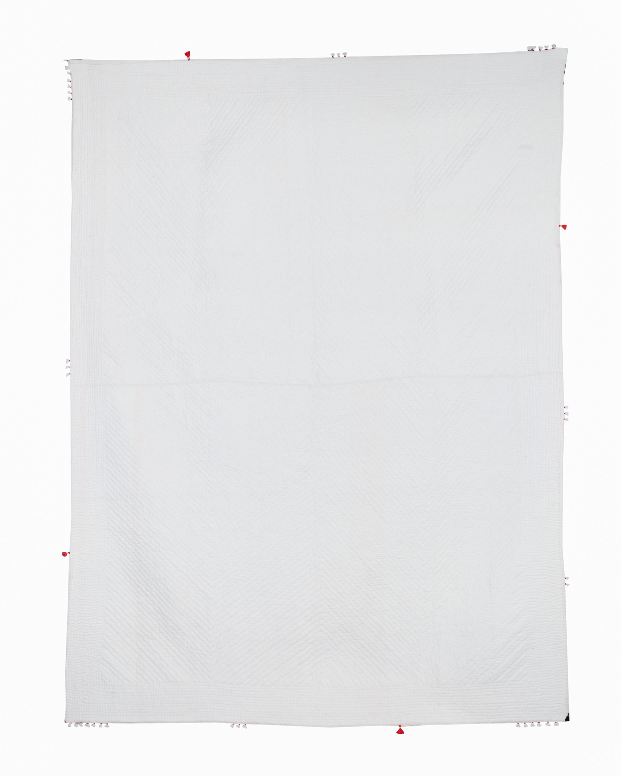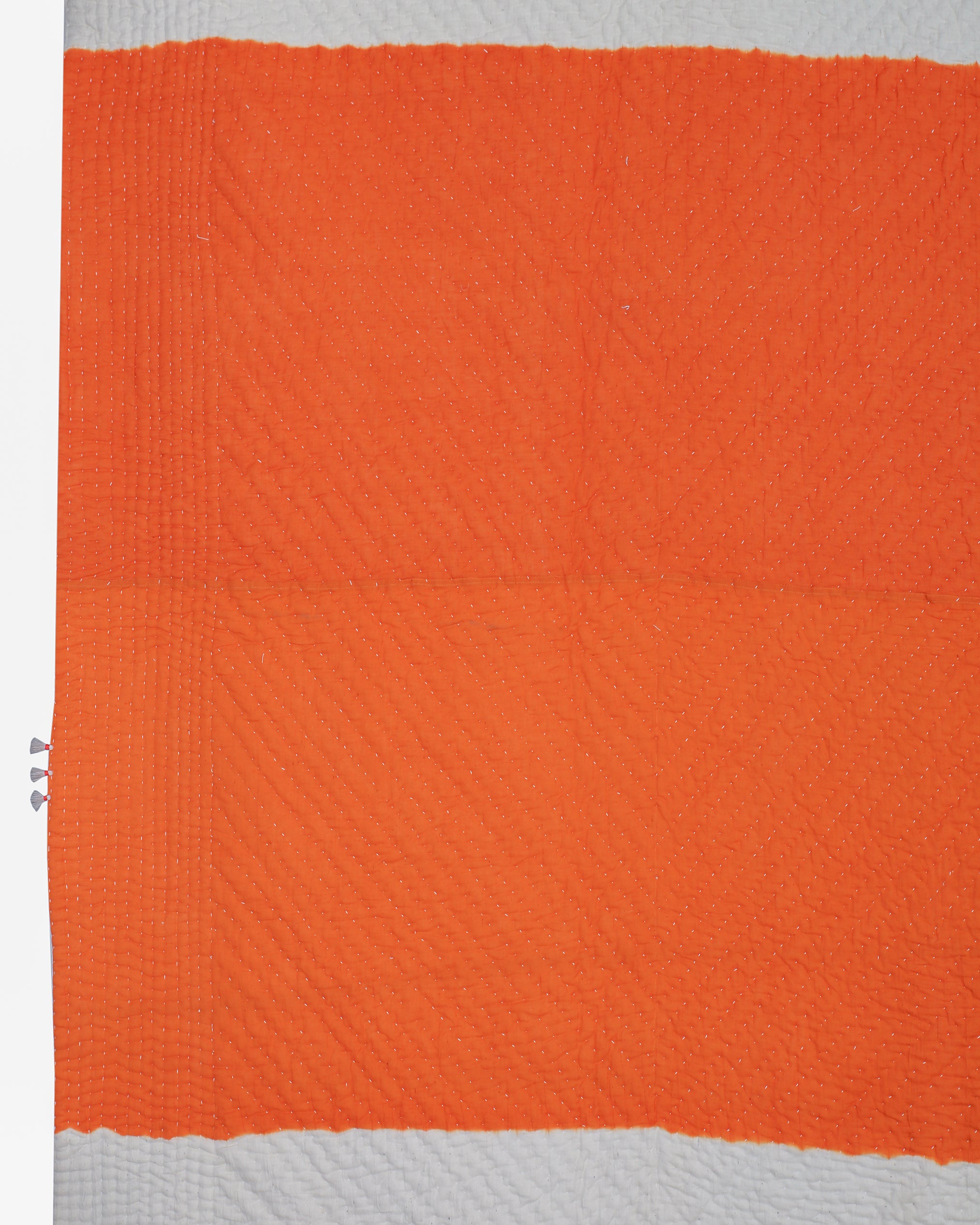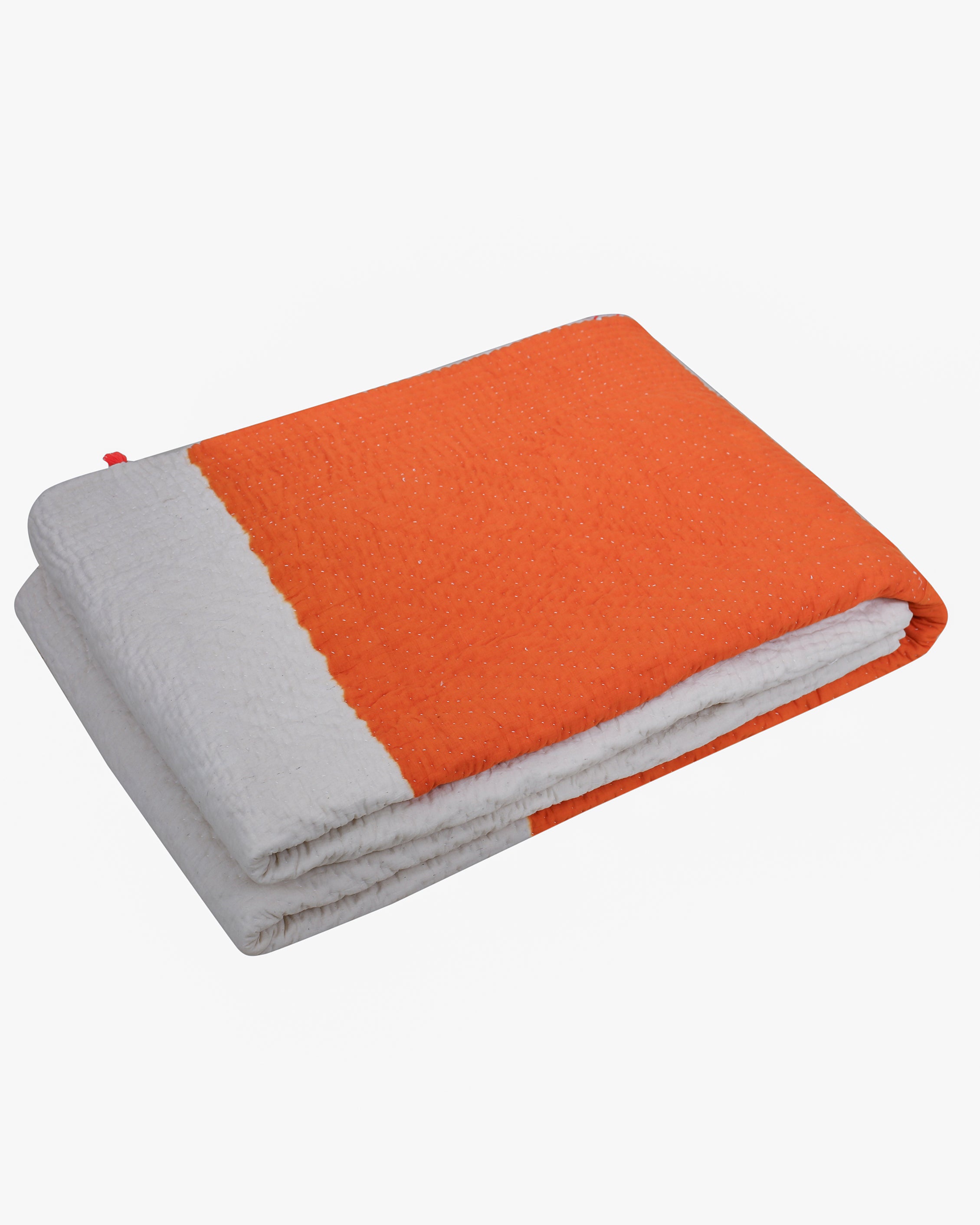 Clamp-dyed quilt, is the perfect addition your bedroom with a fun and playful twist. This 'Tinkaa' quilt features a bright orange dyed base in the centre, with subtle beige shade above and below it. Fruthermore, tagai embroidery has been done over it to create beautiful texture. Lastly, the addition of hand-tied tassels beautifies it even further. If you're an enthisiast of vibrant home decor, this piece is just for you.