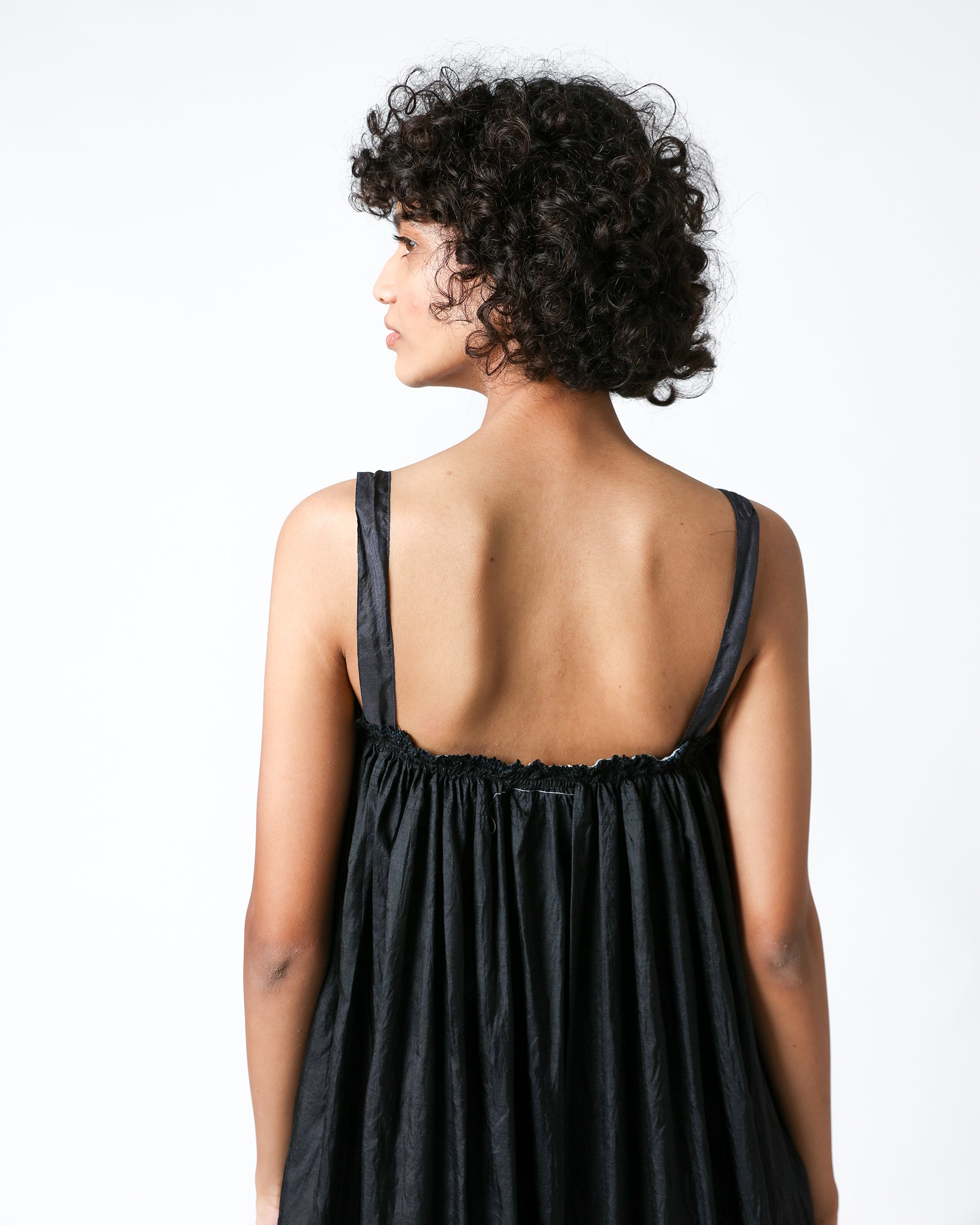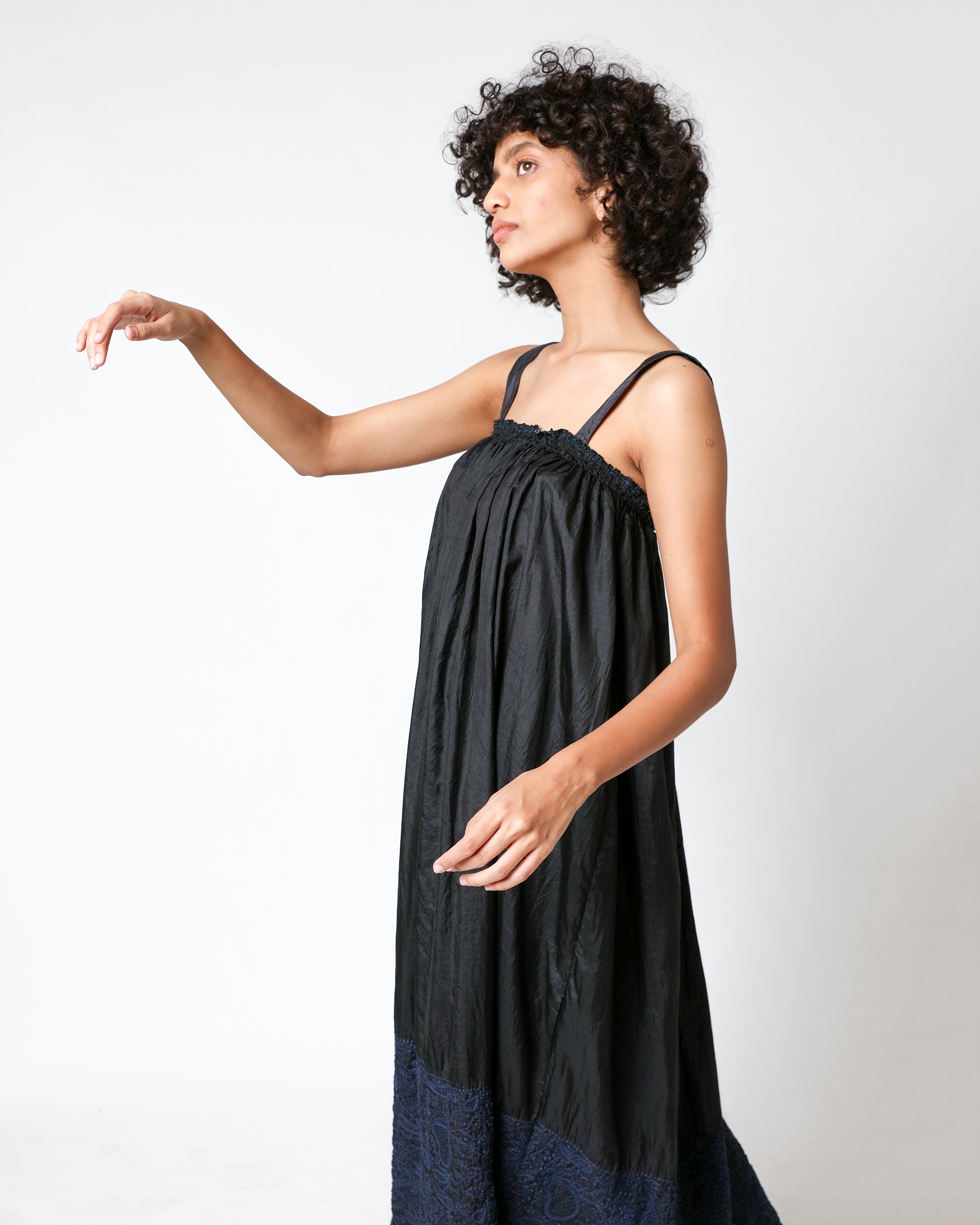 Tundra Slip Dress in black silk, hand-embroidered in Lucknow. It features a structured ruffled square neckline with soft shoulder straps. A comfortable, flowing silhouette makes it an effortless statement piece.