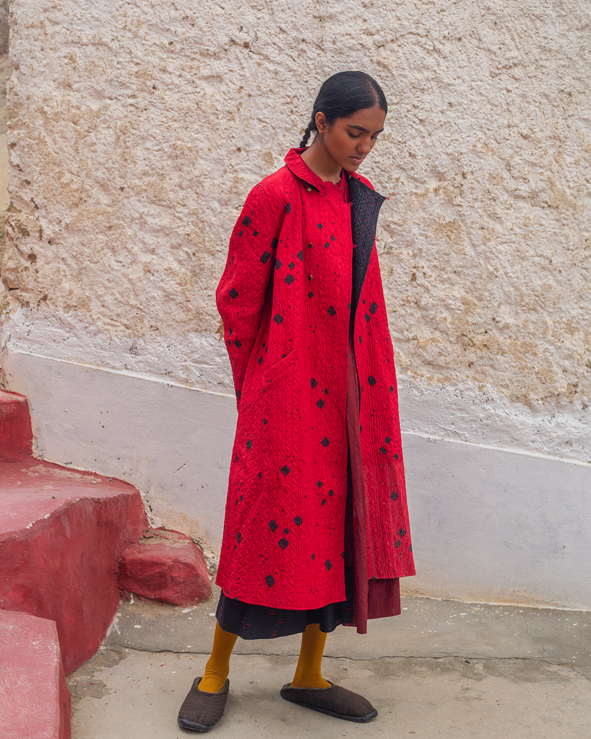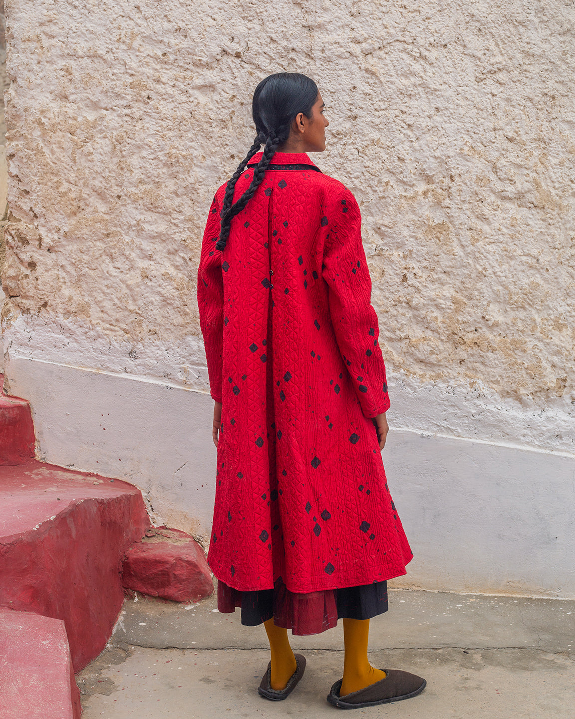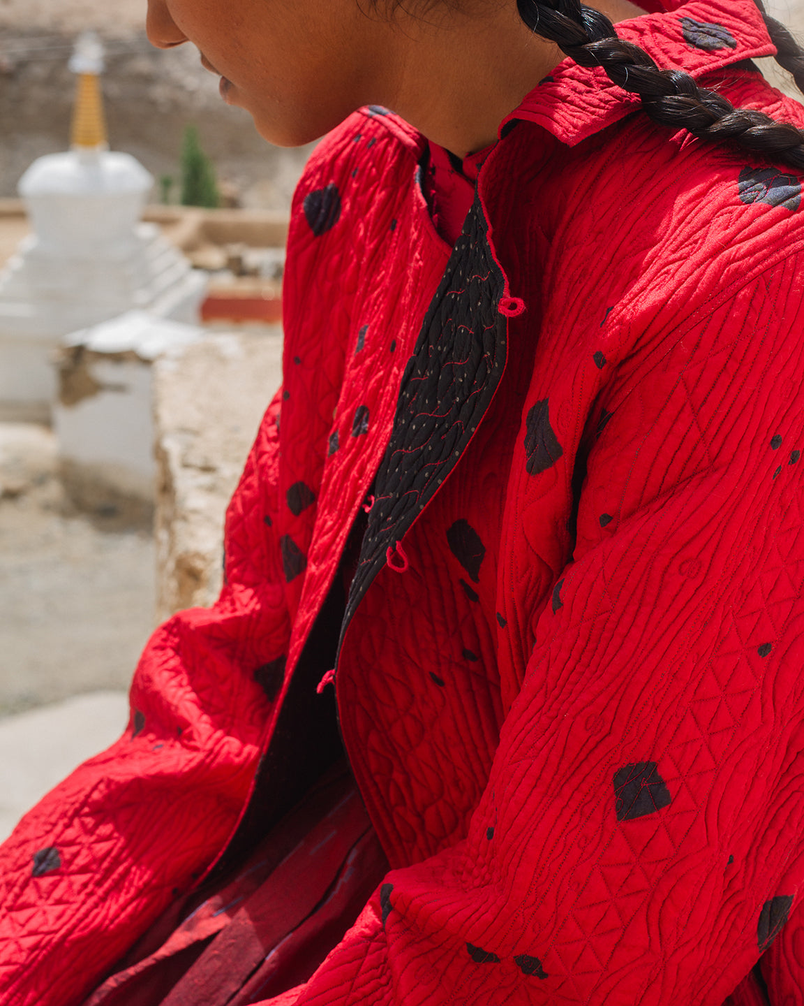 Turtuk Jacket in red silk, adorned with tie-dyed black bandhani dots and detailed with Tagai stitching all over. It features a shirt collar, structured silhouette, functional side pockets, padded construction, and a comfortable, effortless fit. The black polka-dotted silk lining adds a subtle, stylish surprise when worn open.