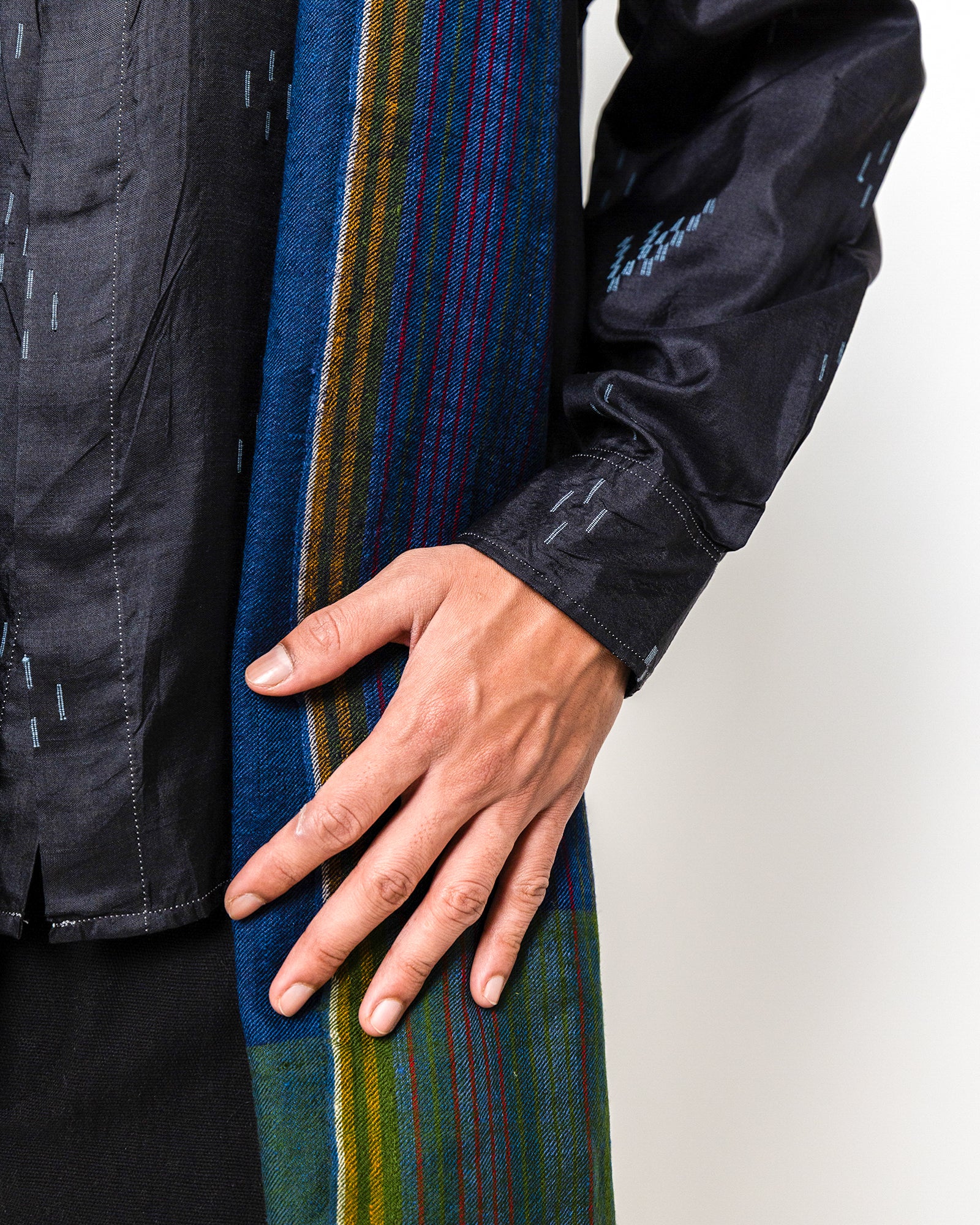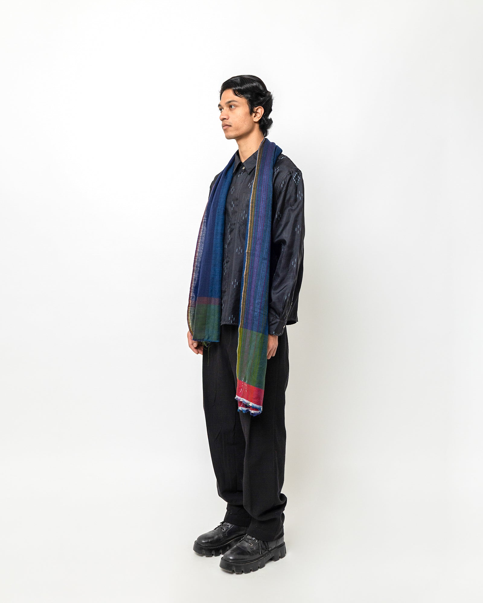 The Varun Scarf made in soft, lightweight cashmere wool and woven in deep indigo tones, with green and maroon borders. Subtle gradations in color add quiet depth to the surface. Its long rectangular form drapes with ease—worn as a shawl, layered over winter dressing, or wrapped for added warmth and texture