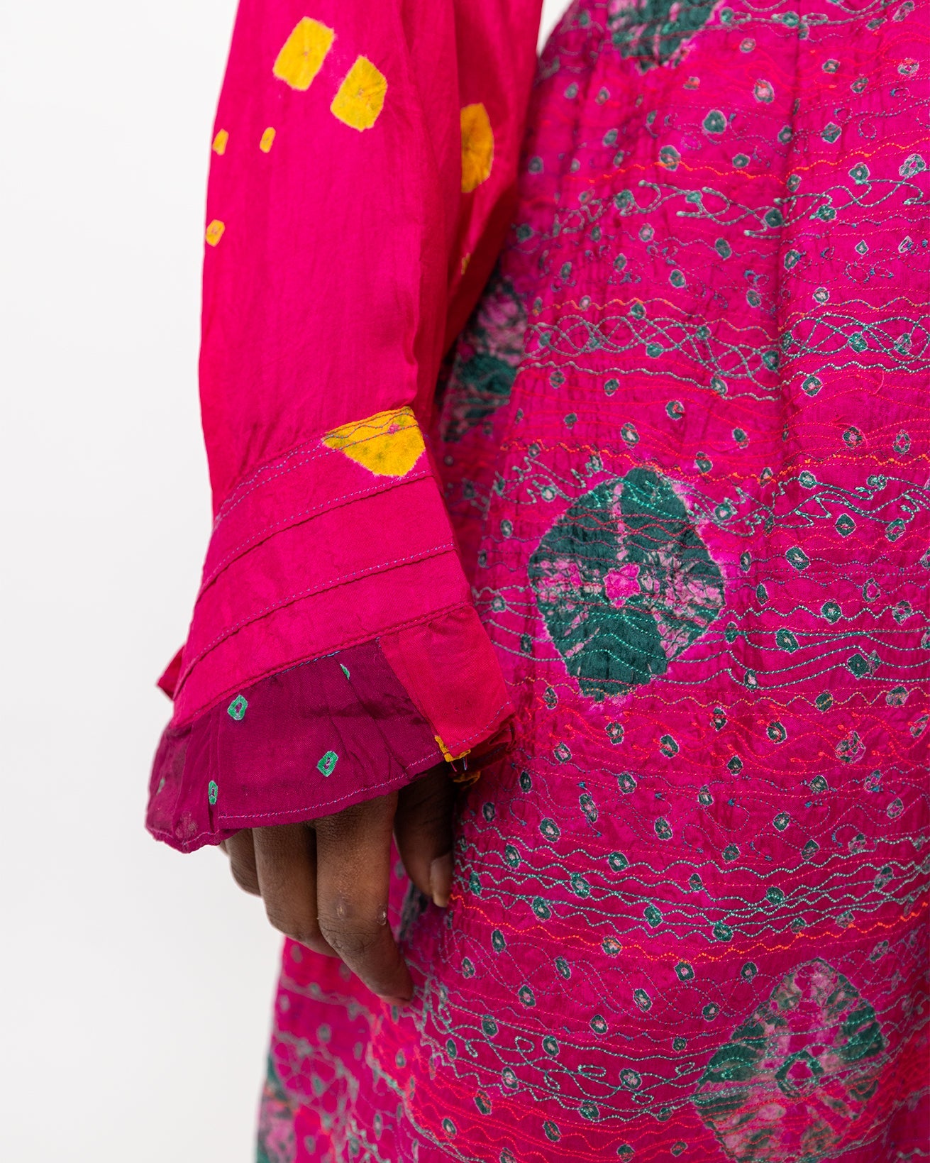 The textile is tie-dyed in Gujarat using Bandhani technique