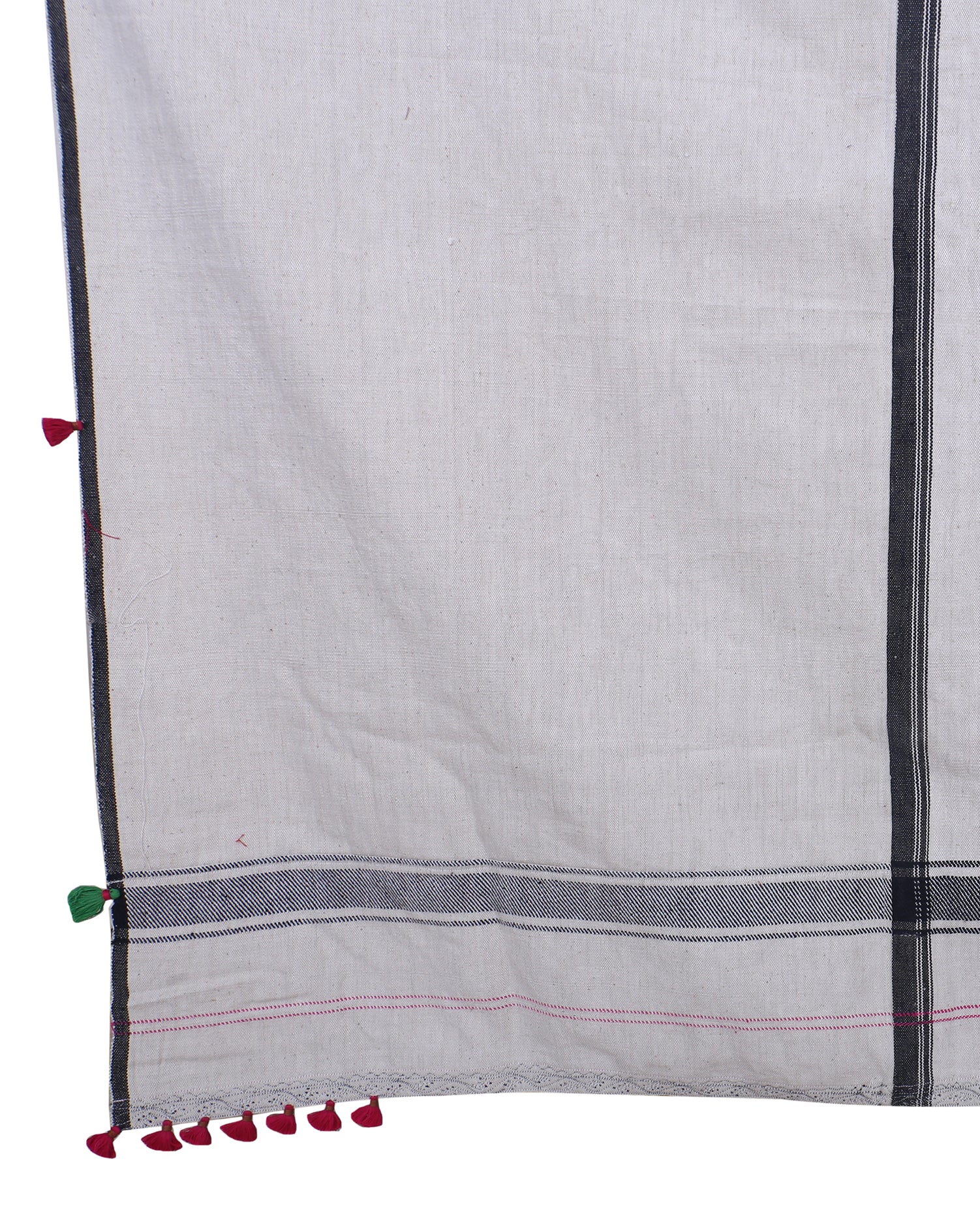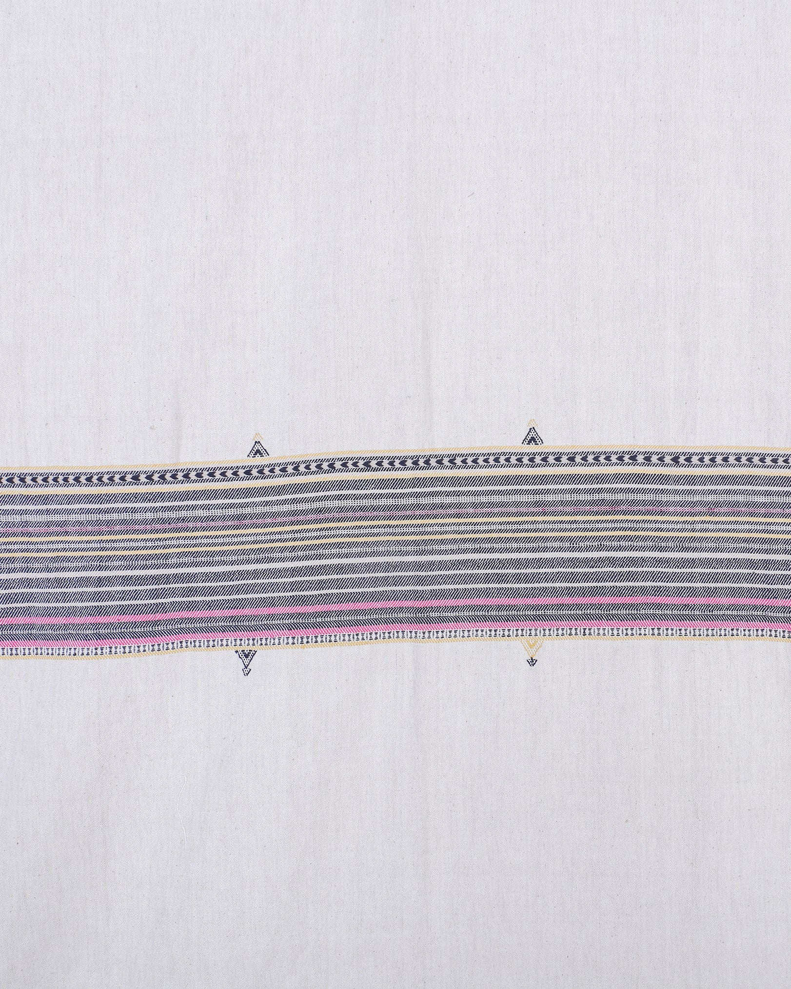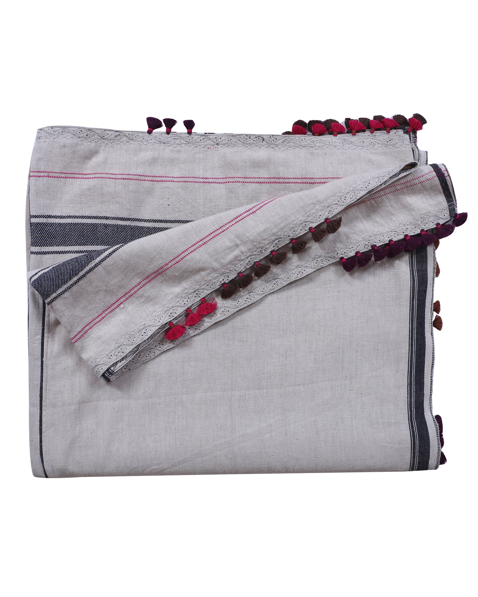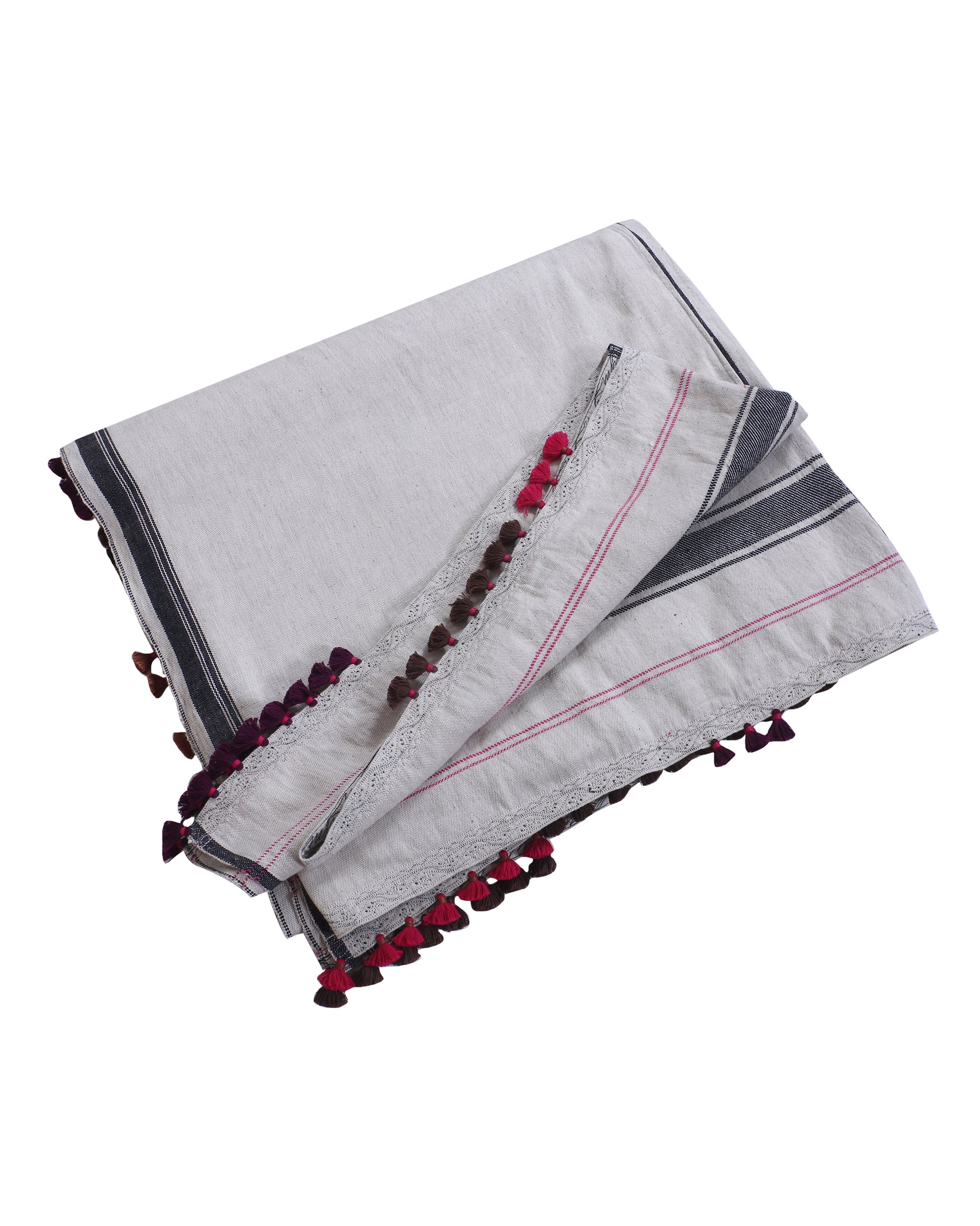 The boldness of stripes meets the softness of tassels in this 'Vasi' Bhujodi bedcover, crafted from pure cotton. A piece that bridges functionality with heritage, the bedcover is adorned with geometric bhujodi motifs that are structured and speak of the Gujarat's percious craftsmanship.