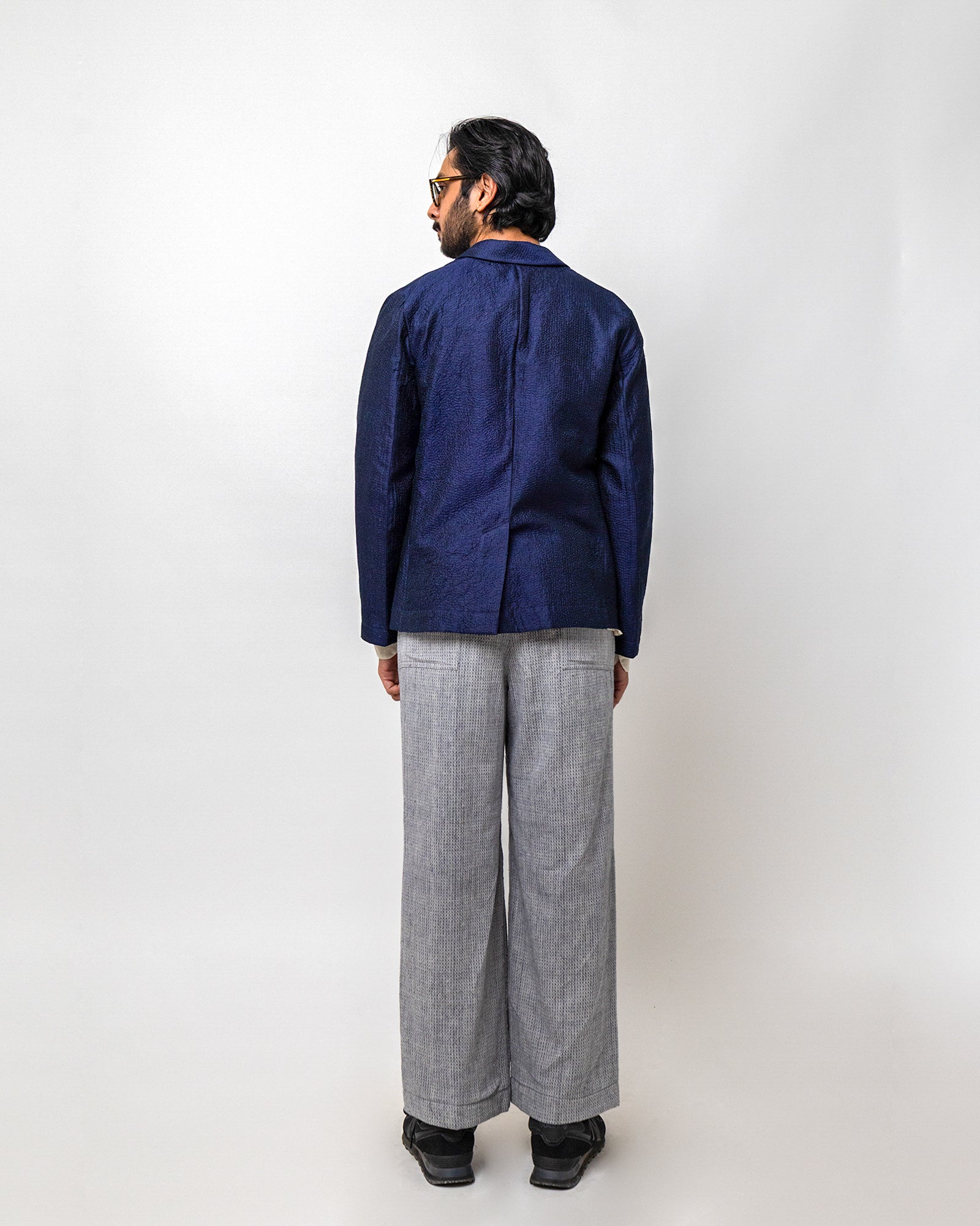 The Vayod Jacket is crafted in silk with kantha embroidery. Designed with a classic notch collar and patch pockets, it carries a refined structure while remaining lightweight and easy to wear. The deep indigo tone highlights the subtle texture of the stitches. Tailored for a relaxed fit.