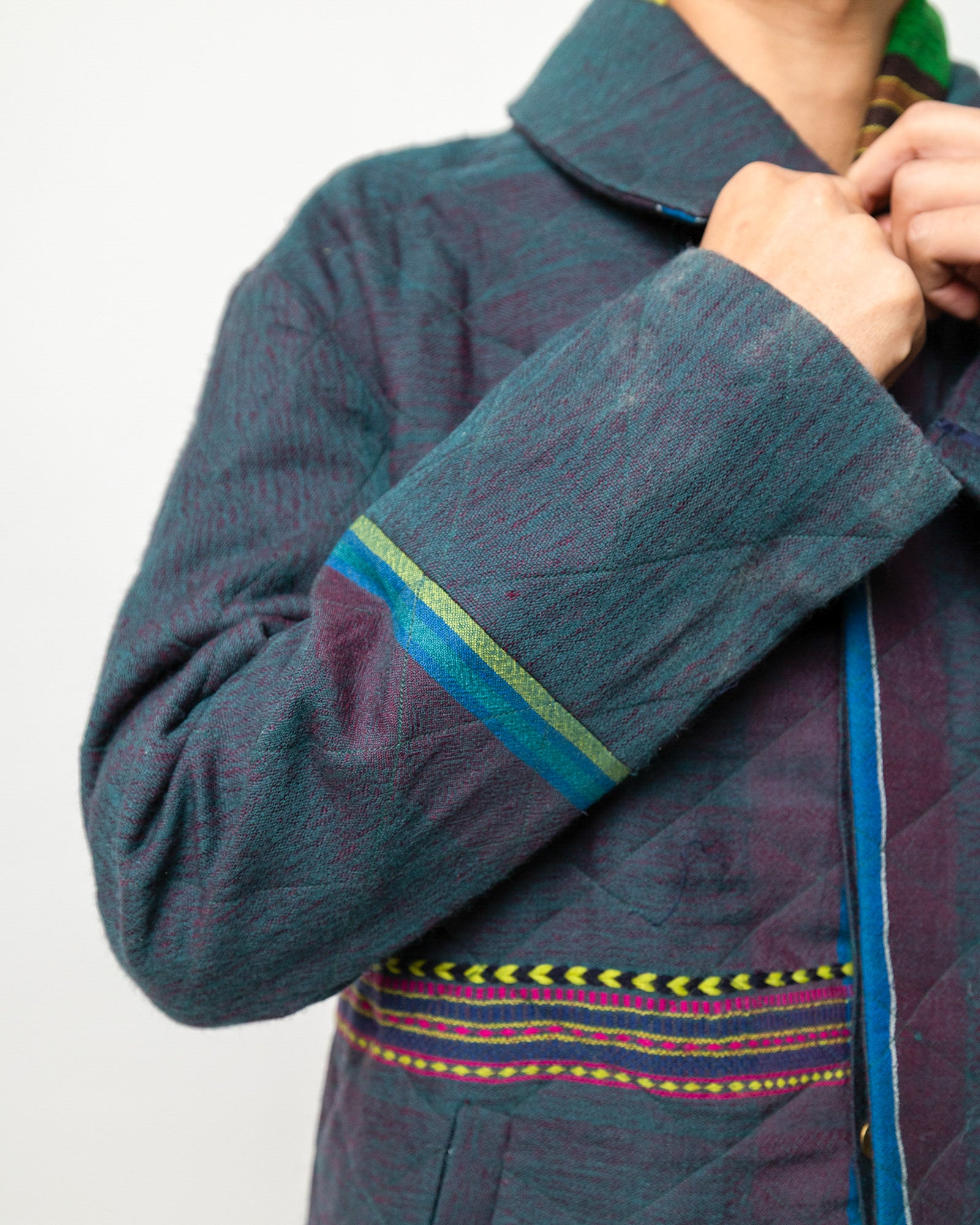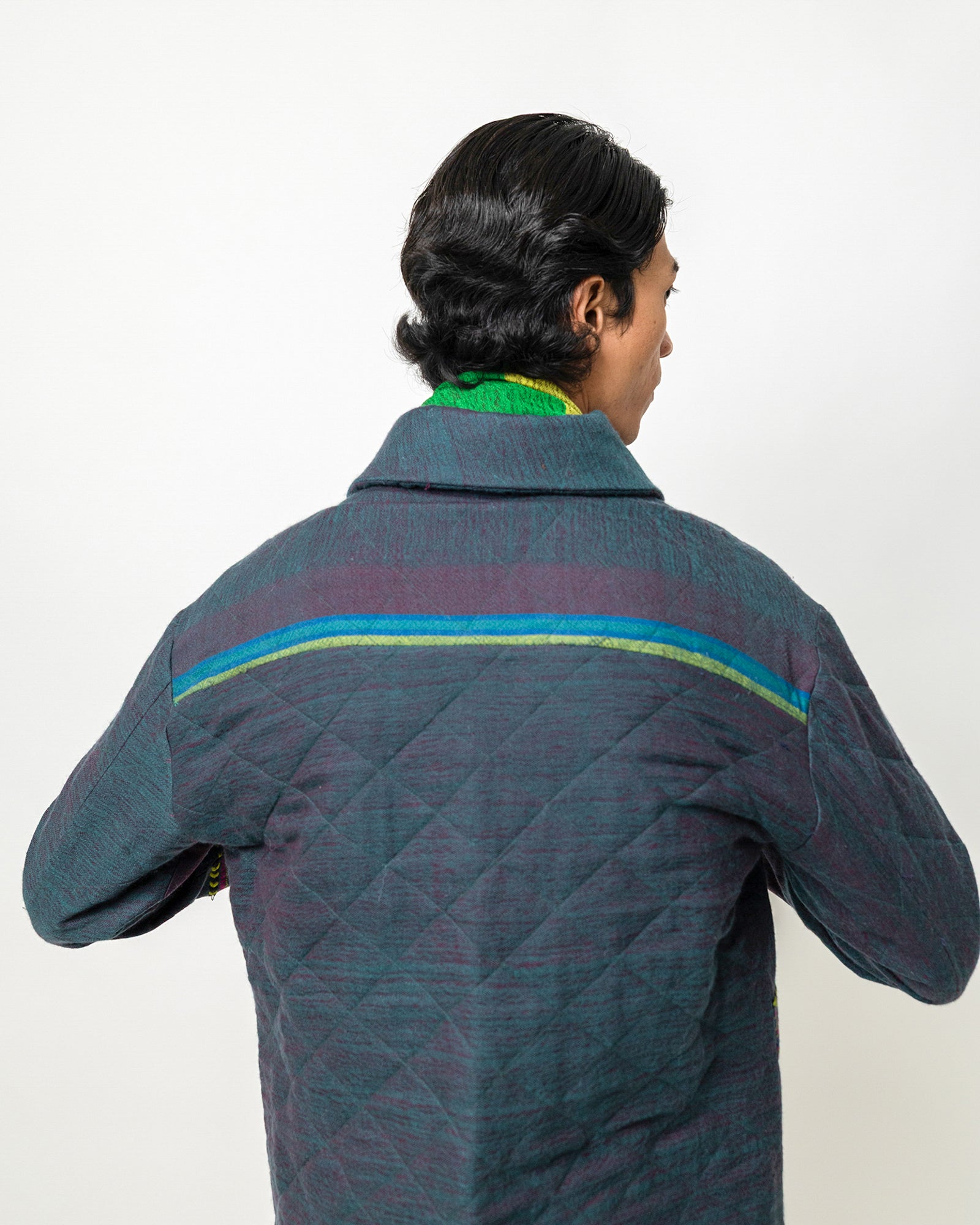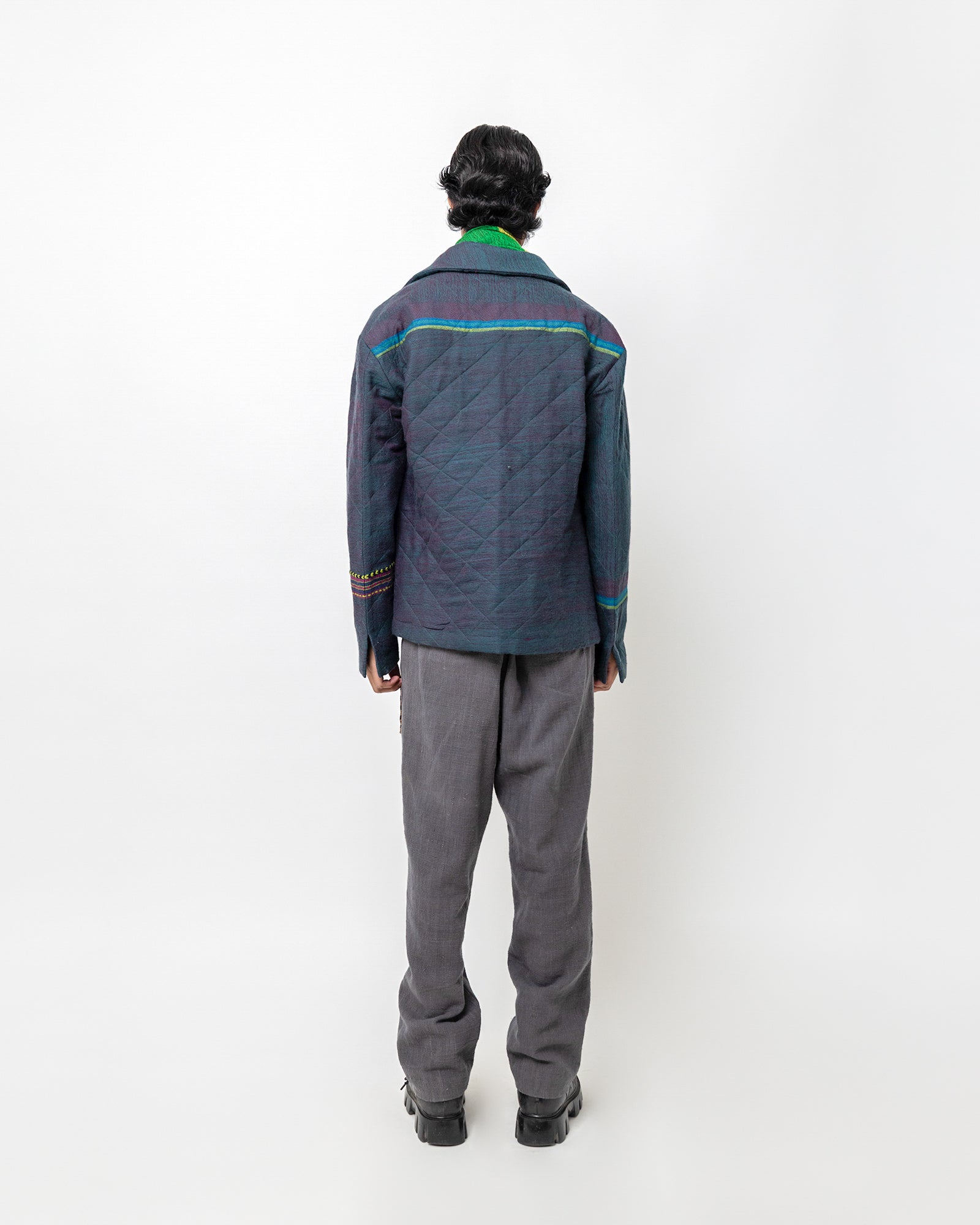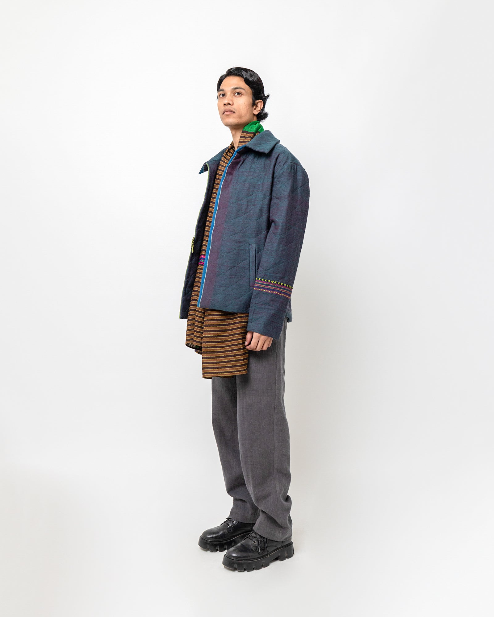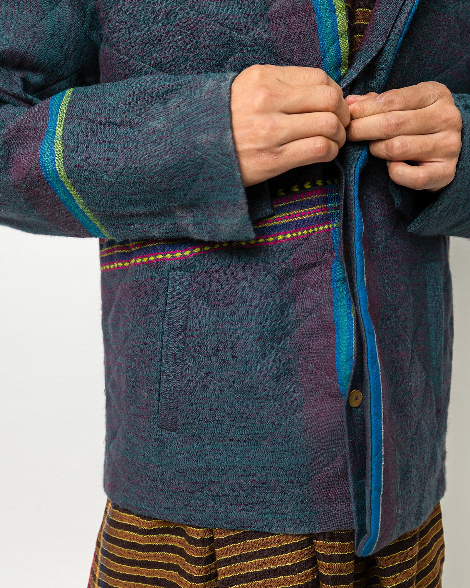 The Vihaan Jacket is crafted in handwoven wool from Gujarat, featuring a rich, textured surface with subtle geometric patterning. Designed in a relaxed tailored fit, it includes a wide collar, a concealed button placket, long sleeves, and two welt pockets. Accented with woven color bands across the front and sleeve, the jacket blends traditional Gujarat weaving with a modern, structured silhouette. Warm, refined, and artisanal, it brings a contemporary edge to classic menswear craft.