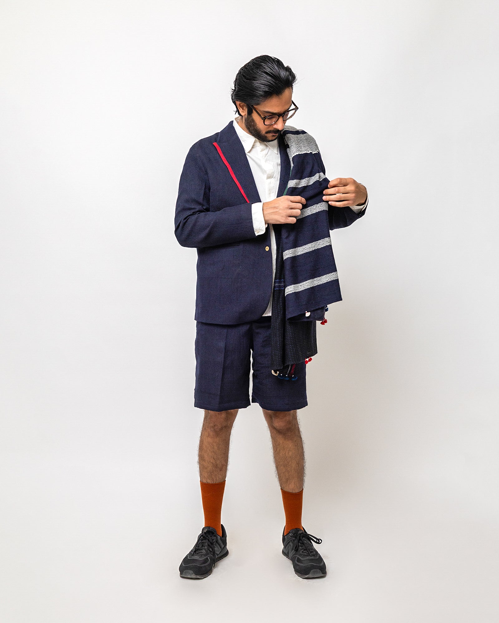 The Vihan Scarf is made in handwoven wool from Gujarat. Featuring alternating navy and natural stripes with subtle woven motifs, this lightweight scarf is soft, breathable, and designed for effortless layering.