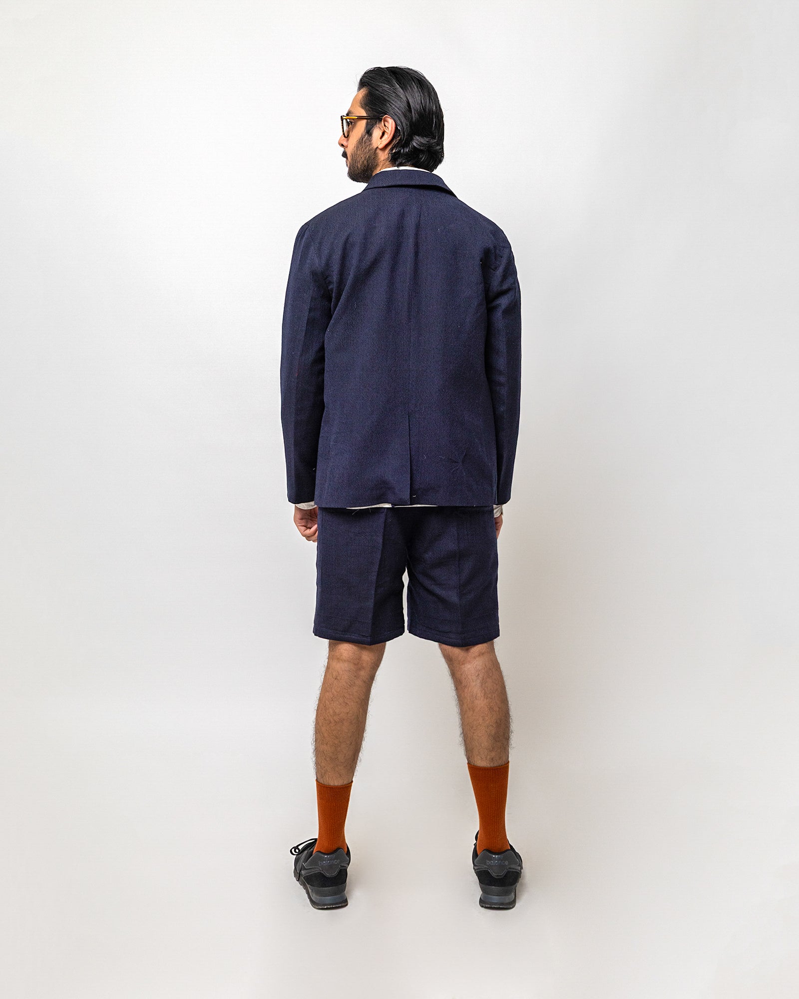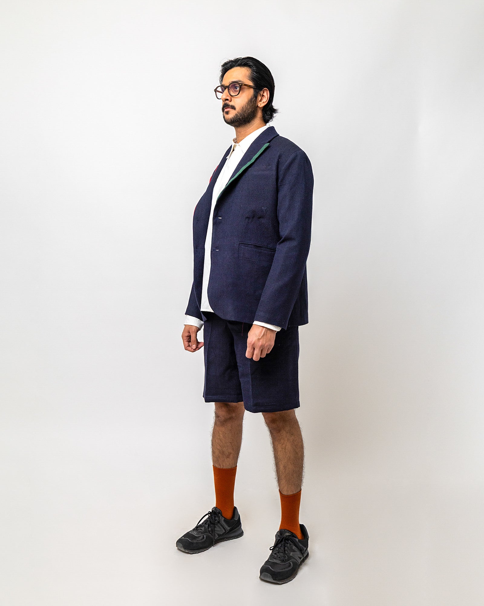 The Yugam Jacket is crafted in handwoven wool from Gujarat, featuring a deep navy tone with a subtle textured surface. Cut in a relaxed tailored silhouette, it includes a classic lapel, welt pockets, and contrast colour detailing along the inner collar for a quiet, refined accent. Lightweight yet structured, the jacket is designed for effortless layering.