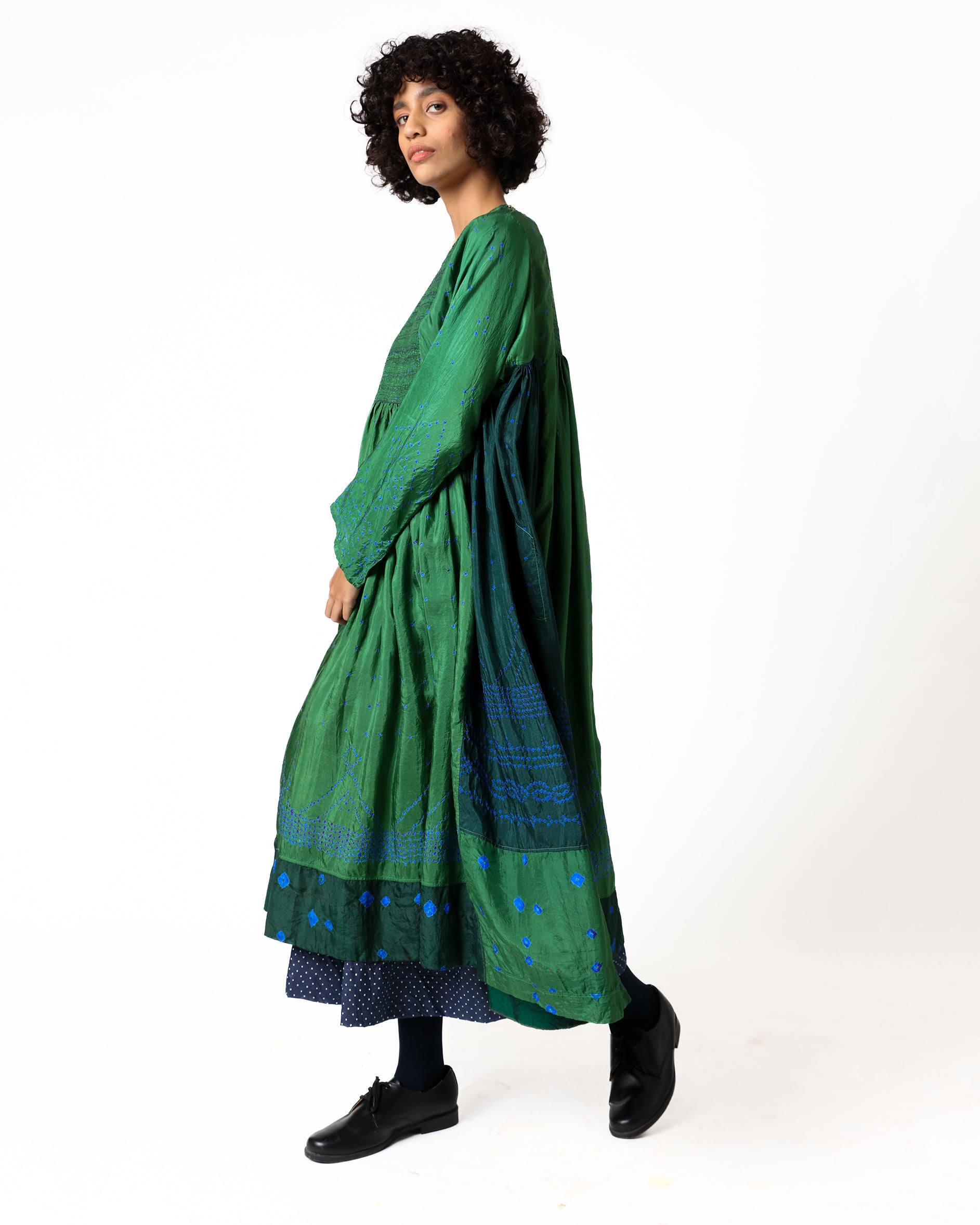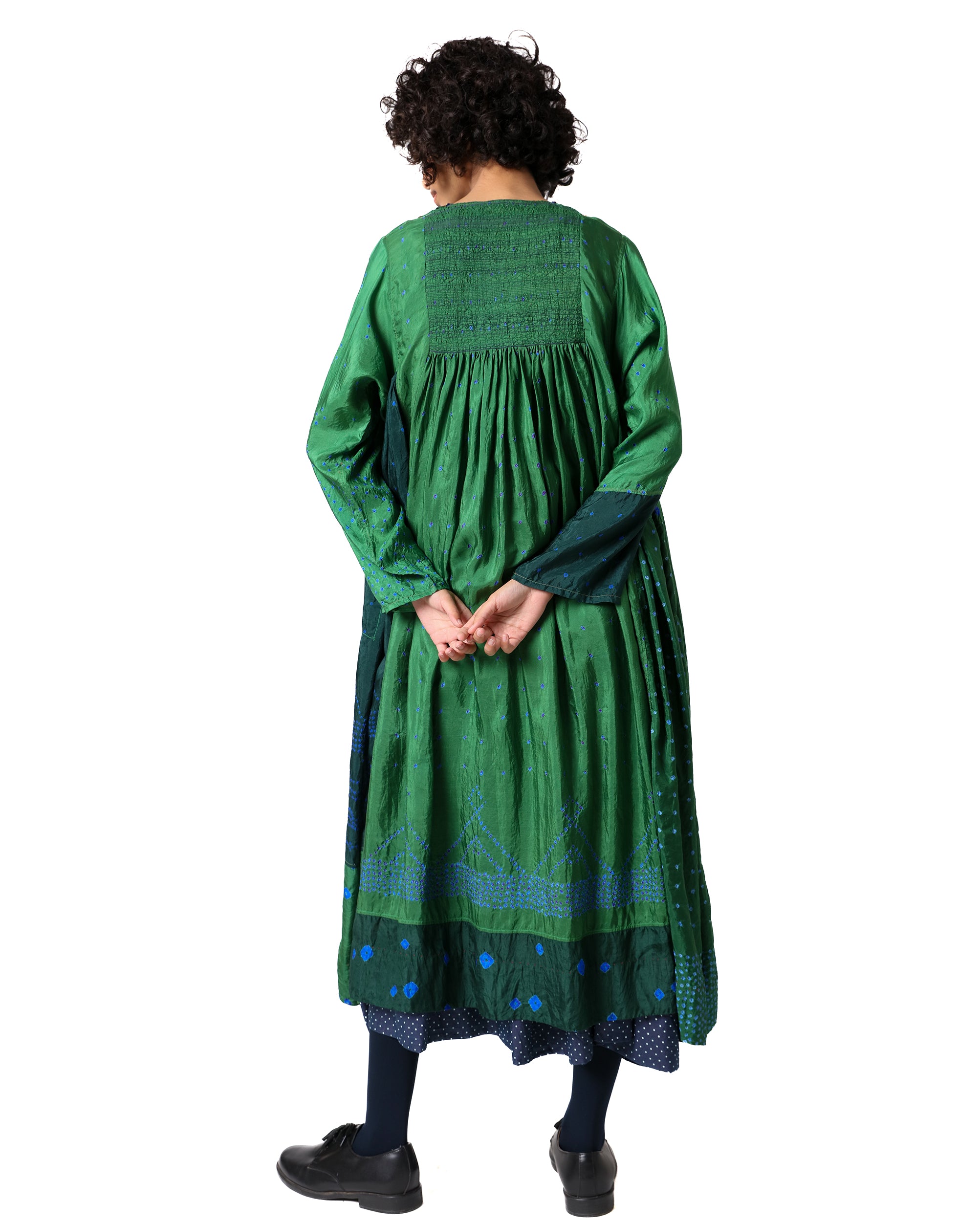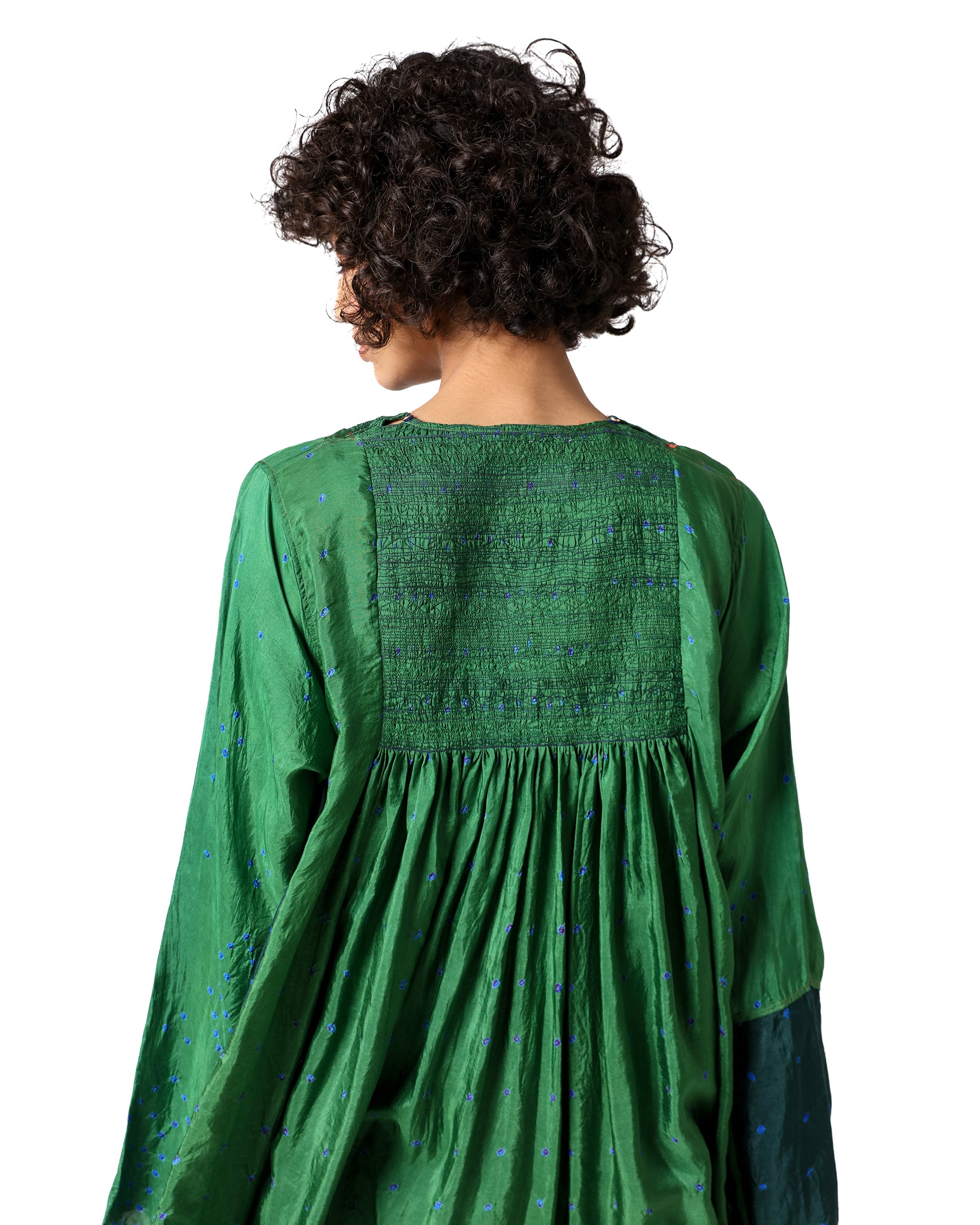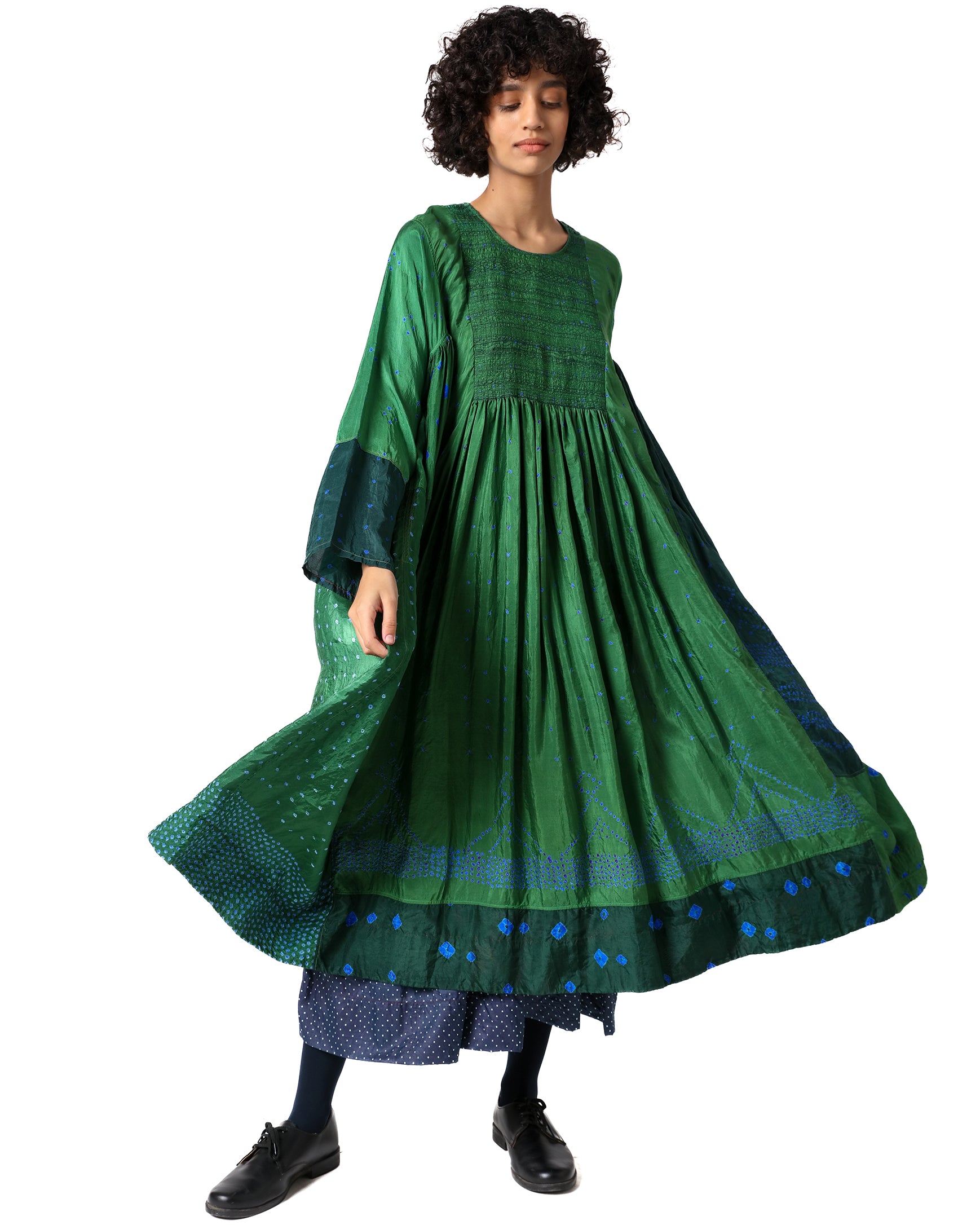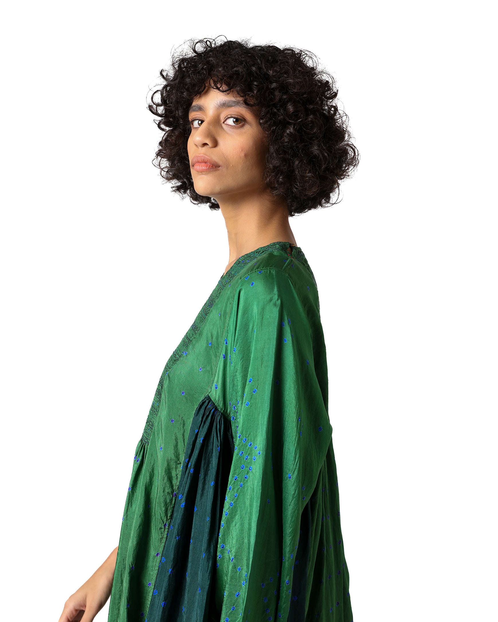 Inspired by nature’s many hues, Zanskar dress is a celebration of green in its most refined form. Crafted in pure silk, it showcases various shades of green and intricate bandhani dots arranged in a rhythmic composition. The tagayi embroidery on the yoke adds a handcrafted touch, while the small round neckline, A-line sleeves, and gathered detailing at the waist create a flowing, comfortable silhouette.